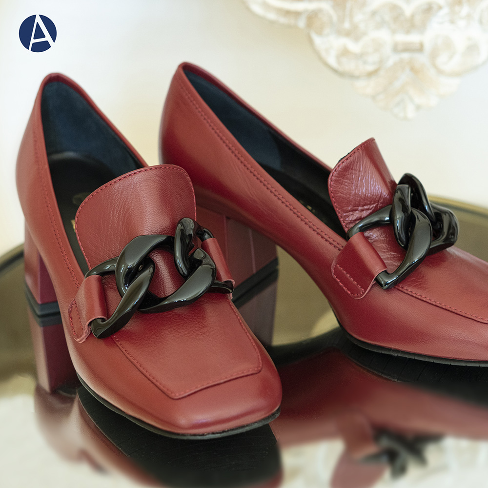 Attili donna in nappa rubino con accessorio black, tacco largo 5 cm e fondo di gomma. Una calzatura artigianale dallo stile inconfondibile !