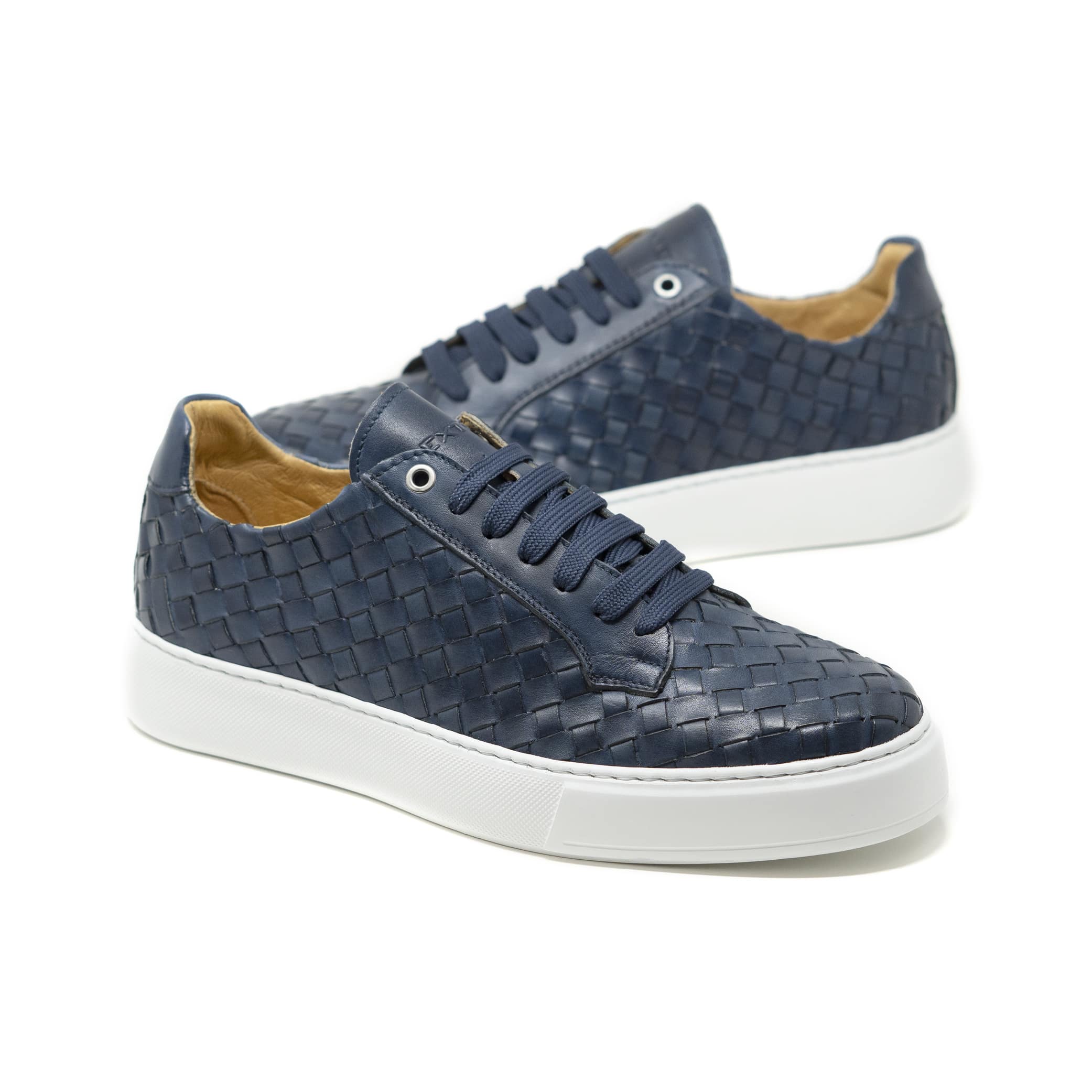 Sneakers Exton uomo in pelle colore cuoio intrecciata con lacci marroni e fondo a cassetta. MADE IN ITALY 100%.