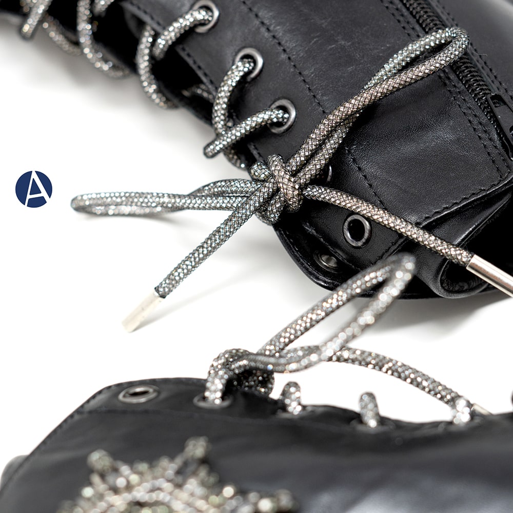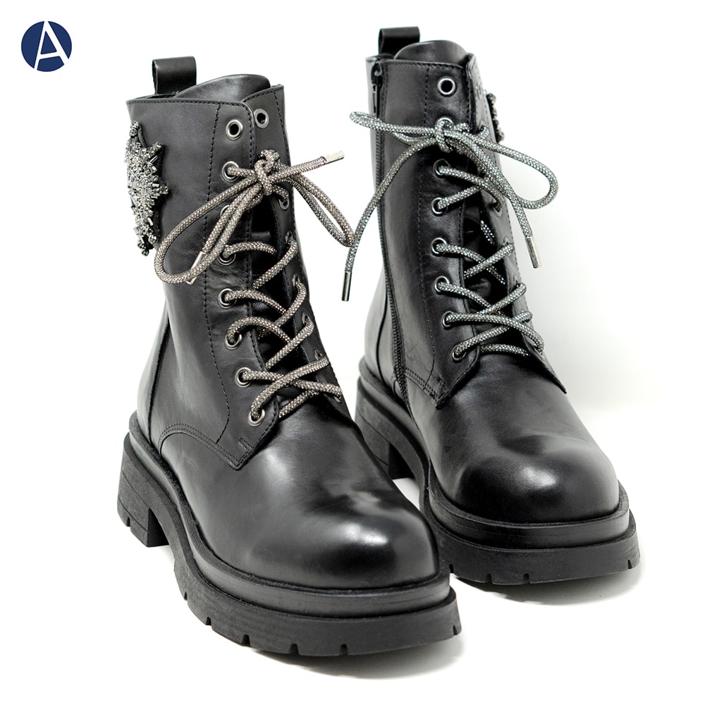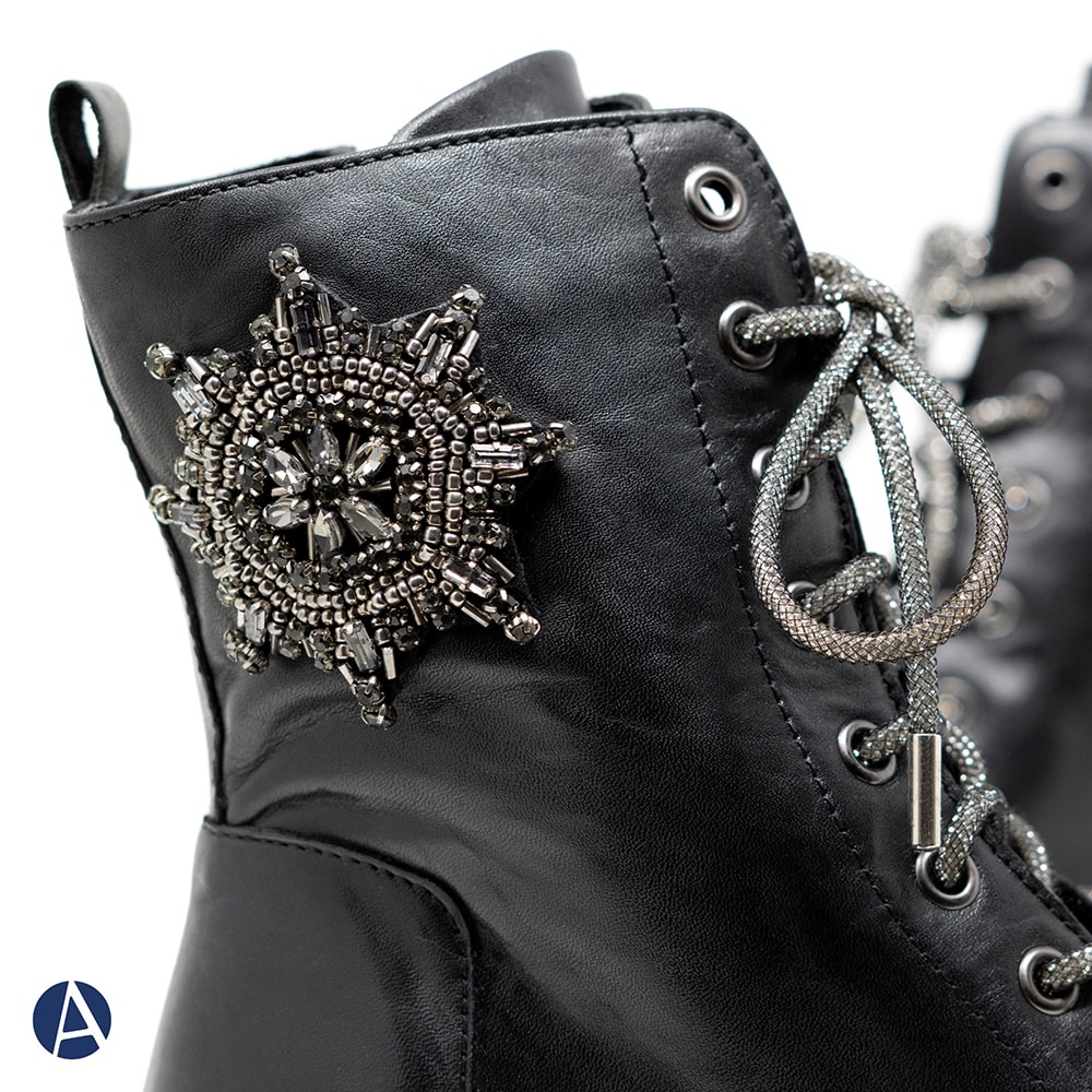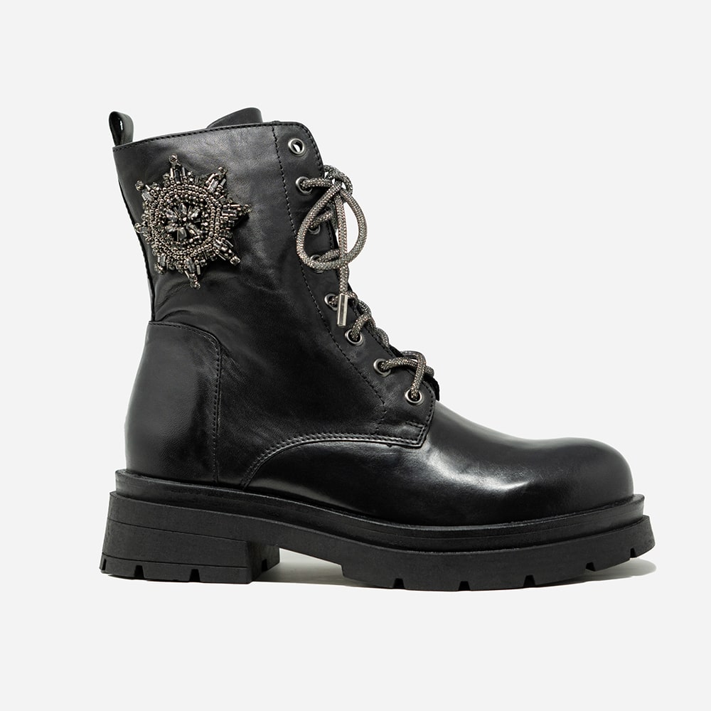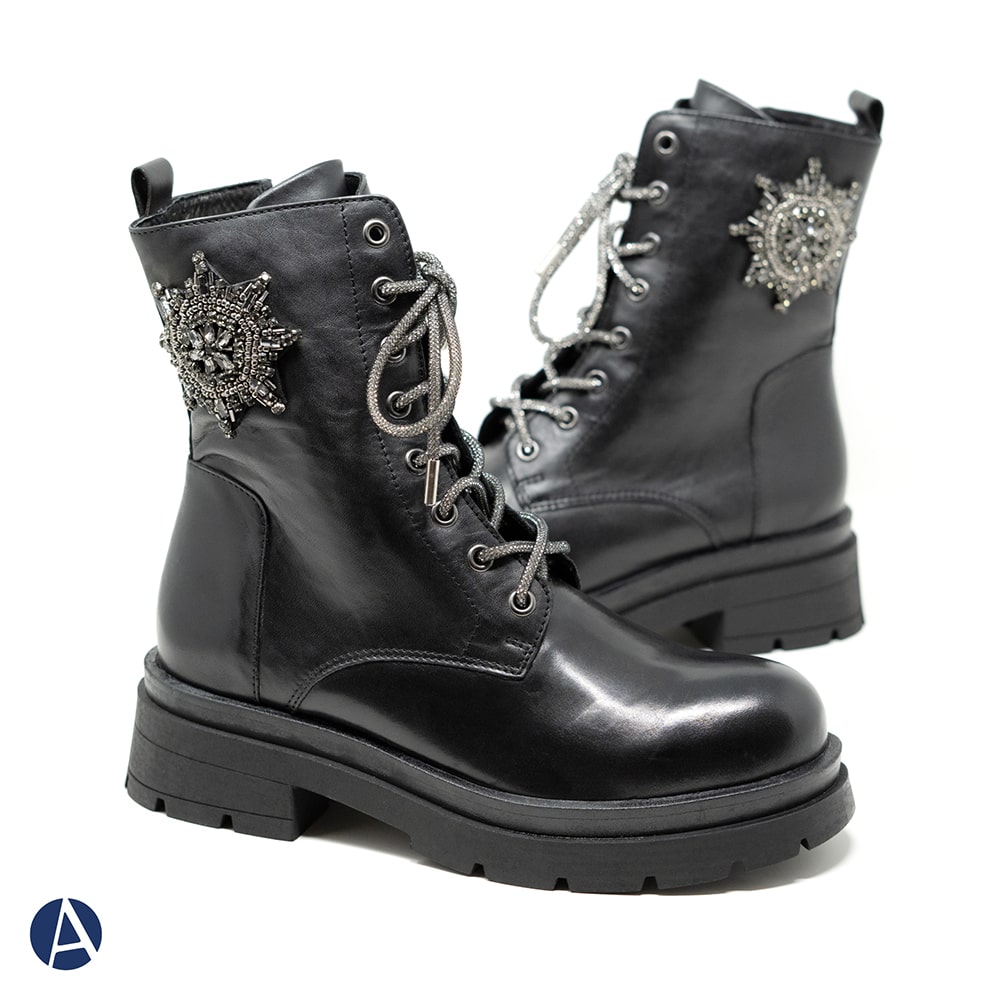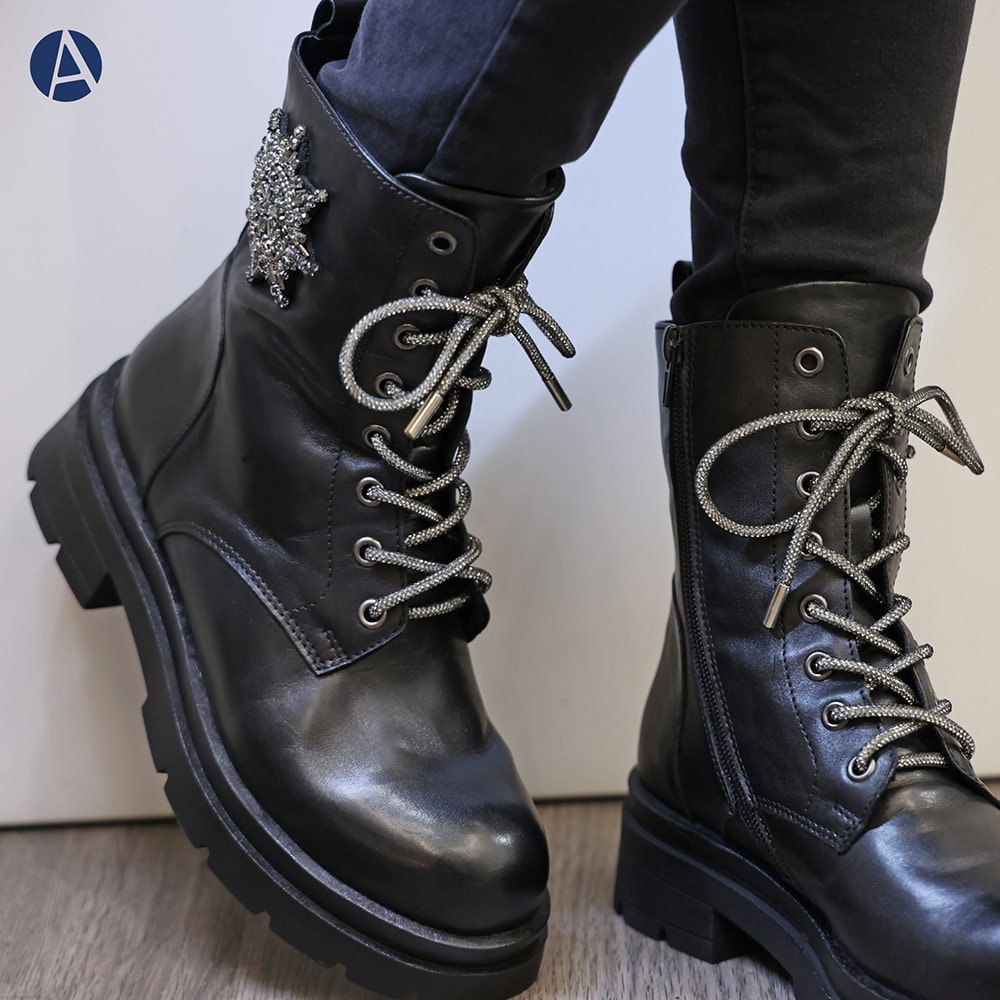 Anfibi donna TOSCA BLU Grace in pelle di colore nero con accessorio laterale e lacci di strass. Una scarpa comoda sempre alla moda con accessorio brillante per un tocco davvero fashion al tuo outfit!