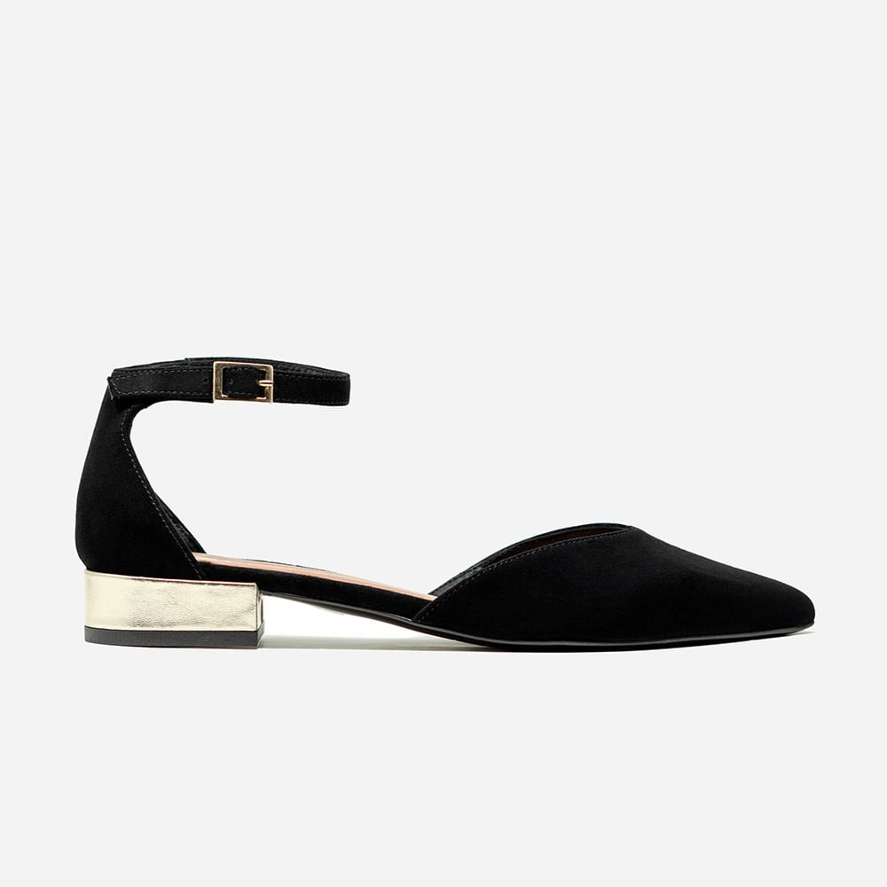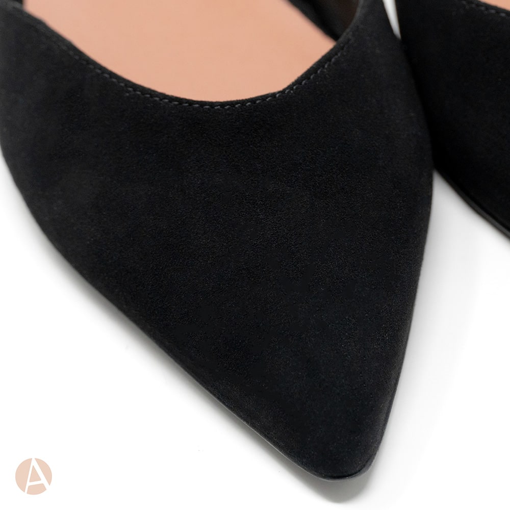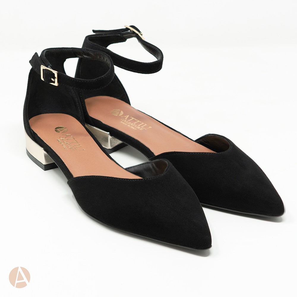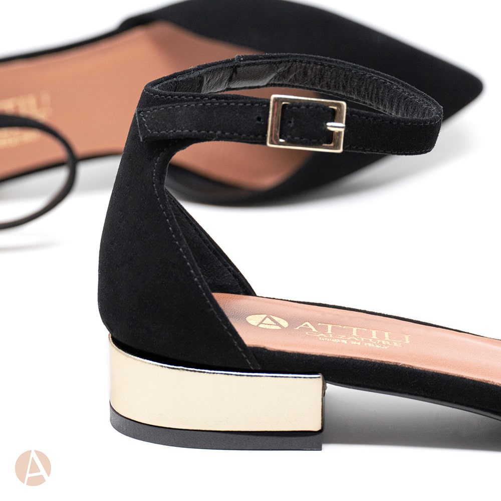 Ballerina semiaperta Attili donna in pelle scamosciata nera con cinturino, tacco da 2 cm, con riporti in nappa colore platino e fondo cuoio. Calzature artigianali donna interamente MADE IN ITALY. Un tocco di classe e moda per il tuo outfit !