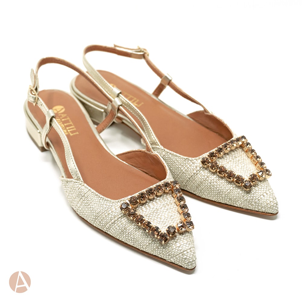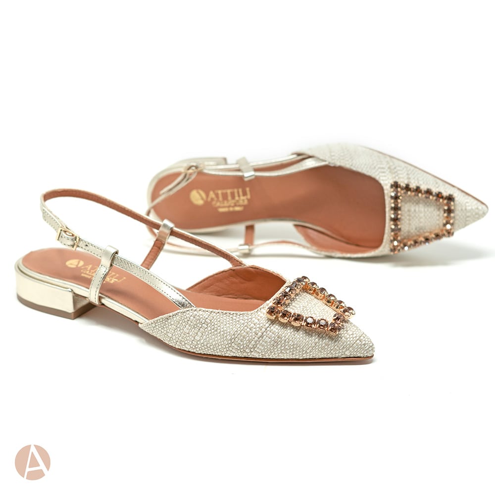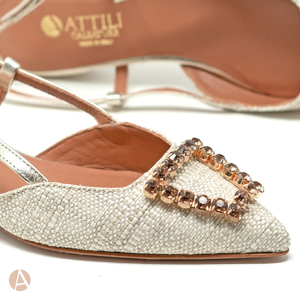 Scarpa slingback Attili donna a punta in rafia naturale e cinturino di colore platino, tacco 2 cm e fondo cuoio. Eccezionale comfort. Calzature artigianali donna interamente MADE IN ITALY.