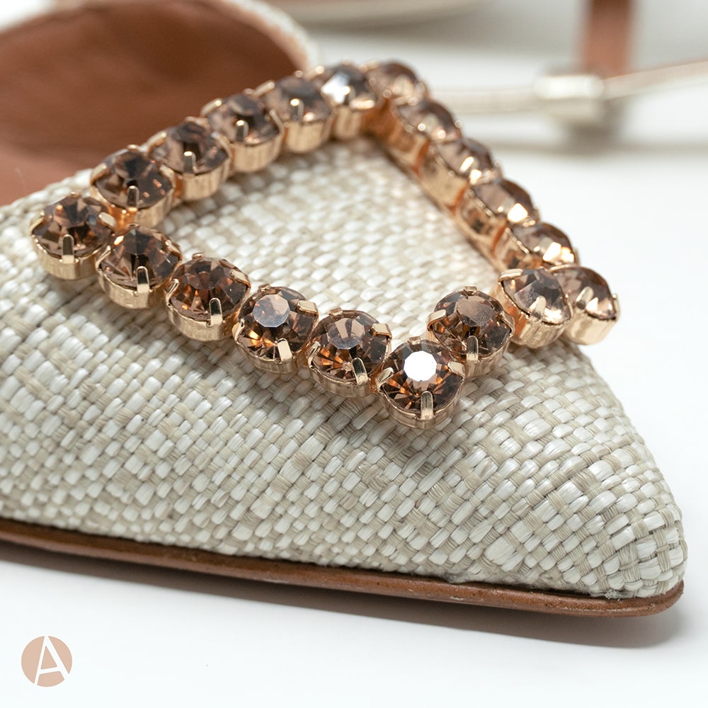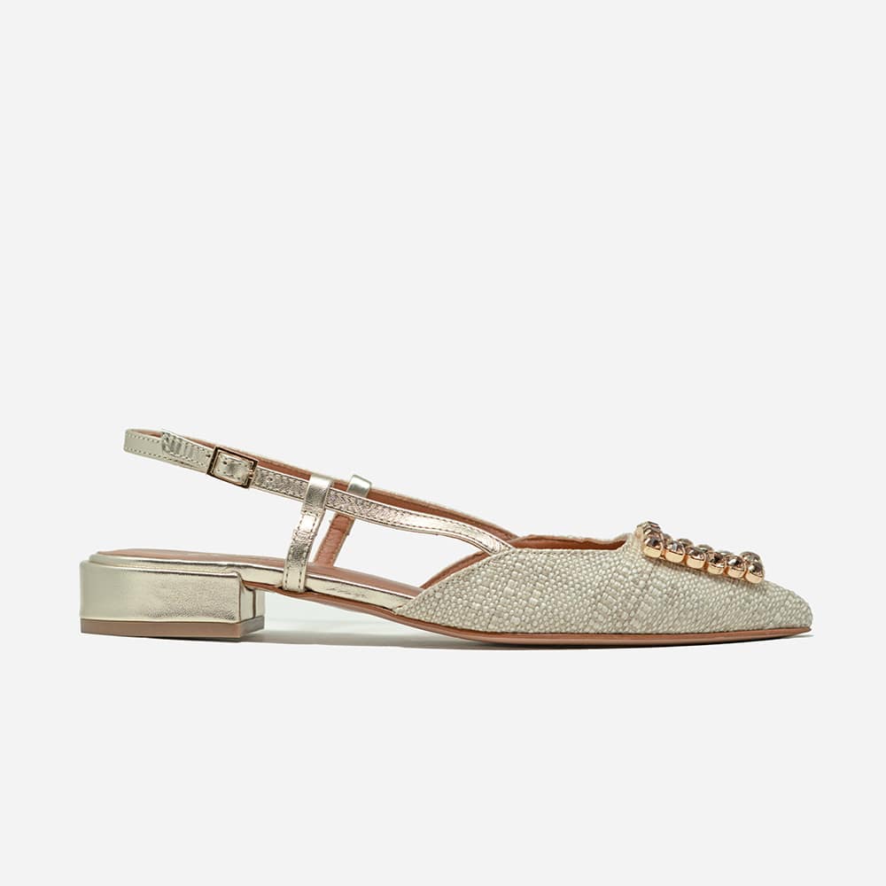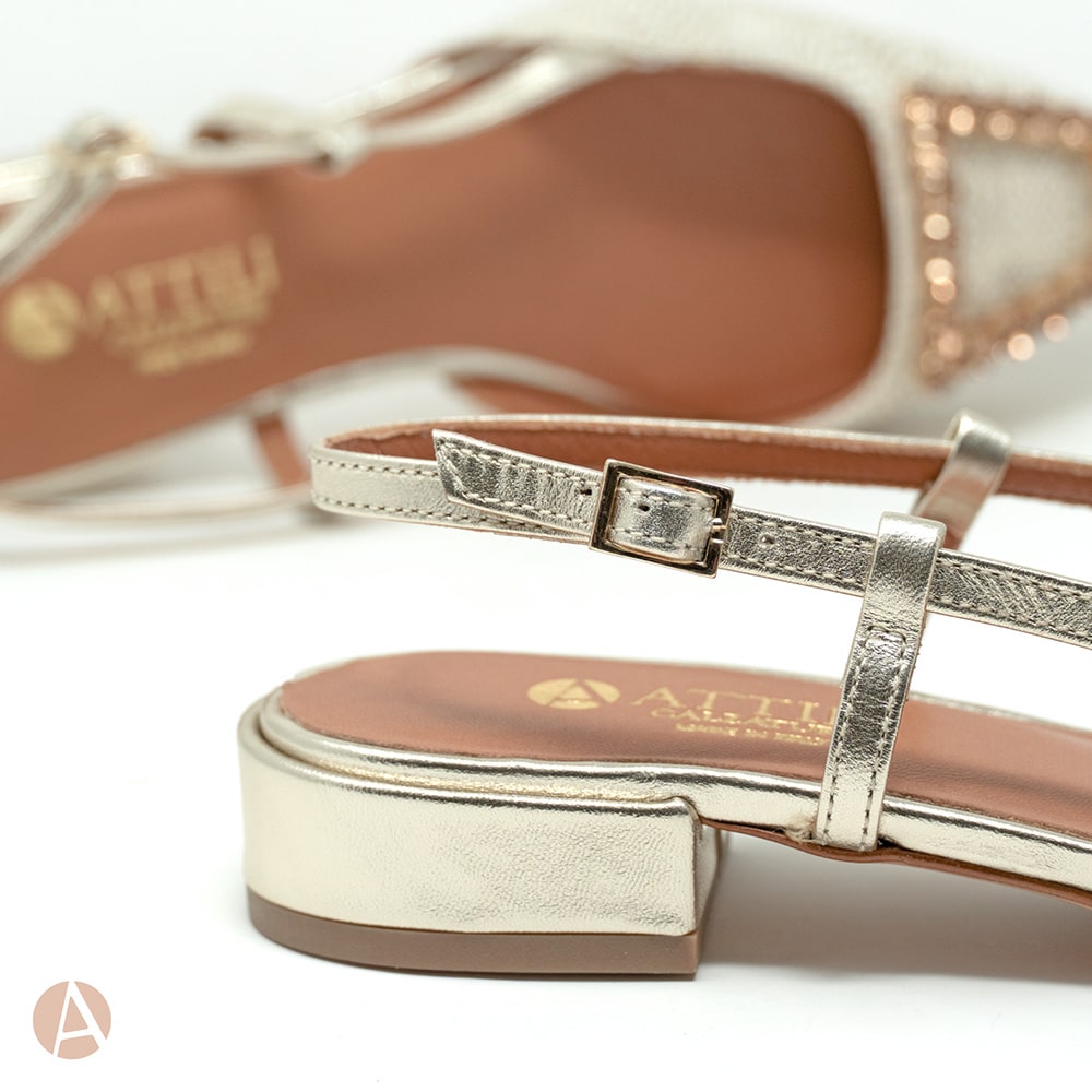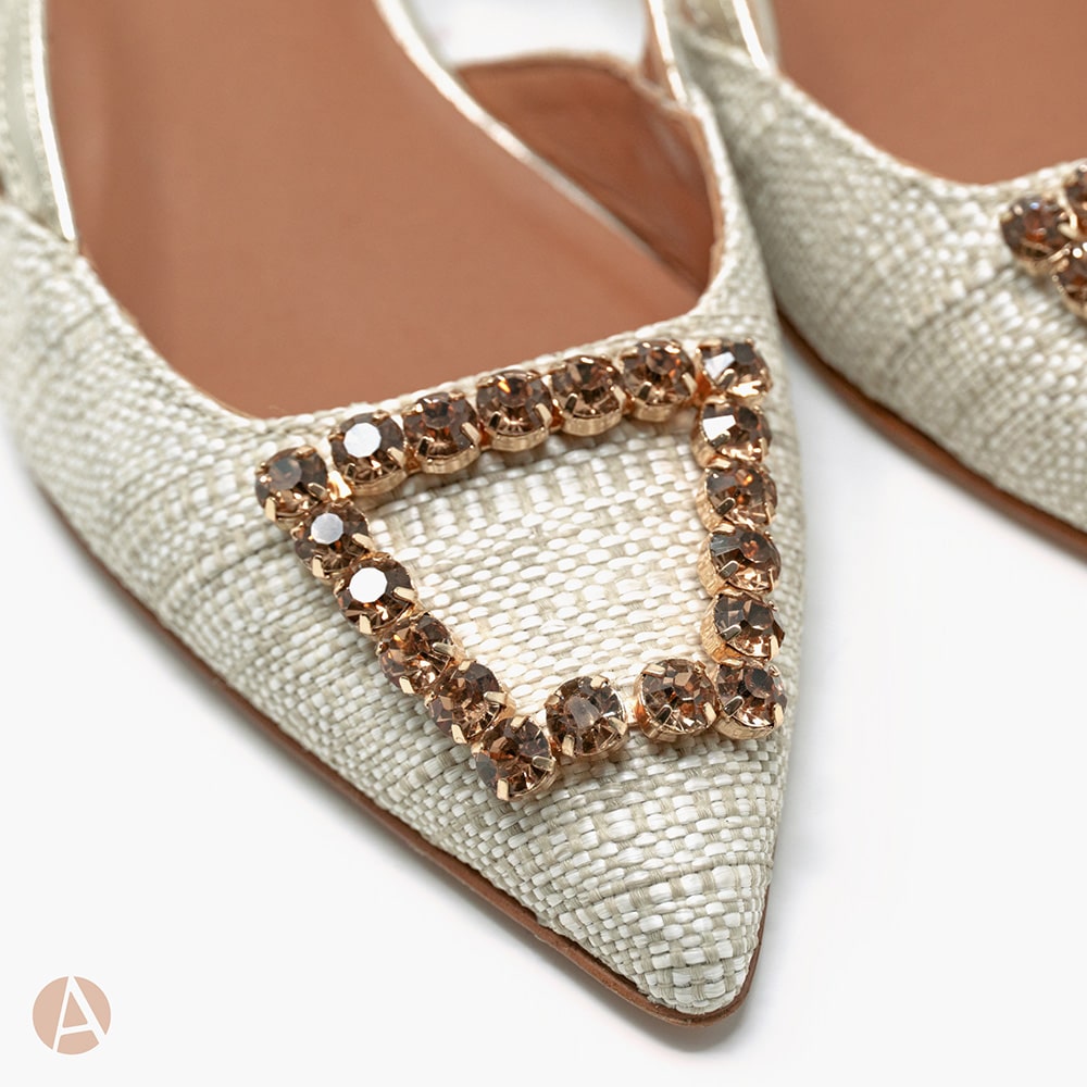 Scarpa slingback Attili donna a punta in rafia naturale e cinturino di colore platino, tacco 2 cm e fondo cuoio. Eccezionale comfort. Calzature artigianali donna interamente MADE IN ITALY.