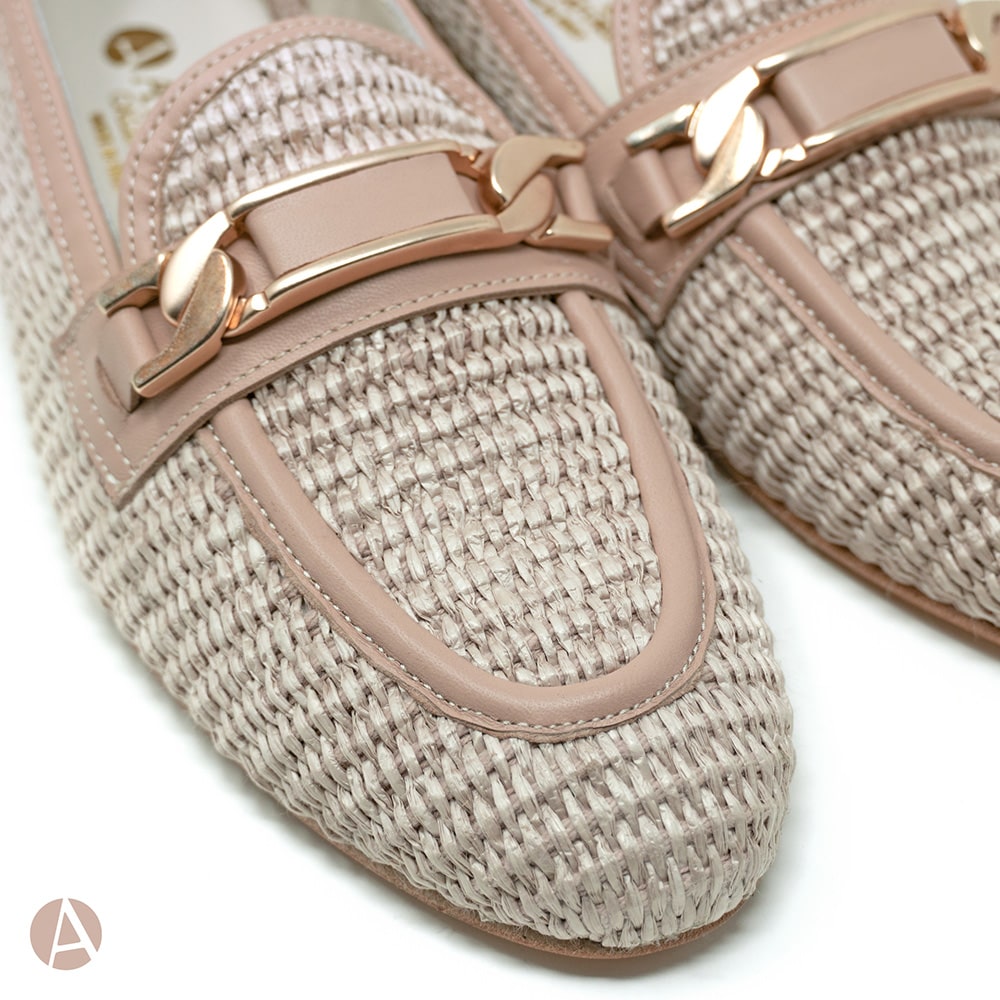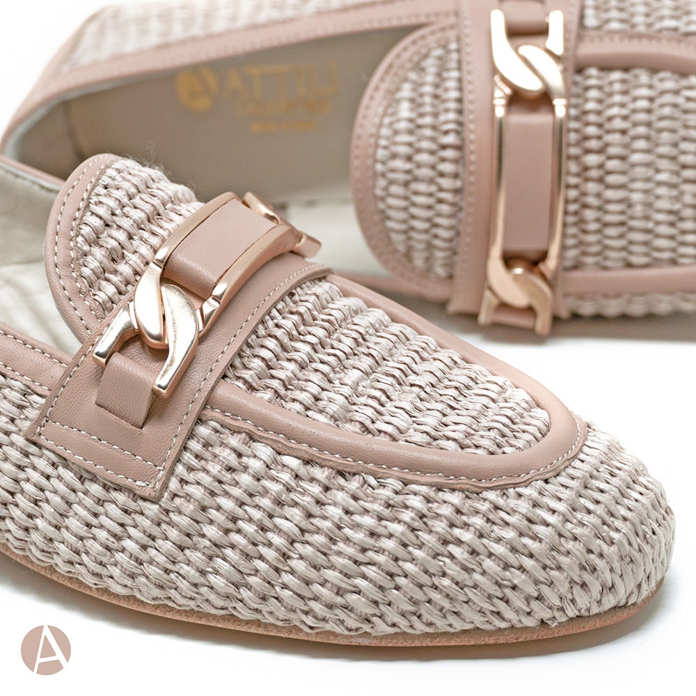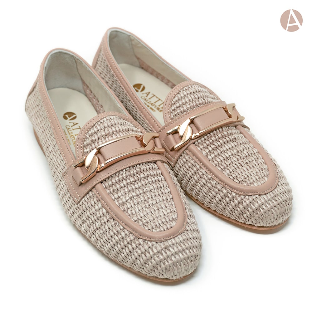 Mocassino donna Attili in rafia, riporti in nappa colore nude con elegante morsetto oro, tacco basso e fondo cuoio. Eccezionale comfort. Calzature artigianali donna interamente MADE IN ITALY.