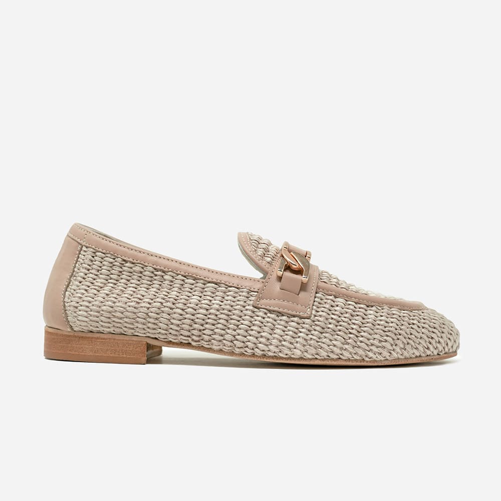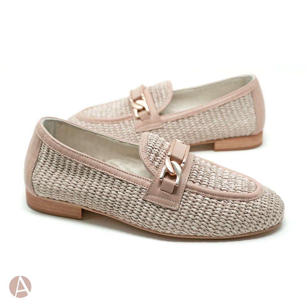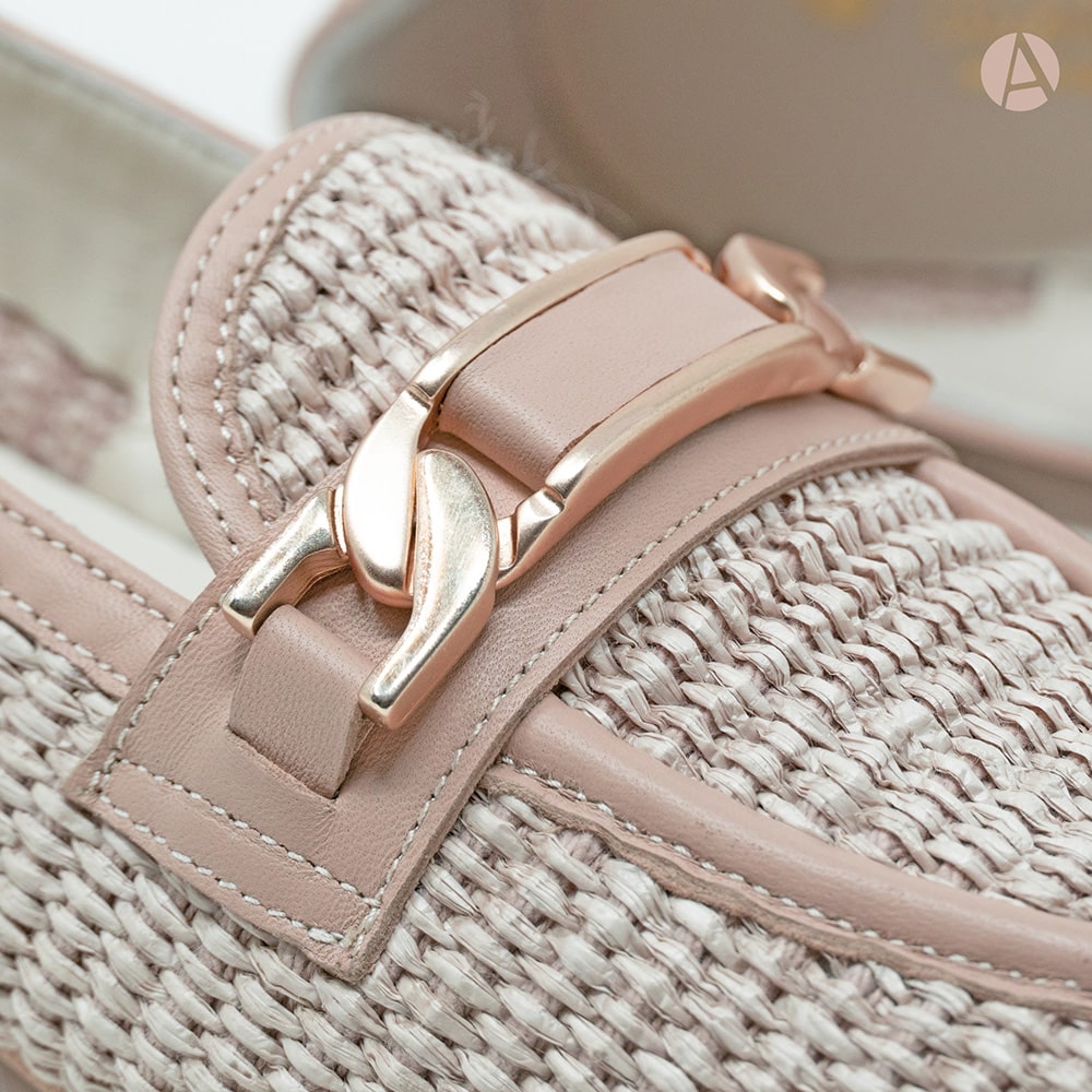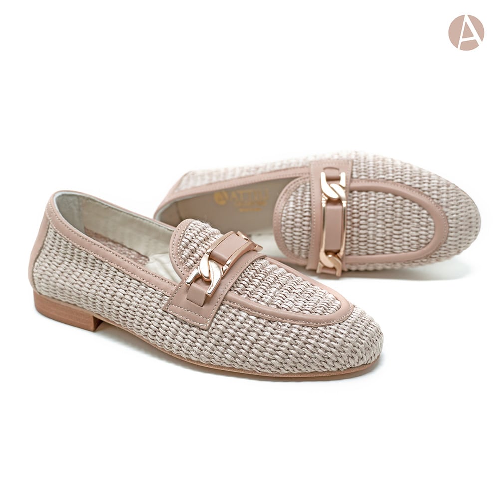 Mocassino donna Attili in rafia, riporti in nappa colore nude con elegante morsetto oro, tacco basso e fondo cuoio. Eccezionale comfort. Calzature artigianali donna interamente MADE IN ITALY.