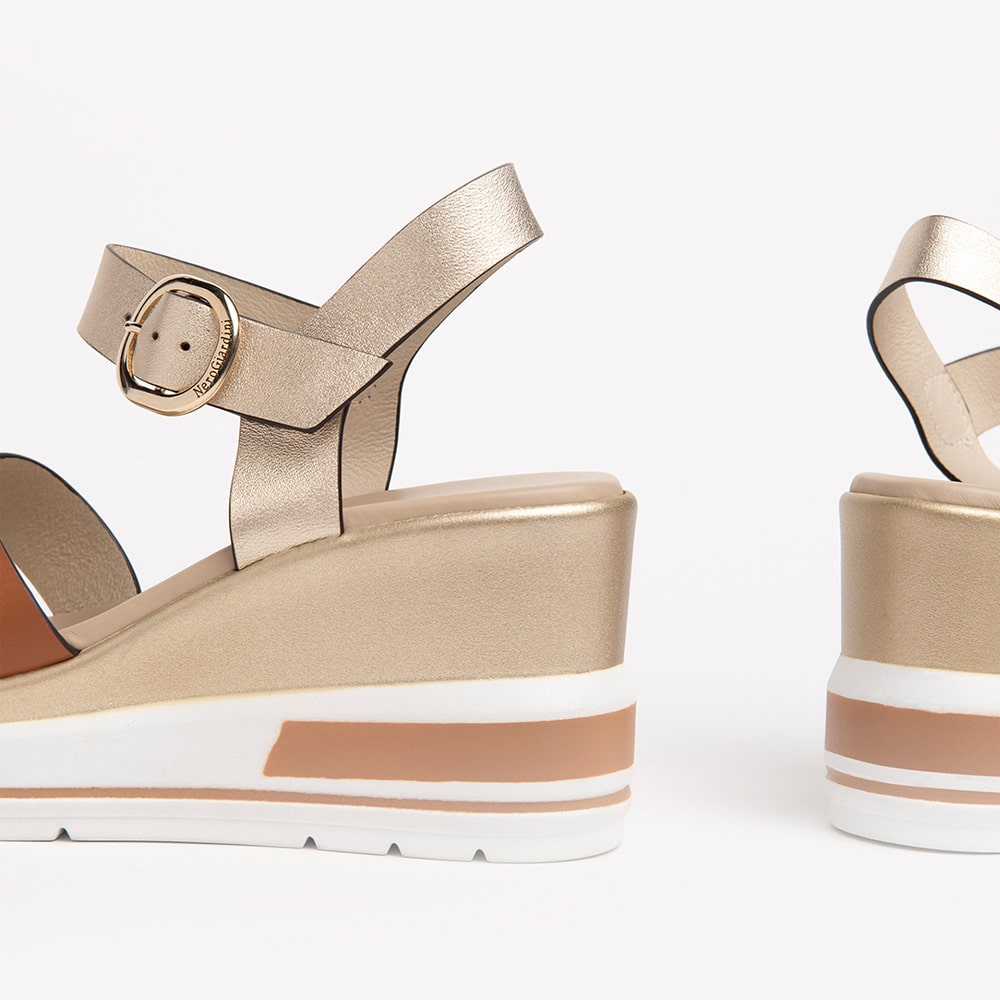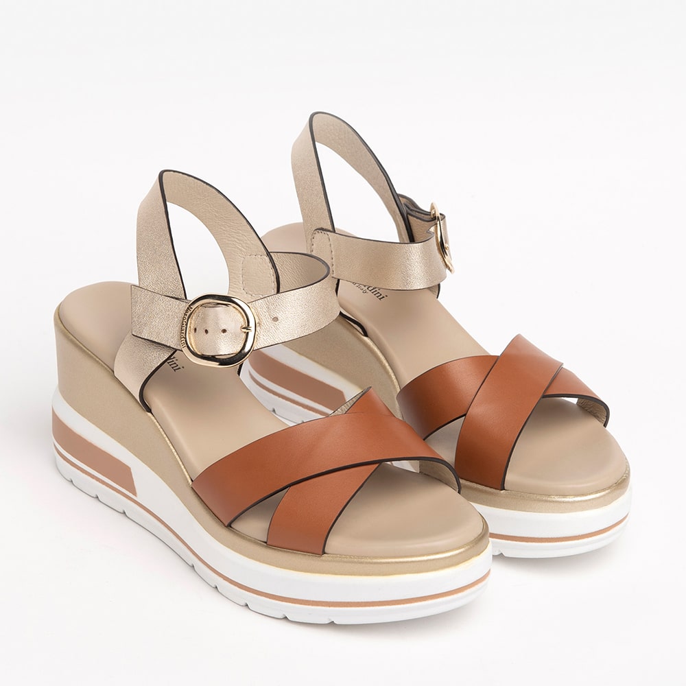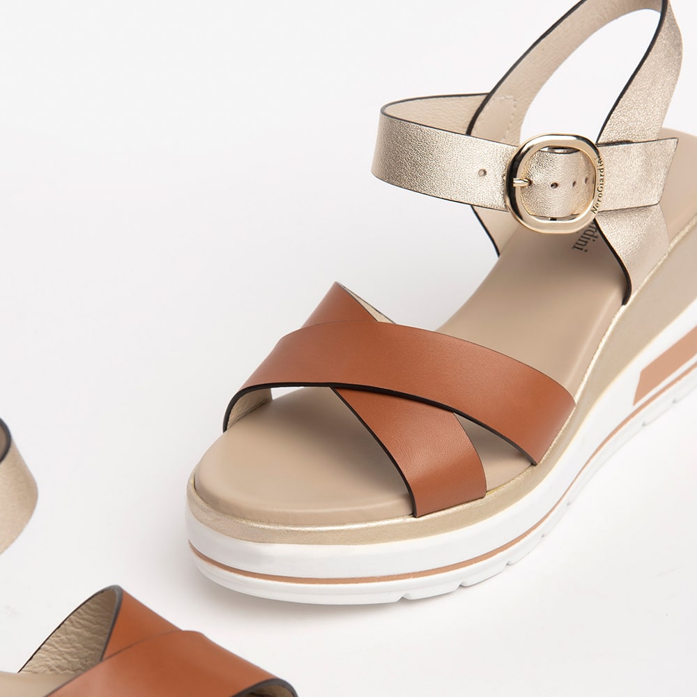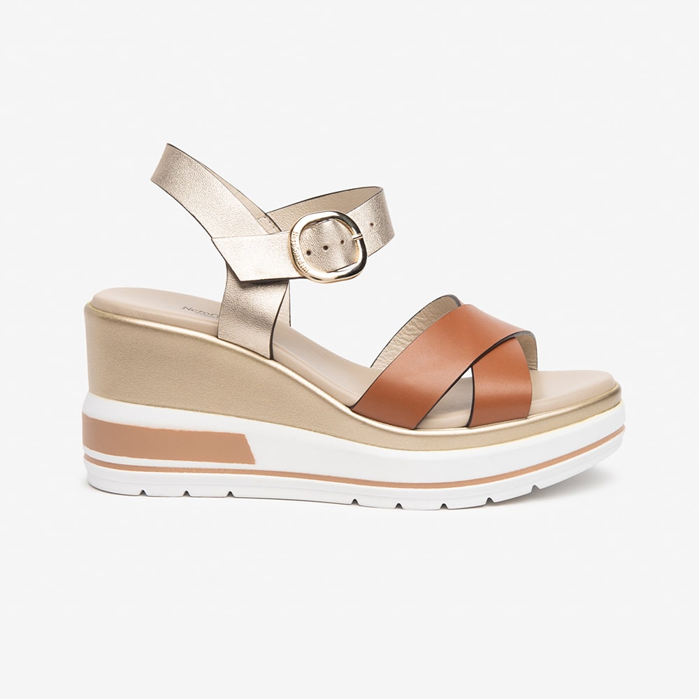 Sandalo donna NeroGiardini in pelle di colore cuoio e bianco con cinturino che avvolge la caviglia. Accessorio e logo in metallo colore gold, tacco con zeppa 7,5 cm, fondo in gomma. Calzatura comodissima dal design moderno e ricercato. MADE IN ITALY