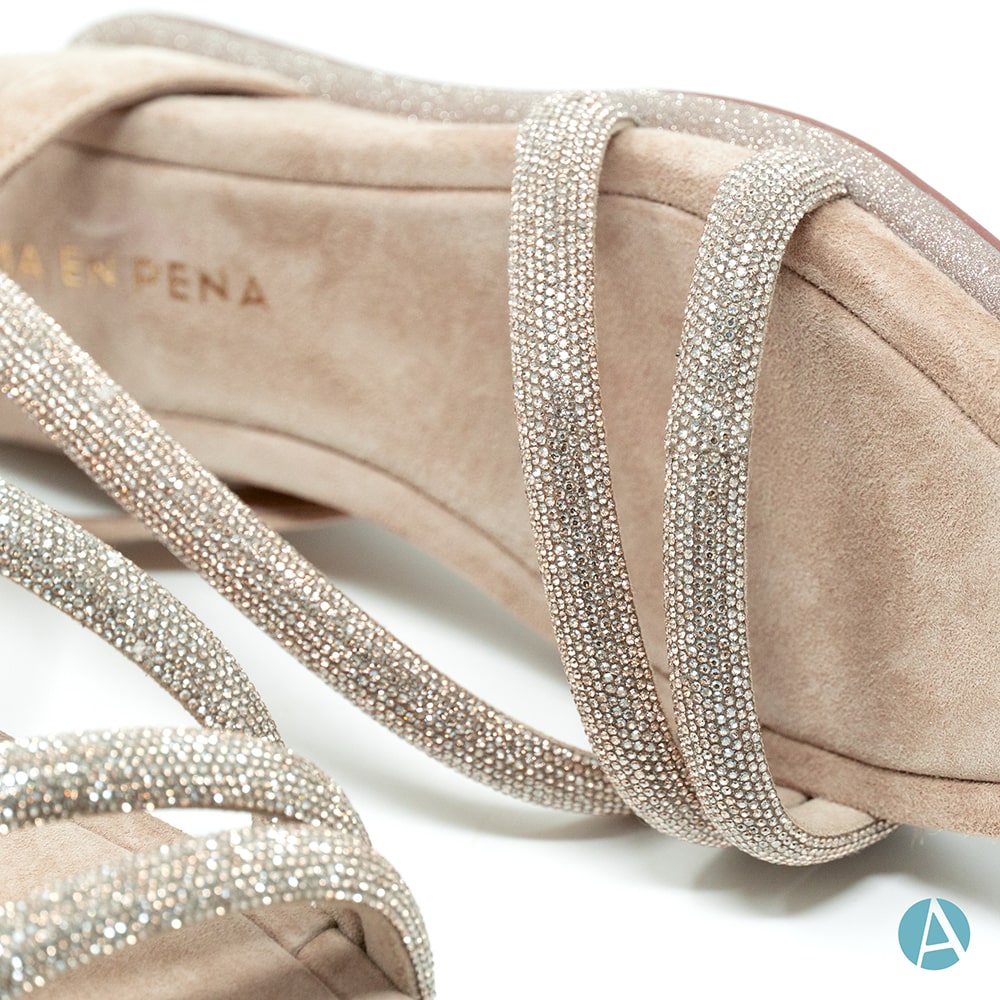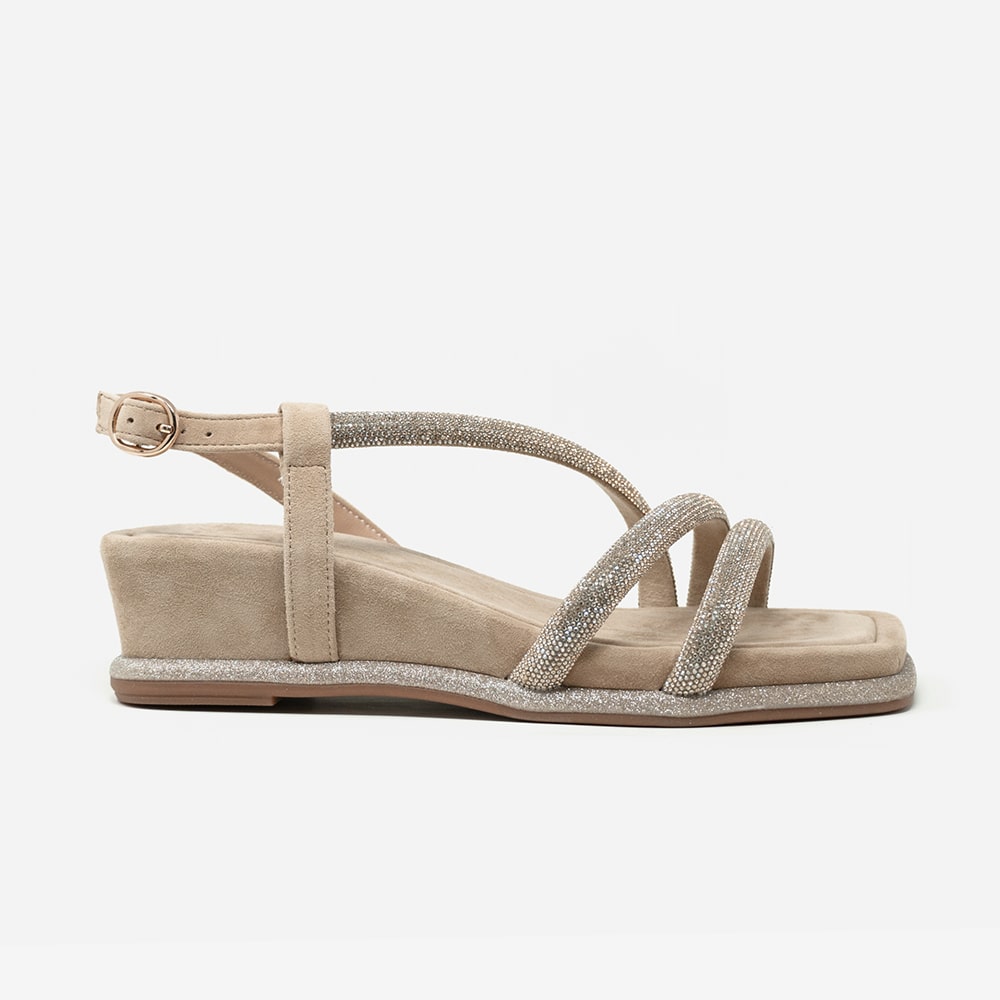 Alma en Pena sandalo donna con zeppa media 5 cm, realizzato in pelle scamosciata beige con finitura di micro strass oro e bordato con glitter platino. Cinturino regolabile che avvolge la caviglia e permette una calzata personalizzata e plantare confortevole realizzato in morbida pelle scamosciata. Questo comodo sandalo dona un tocco di brillantezza al tuo outfit ed è perfetto per le occasioni speciali.