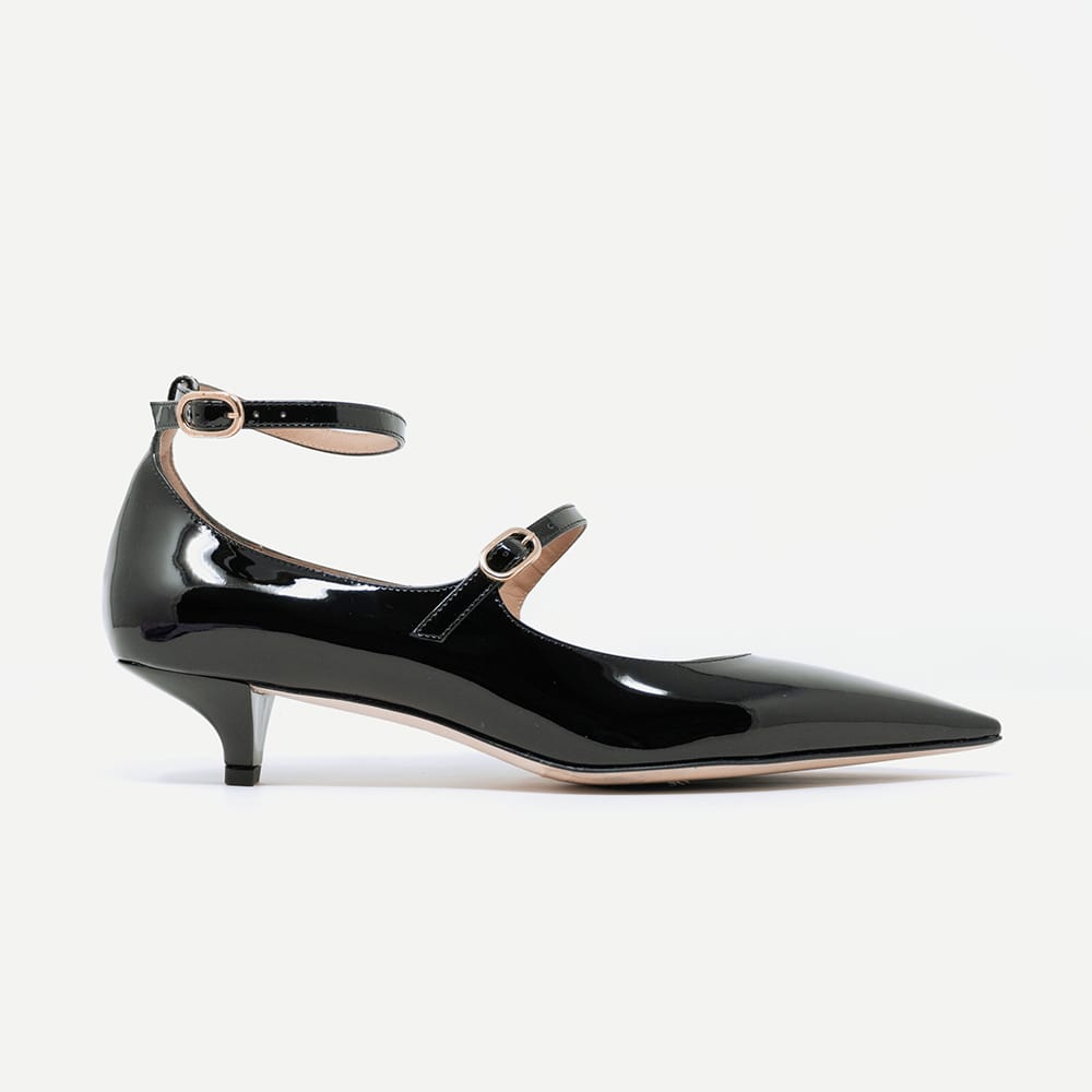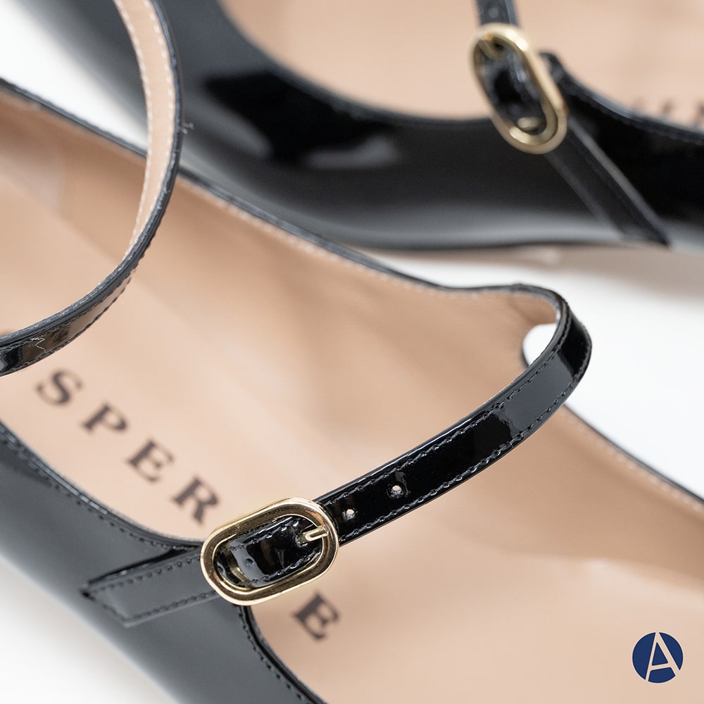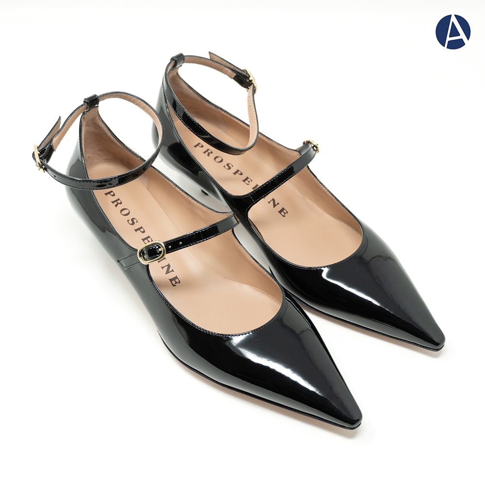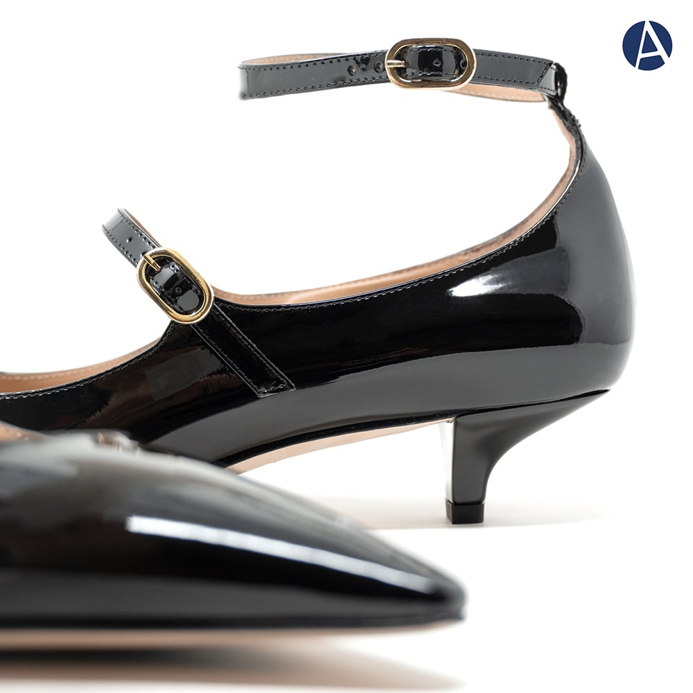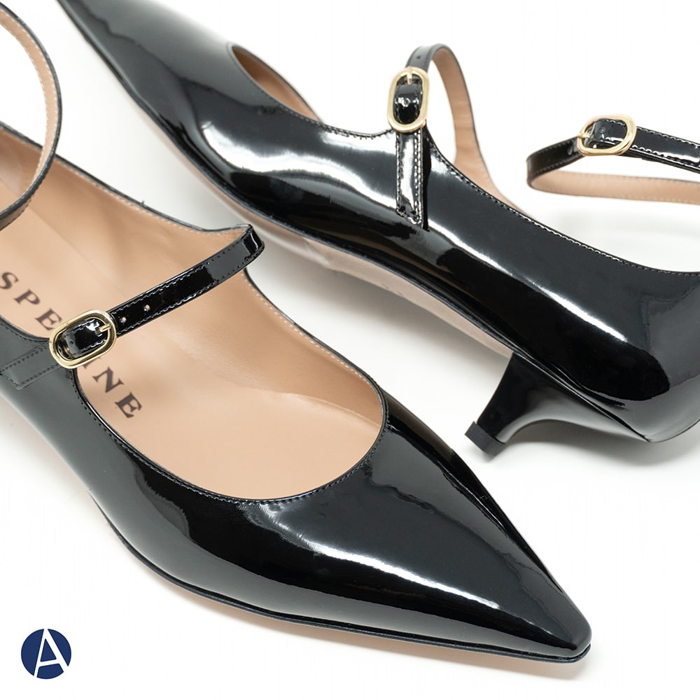 Prosperine scarpa donna in vernice a punta di colore nero, con fibbia e cinturino alla caviglia, tacco 3,5 cm. e suola in cuoio con antiscivolo. Calzature artigianali donna di alta qualità interamente MADE IN ITALY. Calzature femminili, perfette per rendere i tuoi outfit unici e sofisticati!