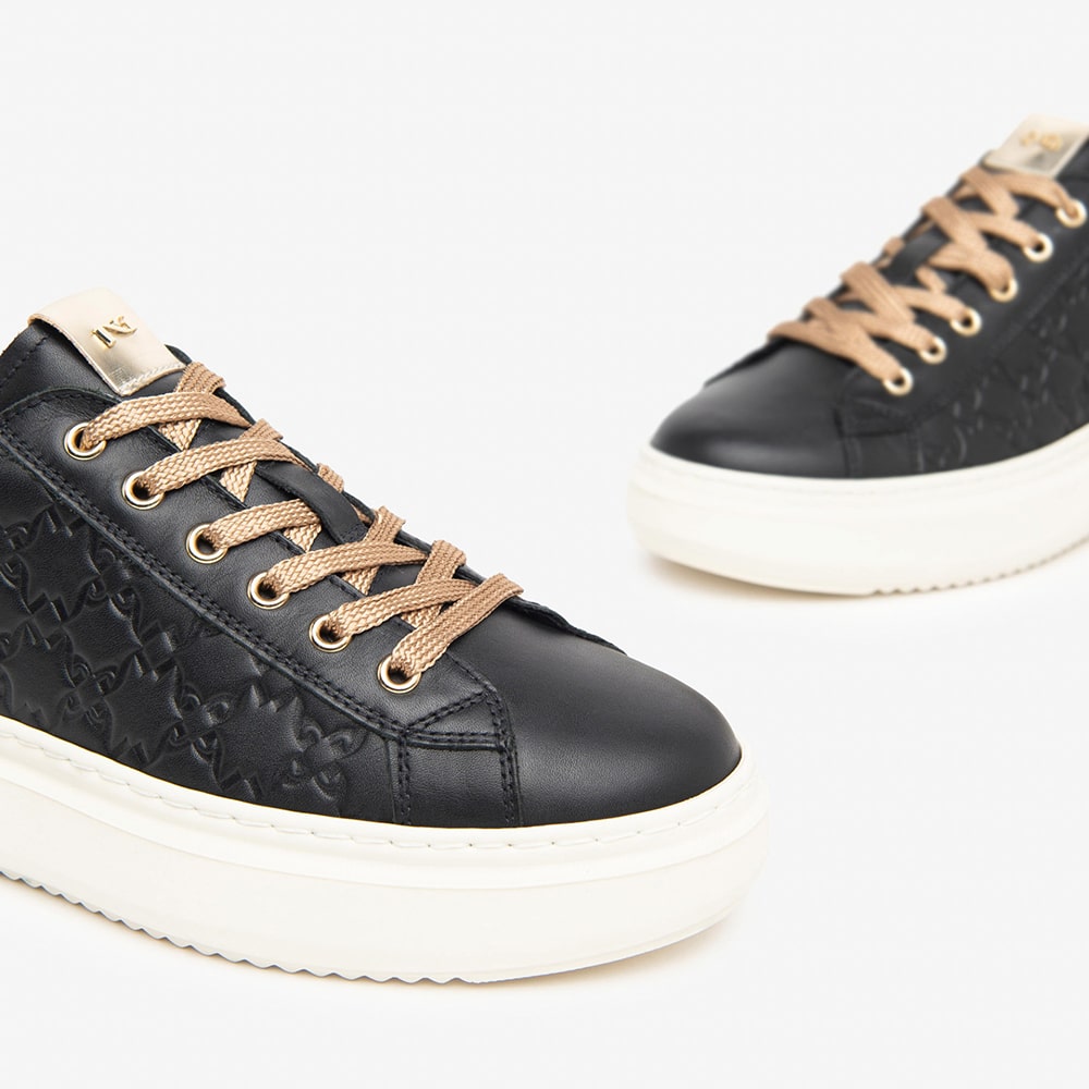 Sneakers donna NeroGiardini in pelle nera, lacci, fondo platform, riporti colore platino sul tallone. Accessorio con logo laterale gold e strass di pietre nere. Sneakers comode da indossare tutto il giorno. Calzature MADE IN ITALY realizzate con materiali di alta qualità.