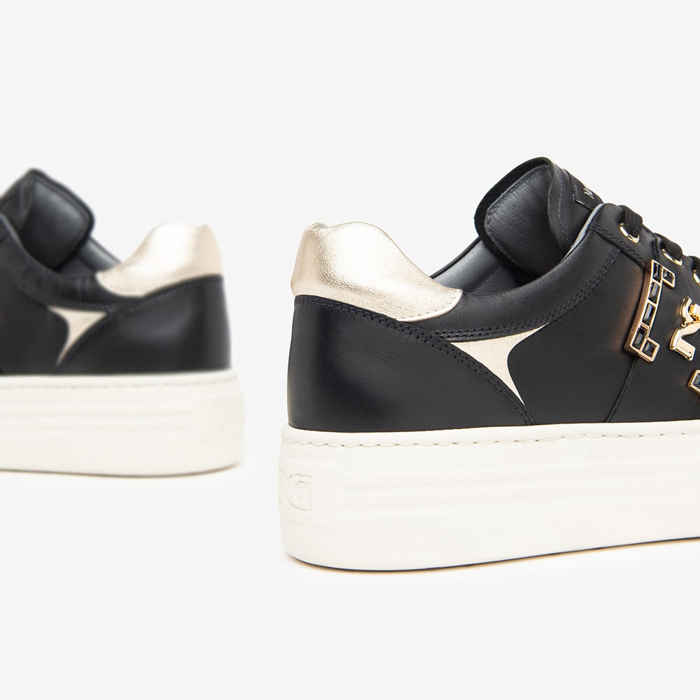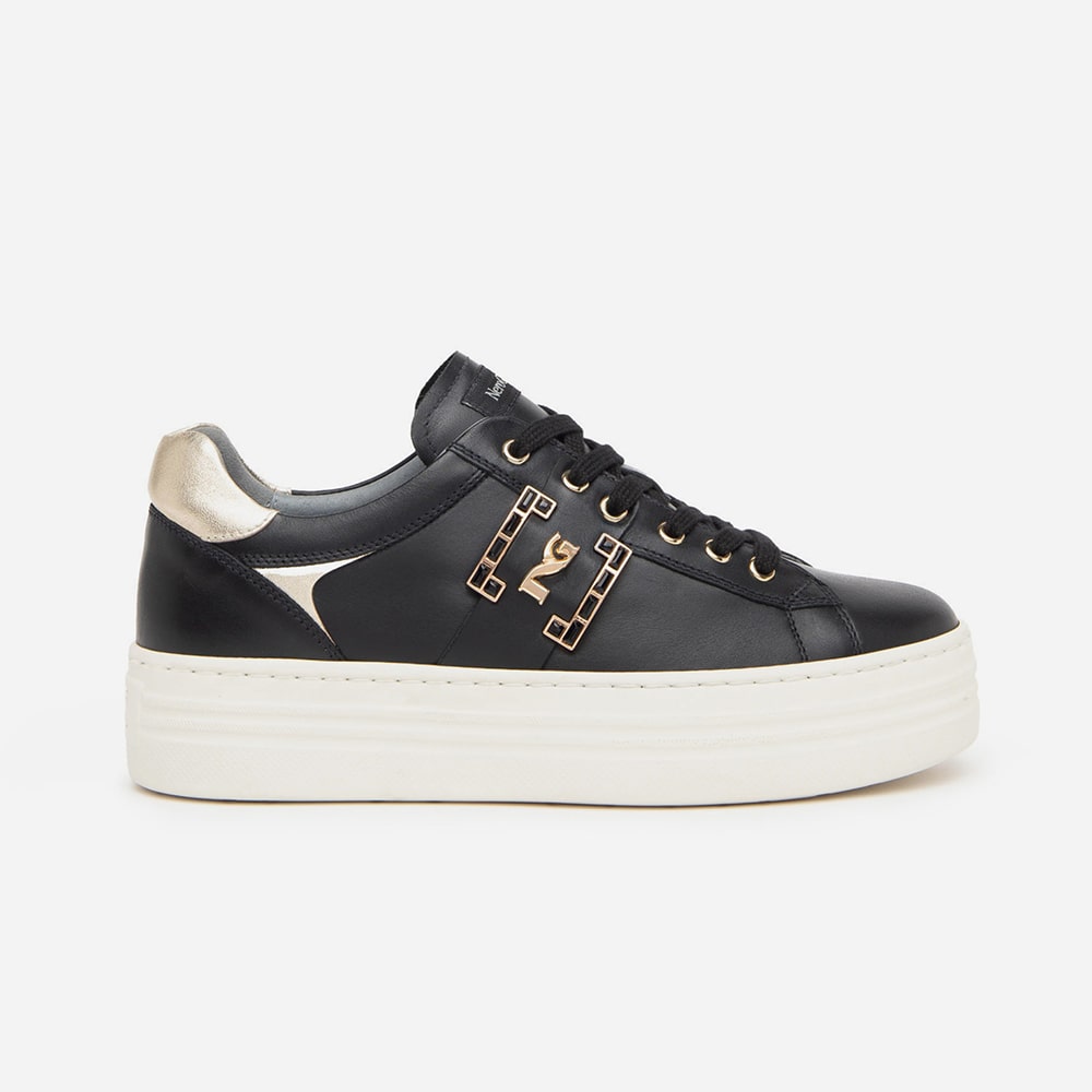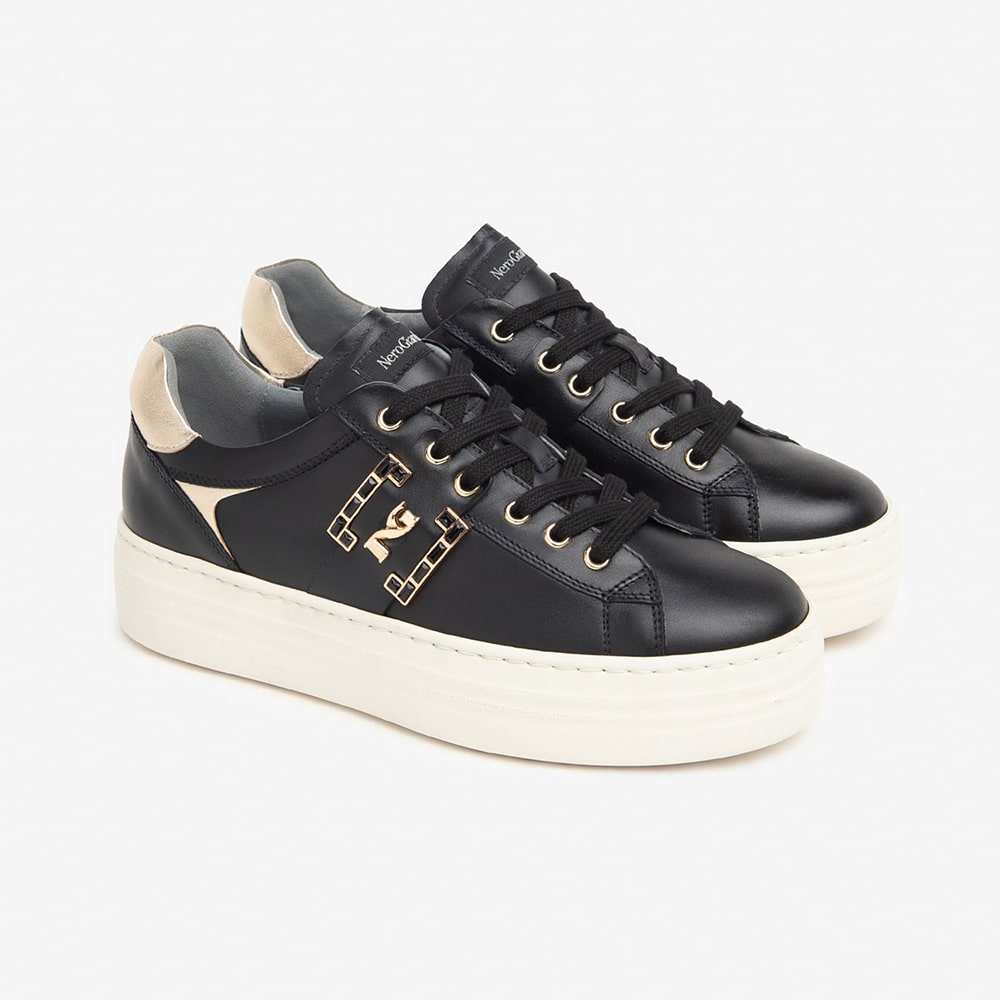 Sneakers donna NeroGiardini in pelle nera con lacci di colore bronzo, fascia laterale con logo oro. Sneakers estremamente comode da indossare. MADE IN ITALY realizzate con materiali di alta qualità.