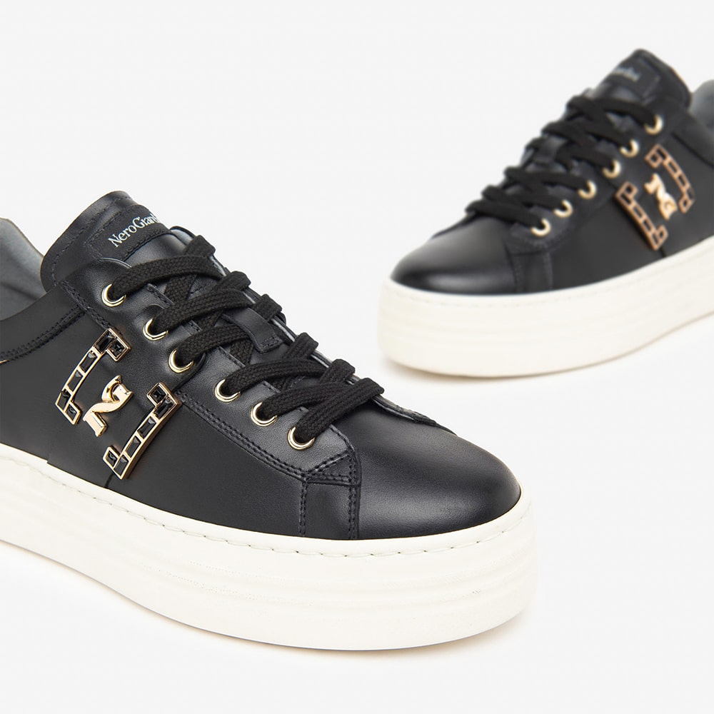 Sneakers donna NeroGiardini in pelle nera con lacci, fondo alto con accessorio laterale argento. Sneakers new collection. MADE IN ITALY