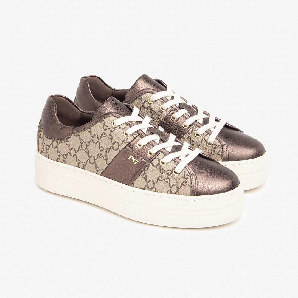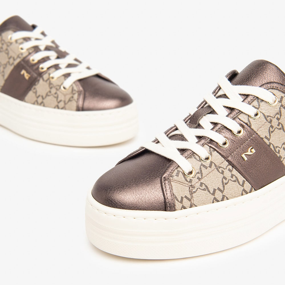 Sneakers donna NeroGiardini in pelle scamosciata e materiale tecnico di colore malto con lacci e rifiniture oro, fondo platform e riporti platino sul tallone. Sneakers estremamente comode da indossare tutto il giorno. Calzature MADE IN ITALY realizzate con materiali di alta qualità.