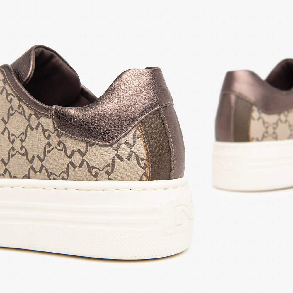 Sneakers donna NeroGiardini in pelle laminata e scamosciata beige, tessuto tecnico con frangia arricchita da due fasce di strass, fondo platform tacco 4,5 cm. Sneakers estremamente comode da indossare. MADE IN ITALY realizzate con materiali di alta qualità.
