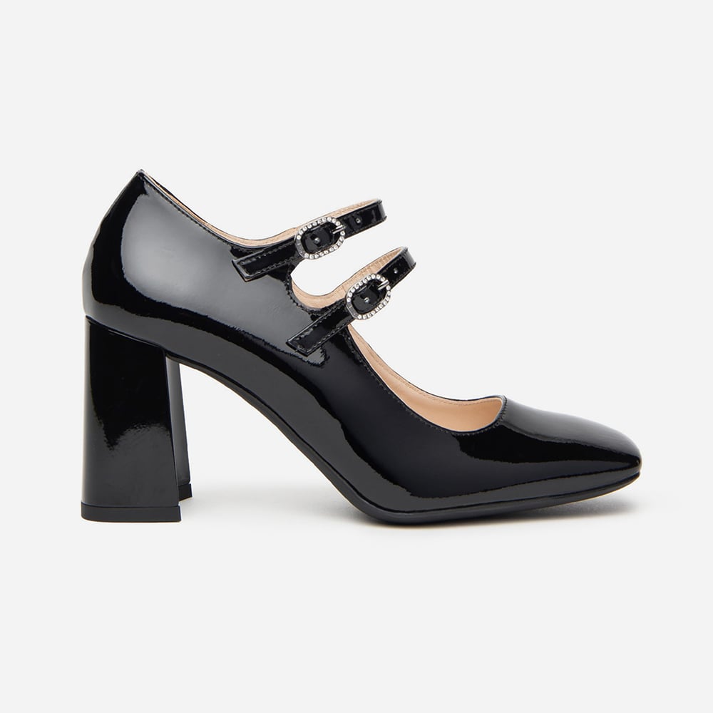 Scarpa elegante NeroGiardini décolleté donna in pelle nera con cinturino, tacco a rocchetto 9,5 cm. Calzatura MADE IN ITALY realizzate con materiali di qualità.