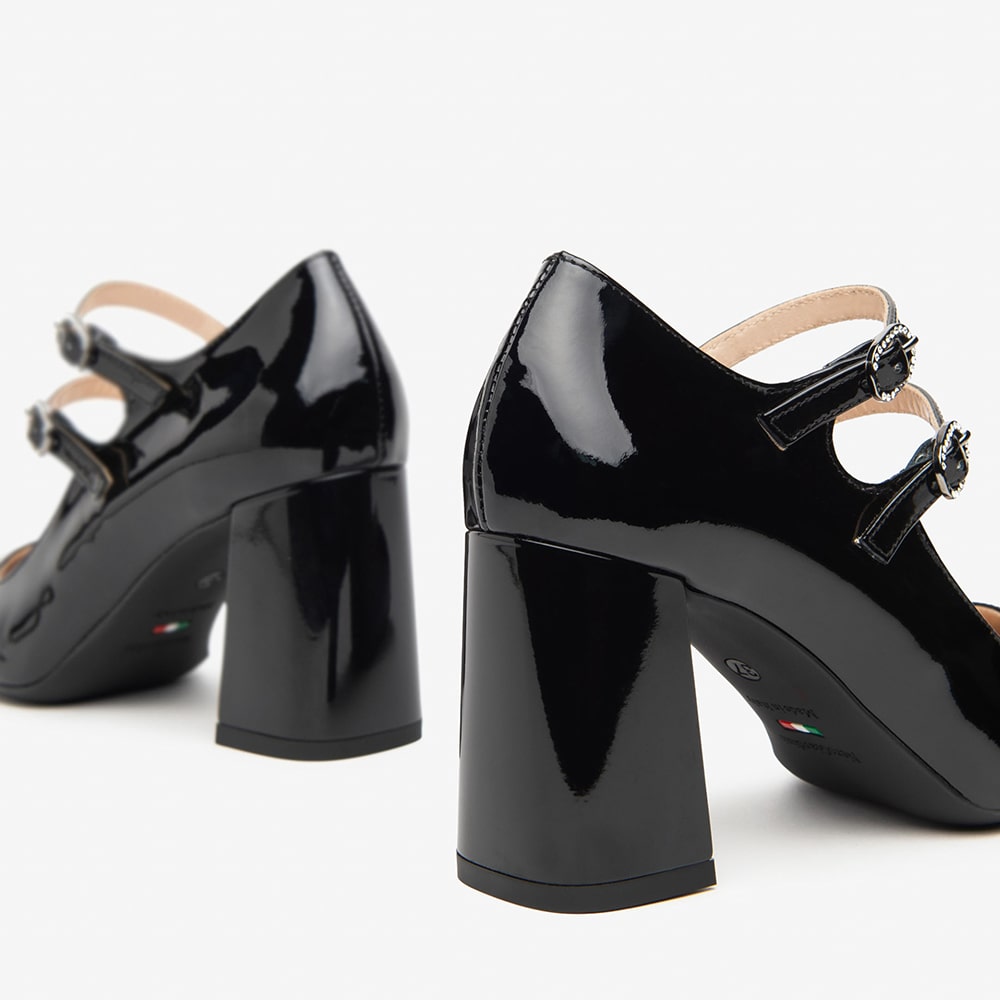 Décolleté NeroGiardini donna semiaperta in pelle nera con cinturini incrociati alla caviglia, tacco largo 5 cm e fondo in gomma. Calzatura comoda da indossare. MADE IN ITALY