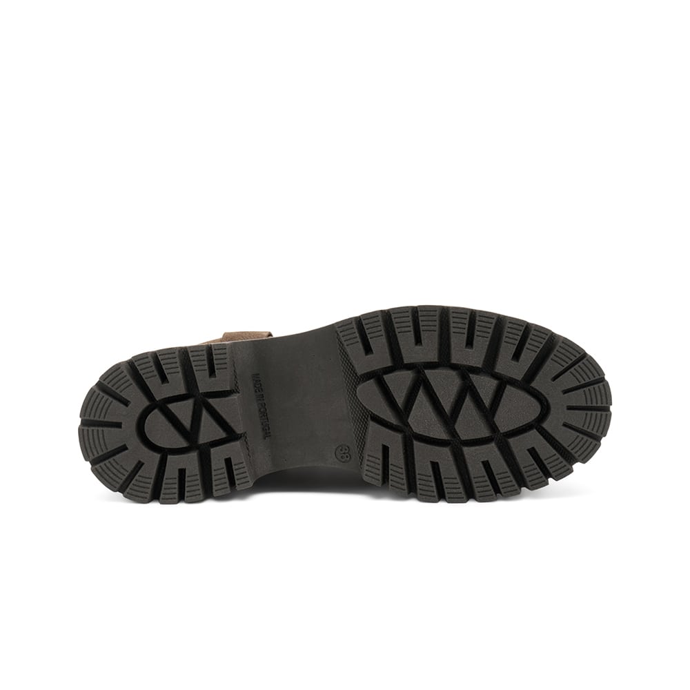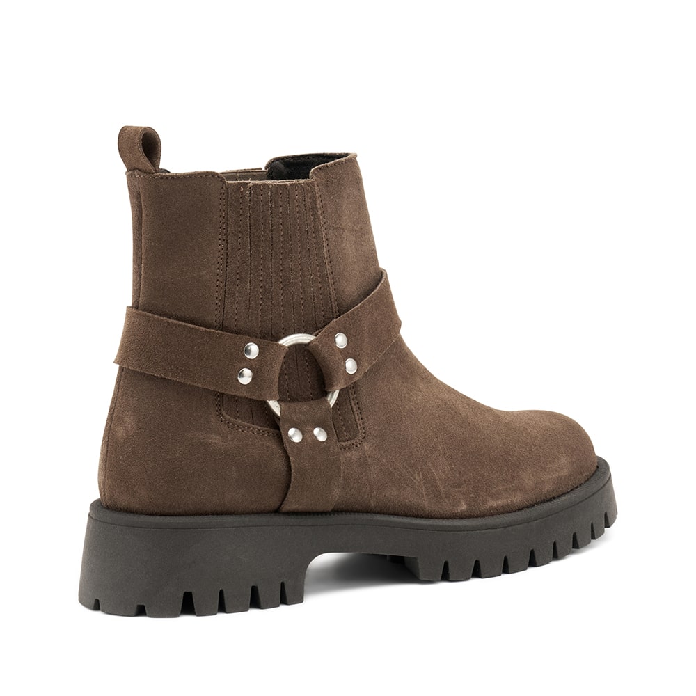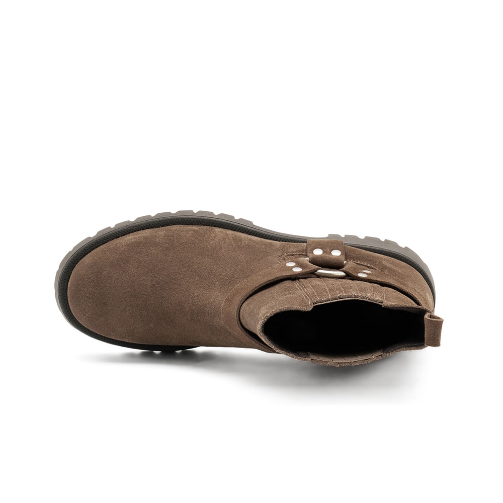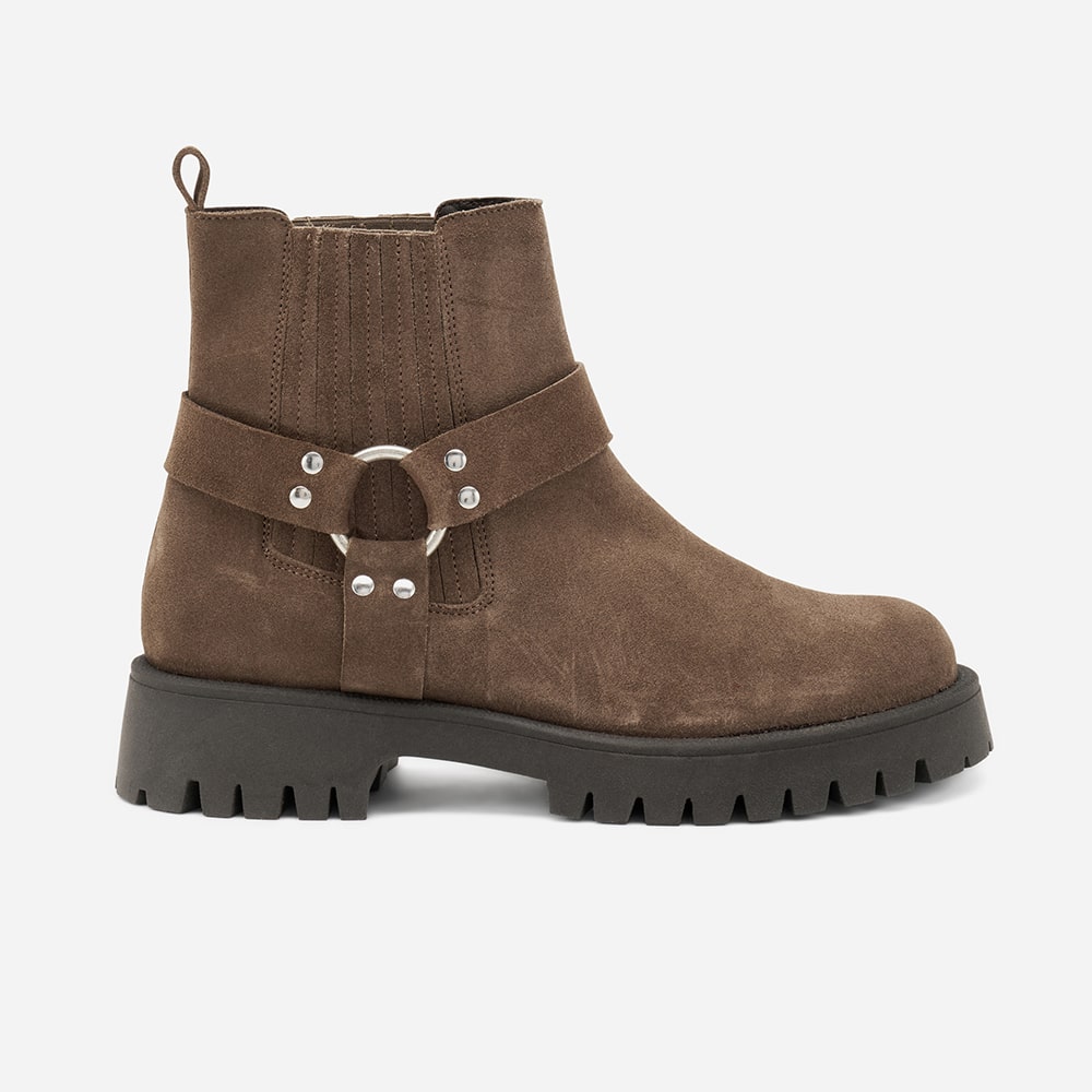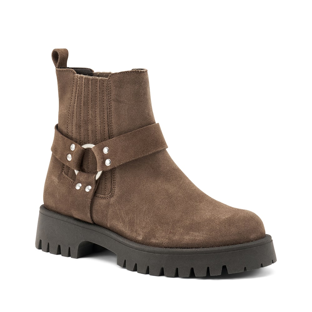 Stivaletto Frau donna in pelle di colore taupe con accessorio e cinghie laterali taupe. Doppio elastico laterale con inserti in pelle e fondo a carrarmato. Calzatura comoda MADE IN ITALY.