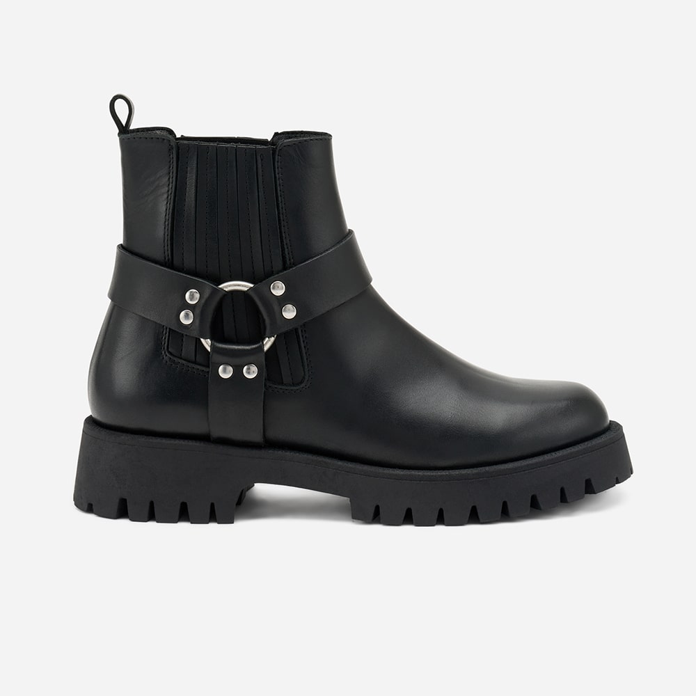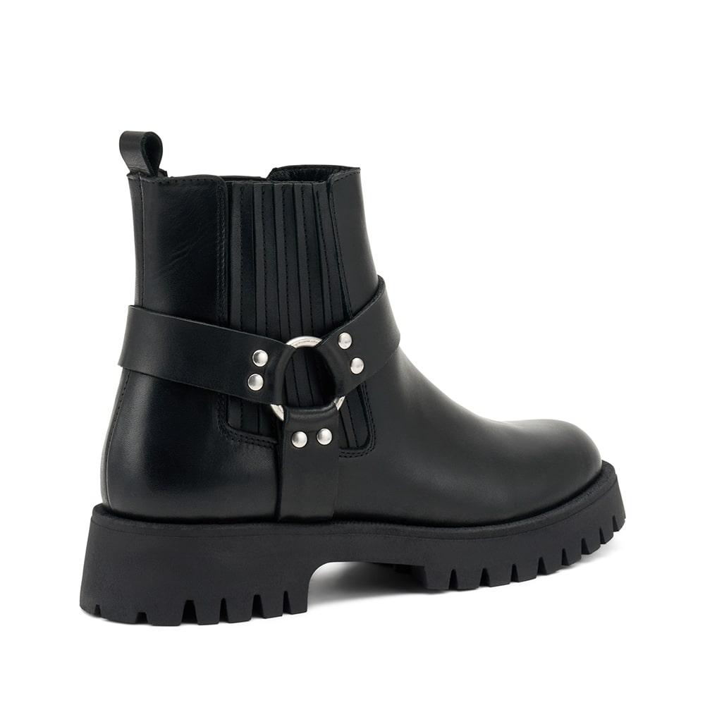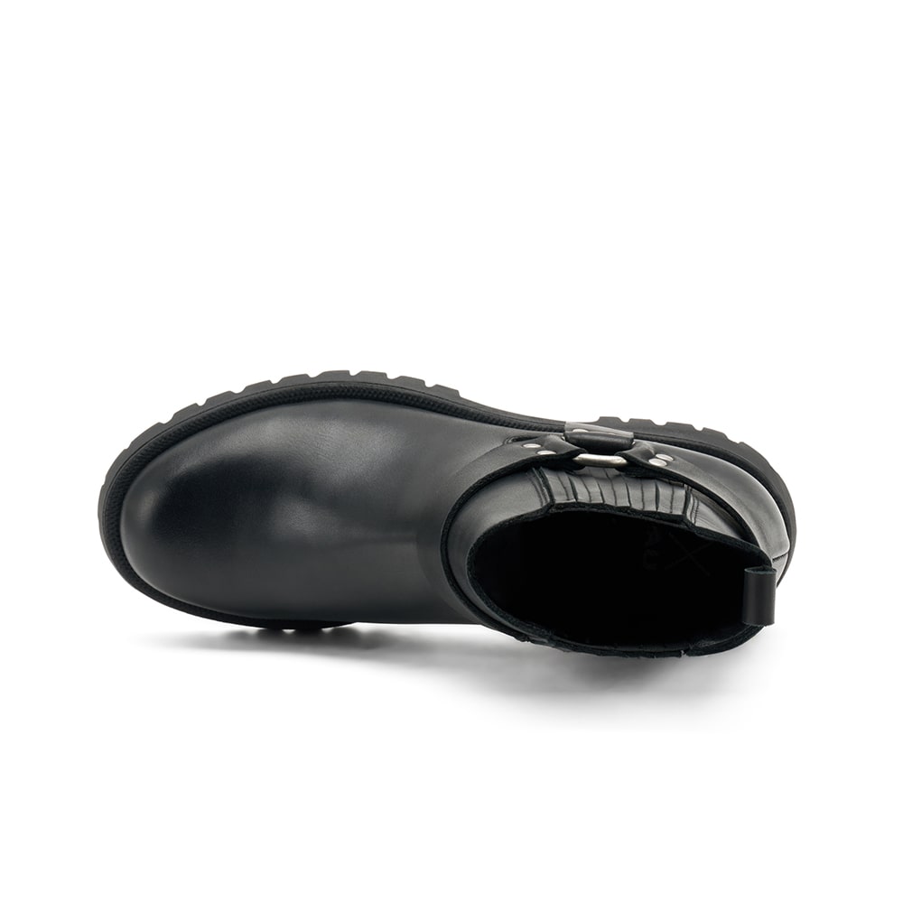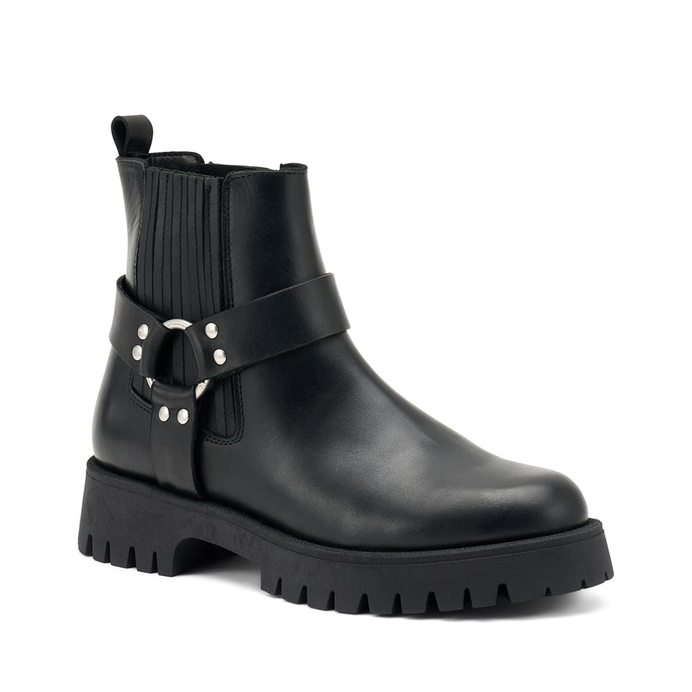 Stivaletto Frau donna in pelle di colore nero con accessorio e cinghie laterali nere. Doppio elastico laterale con inserti in pelle e fondo a carrarmato. Calzatura comoda MADE IN ITALY.
