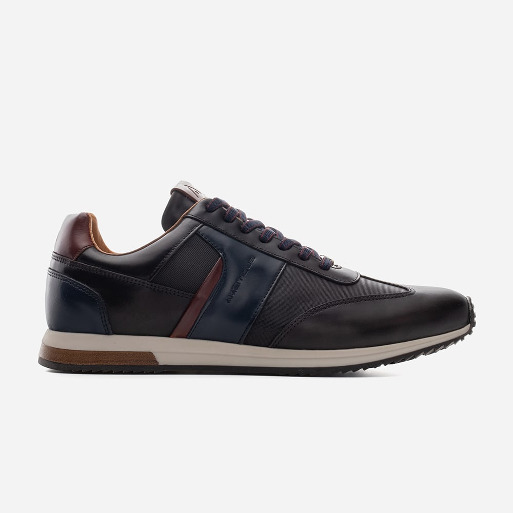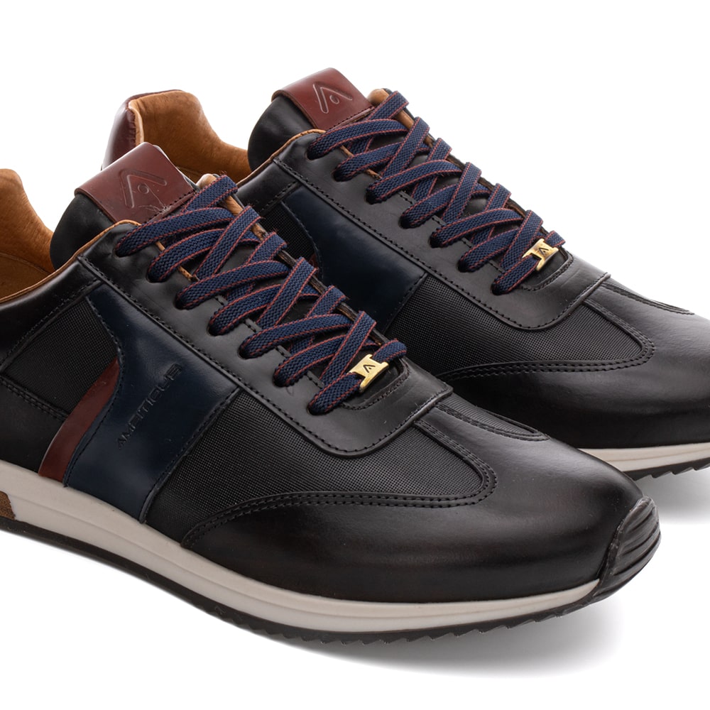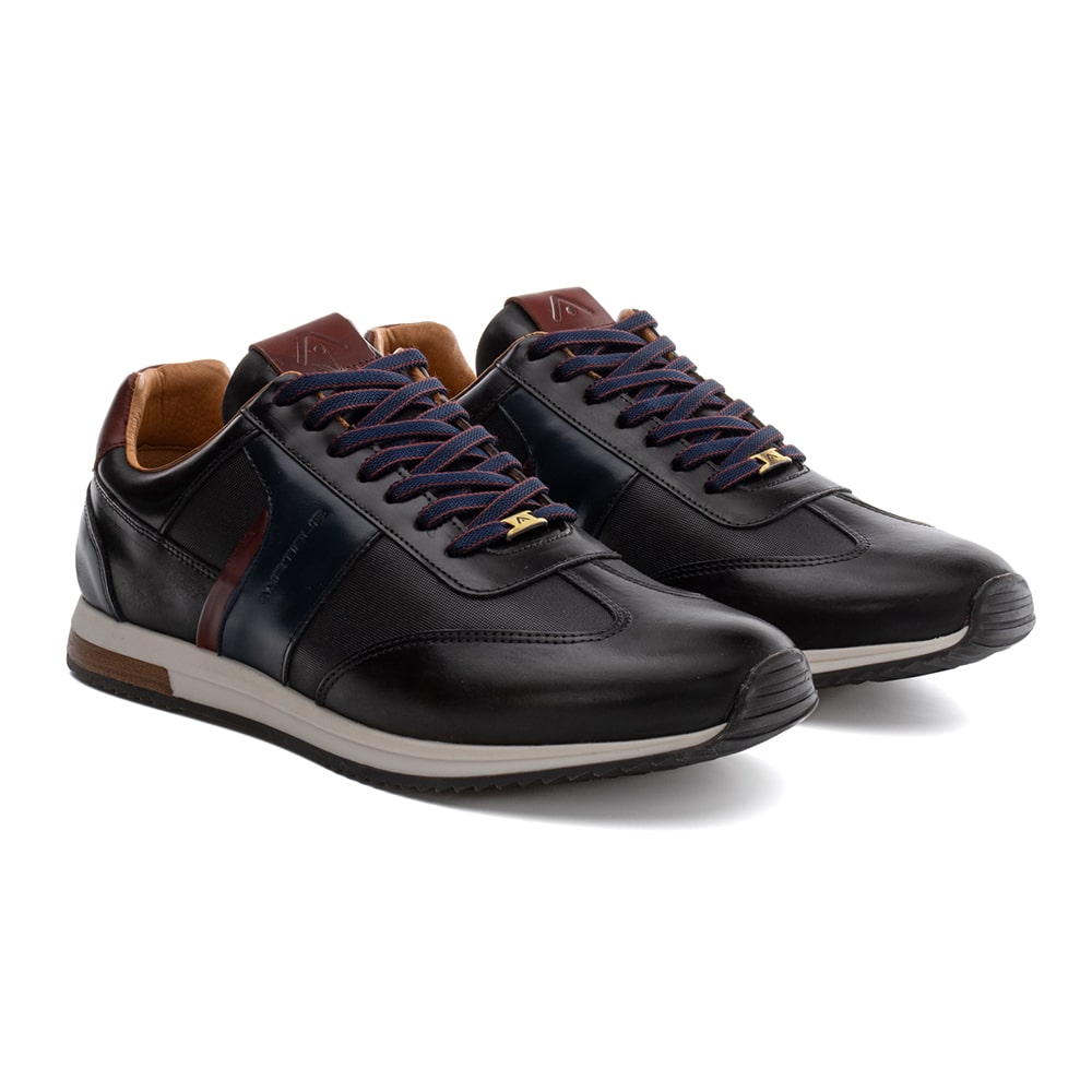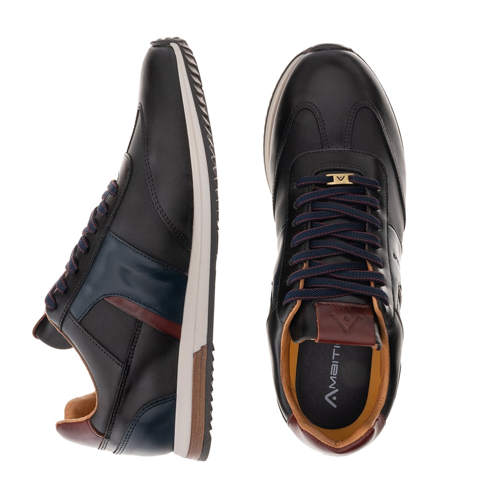 Sneakers uomo Ambitious Venture Performance Runner in pelle nera, riporti scamosciati neri e bianchi sul tallone. Calzatura unica che unisce lo stile Ambitious con la tecnologia Michelin, dove comfort e performance (massimo grip) si incontrano donando a chi la indossa una nuova esperienza di movimento.
