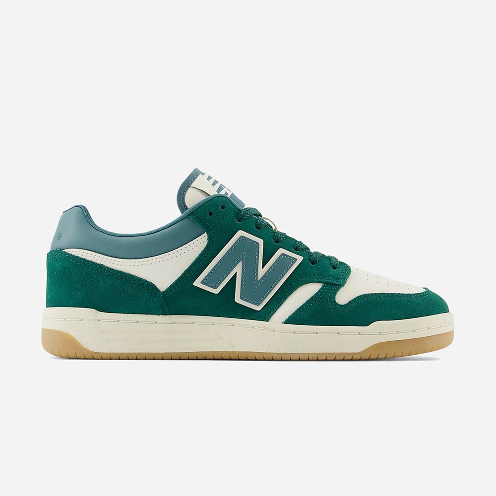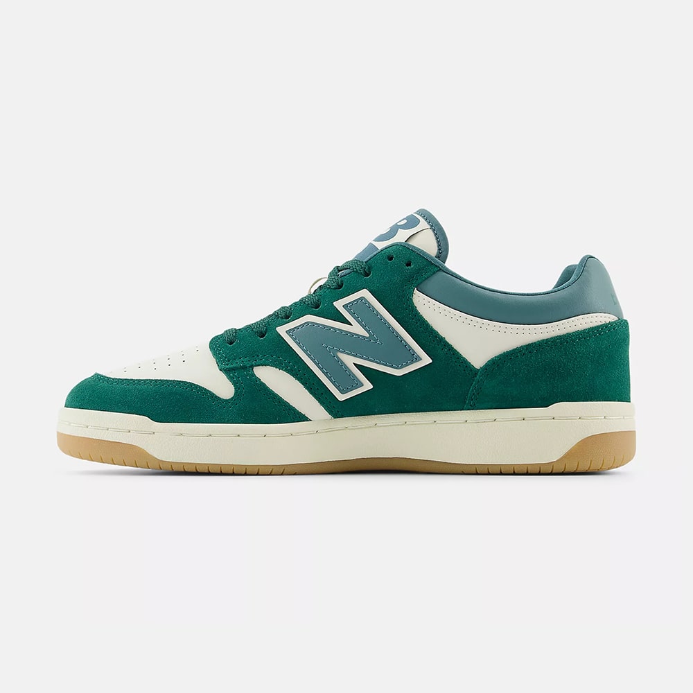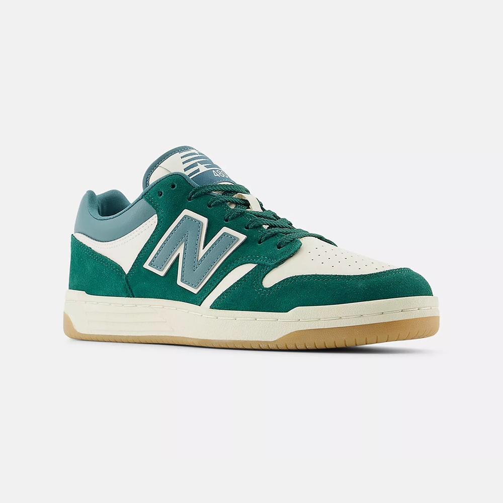 Sneakers uomo New Balance BB480LNG in pelle di colore bianco e riporti verdi, punta traforata, fondo gomma. Design classico dalle linee semplici e pulite, comodissime e leggere da indossare tutto il giorno.