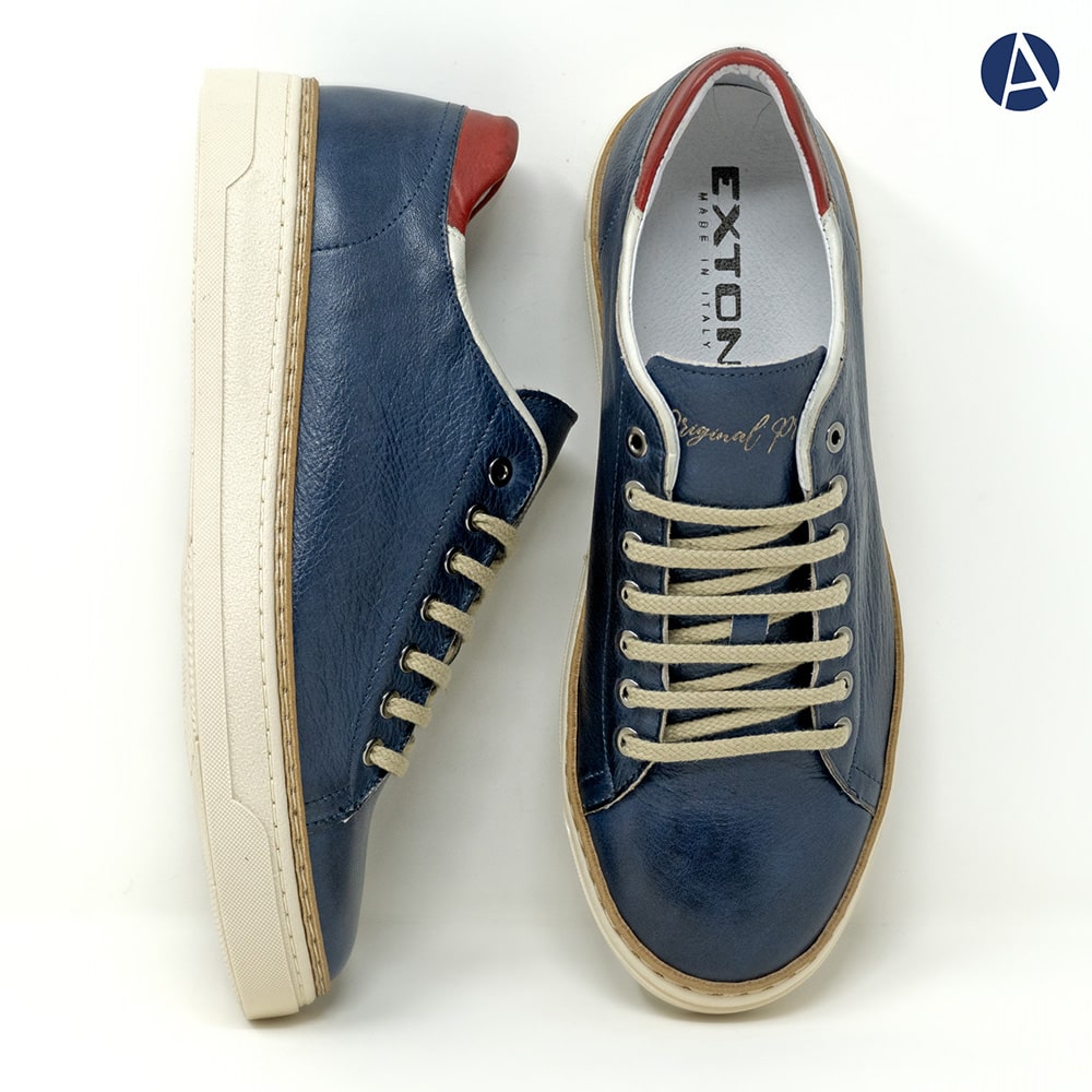 Sneakers Exton uomo in pelle colore blu oceano intrecciata con lacci blu e fondo a cassetta. MADE IN ITALY 100%.