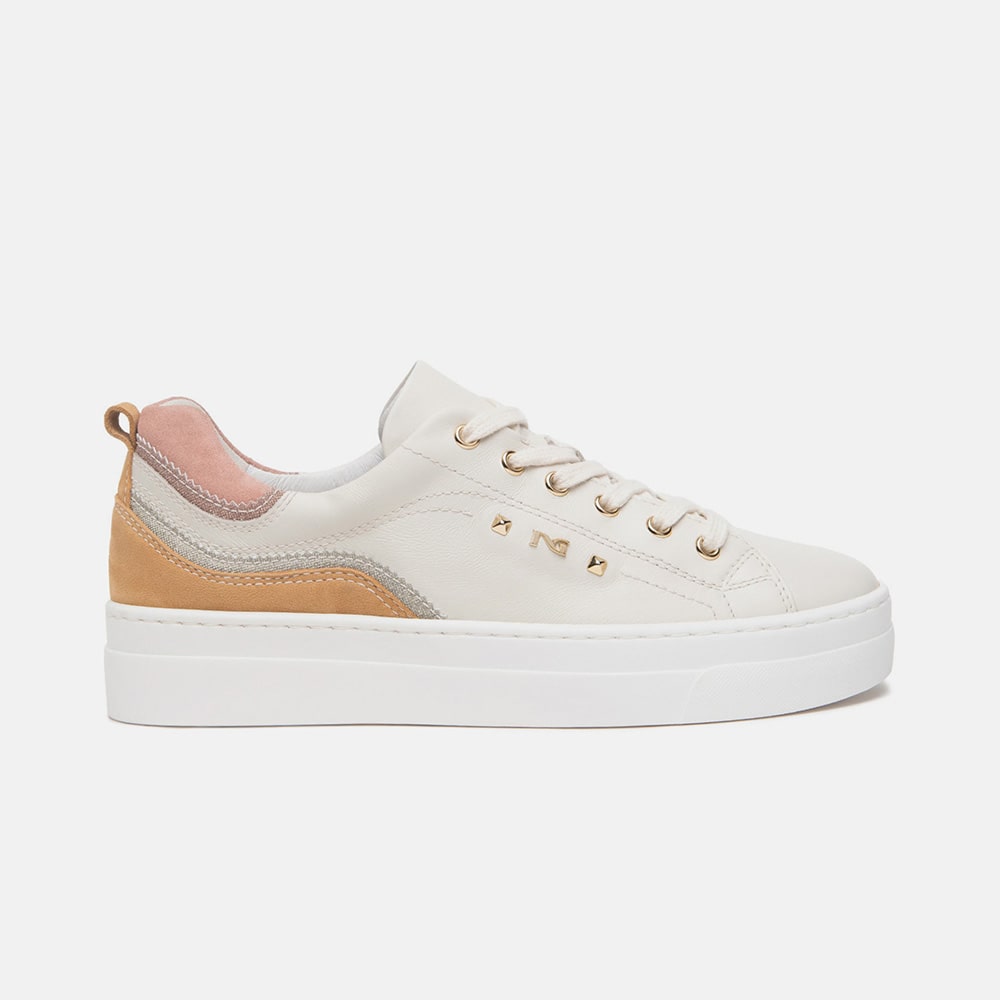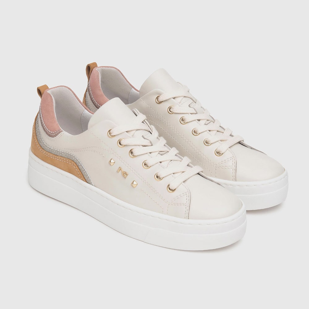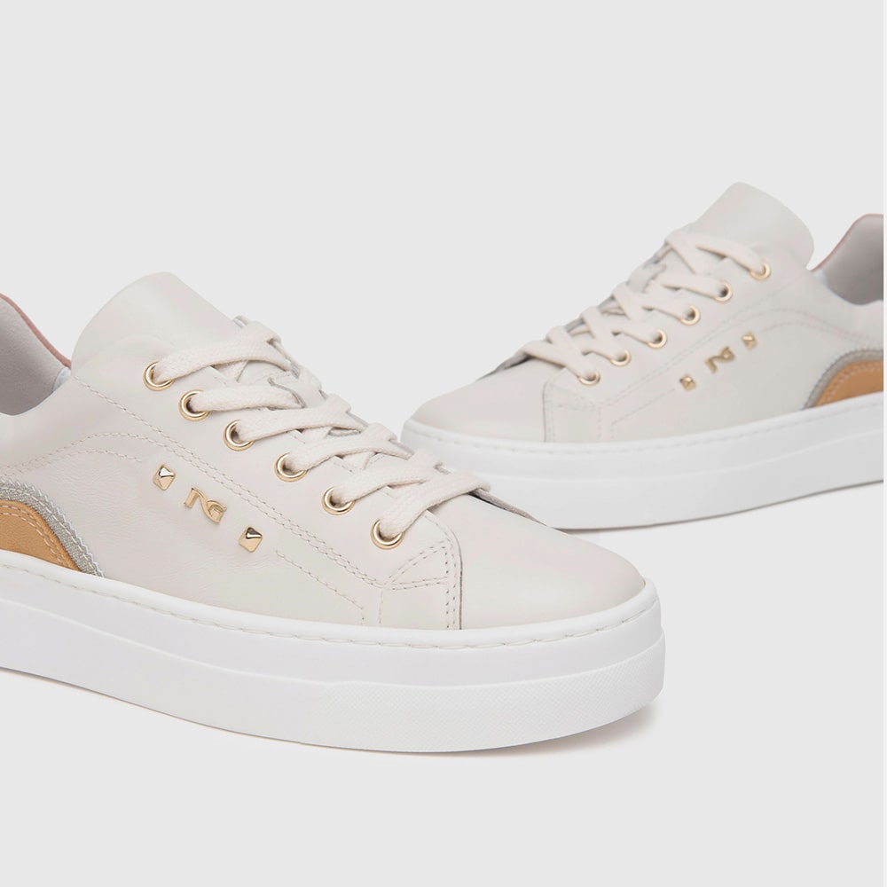 Sneakers donna NeroGiardini in pelle avorio, materiale tecnico e lacci, stampa logata laterale e fascia di colore cuoio. Tallone in laminato colore oro. Sneakers estremamente comode da indossare tutto il giorno realizzate con materiali di alta qualità. MADE IN ITALY