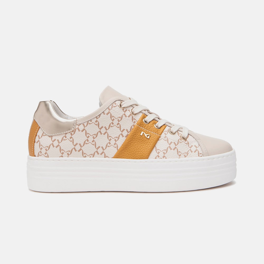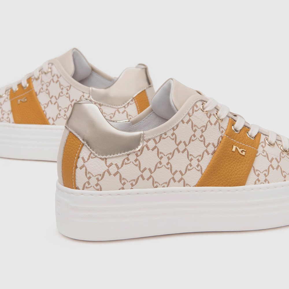 Sneakers donna NeroGiardini in pelle avorio, materiale tecnico, stampa logata, logo metallico e riporti in pelle sul tallone beige e platino. Sneakers alla moda estremamente comode da indossare realizzate con materiali di alta qualità. MADE IN ITALY
