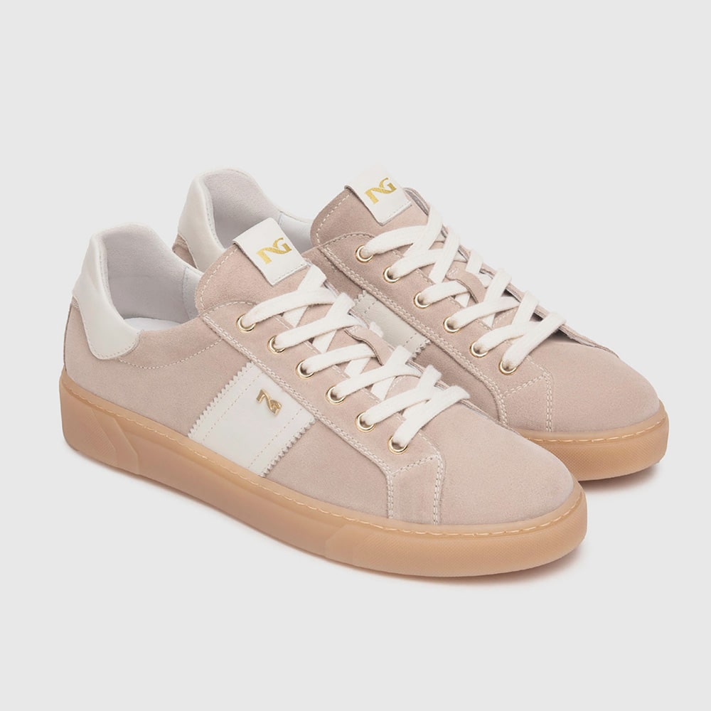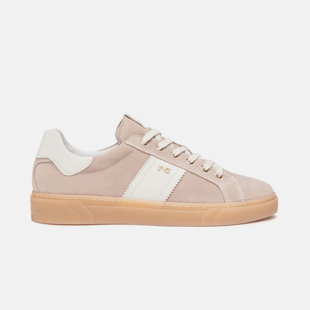 Sneakers donna NeroGiardini in pelle avorio, suede, materiale tecnico e lacci, riporti scamosciati di colore sigaro e rosa sul tallone, impreziositi da glitter che rendono la calzatura femminile e glamour. Sneakers estremamente comode da indossare realizzate con materiali di alta qualità. MADE IN ITALY