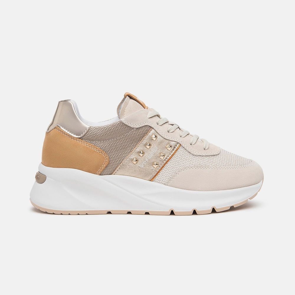 Sneakers donna NeroGiardini in pelle laminata e scamosciata beige, tessuto tecnico con frangia arricchita da due fasce di strass, fondo platform tacco 4,5 cm. Sneakers estremamente comode da indossare. MADE IN ITALY realizzate con materiali di alta qualità.