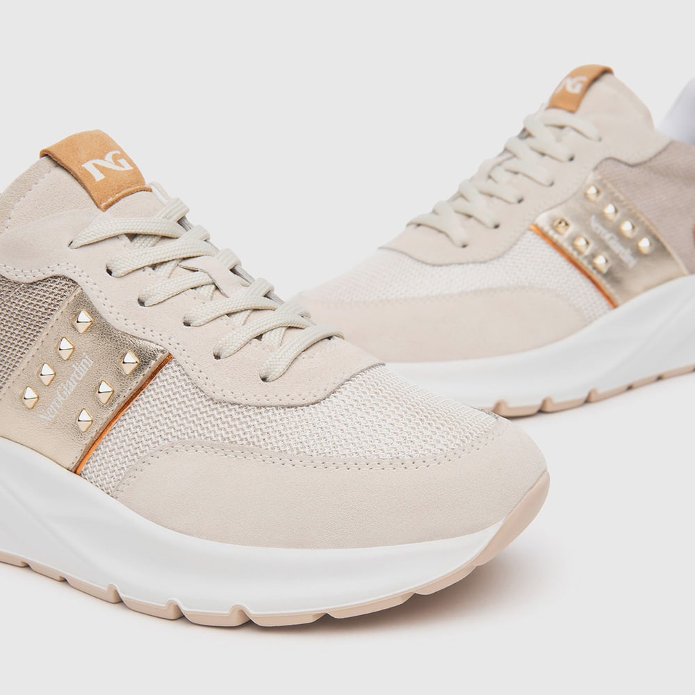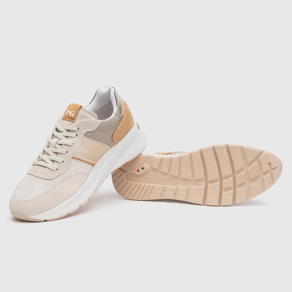 Sneakers donna NeroGiardini in pelle avorio, materiale tecnico e lacci, stampa logata laterale e fascia di colore cuoio. Tallone in laminato colore oro. Sneakers estremamente comode da indossare tutto il giorno realizzate con materiali di alta qualità. MADE IN ITALY