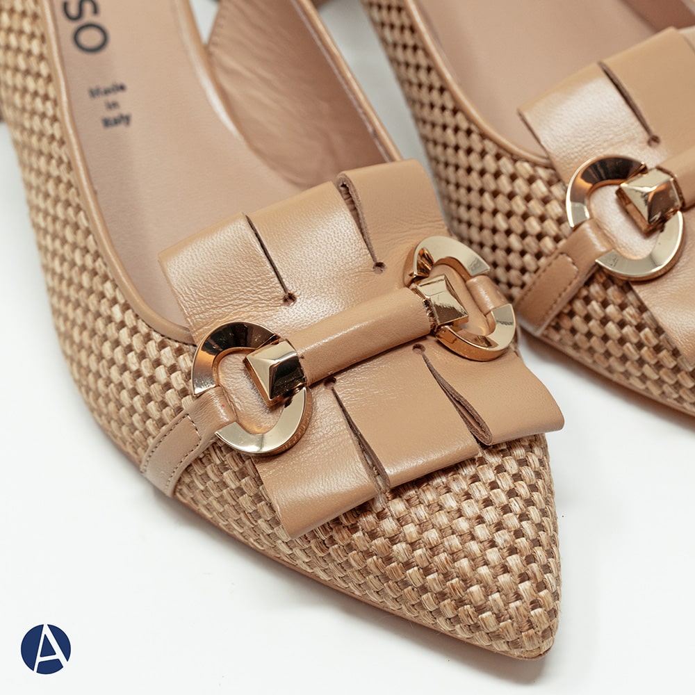 Décolleté donna slingback Melluso in pelle nude e bianco, con doppia fibbia a contrasto sulla punta, cinturino laterale con fibbia dorata che consente una regolazione della calzata. Tacco a rocchetto 5 cm, fondo cuoio. Elegante calzatura per le tue occasioni speciali. Plantare: il sottopiede interno è realizzato in memory foam per offrire una comoda calzata. MADE IN ITALY