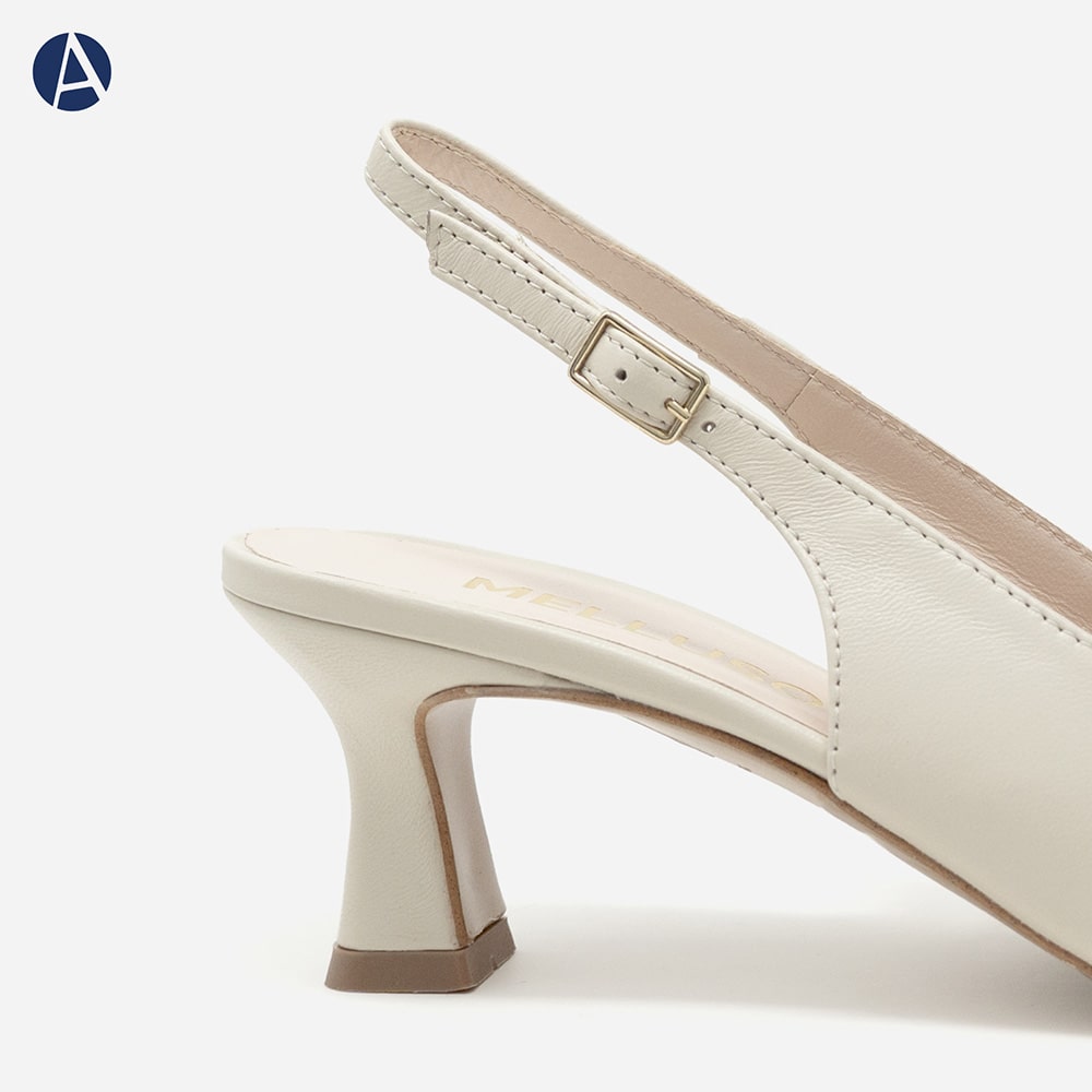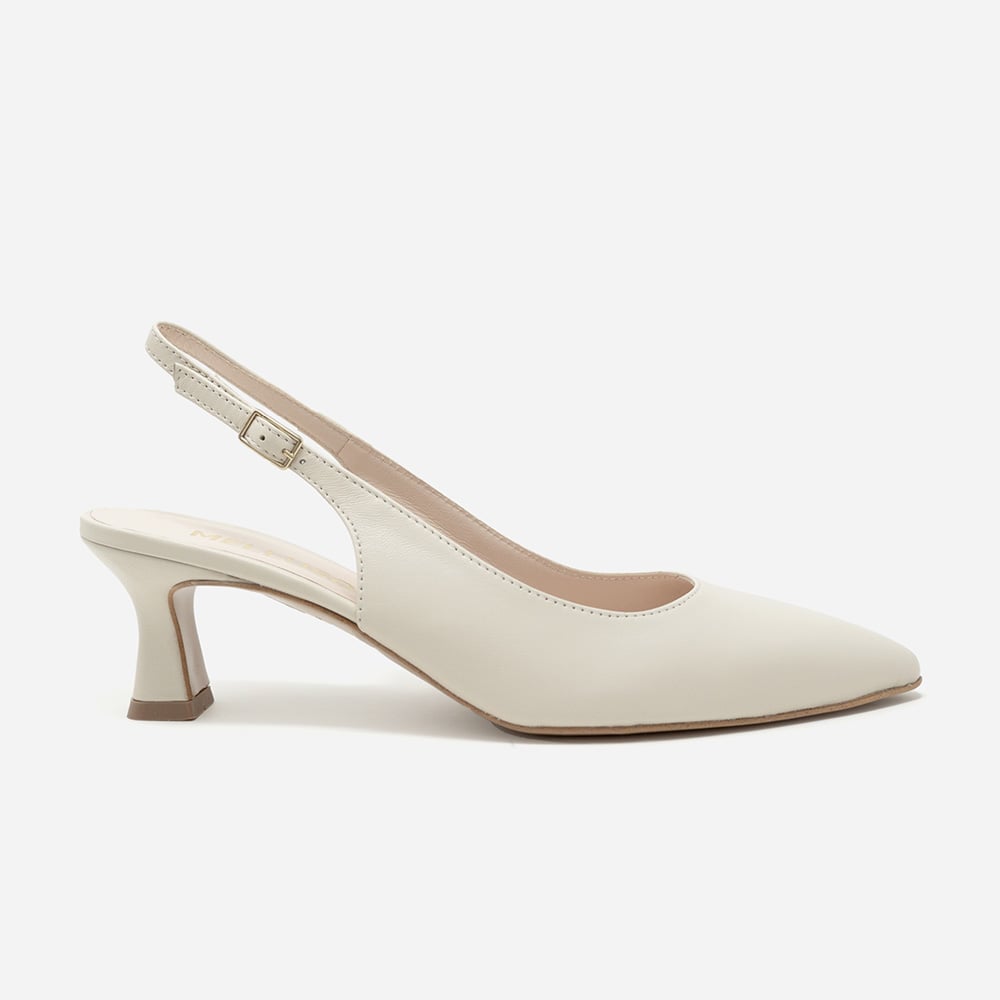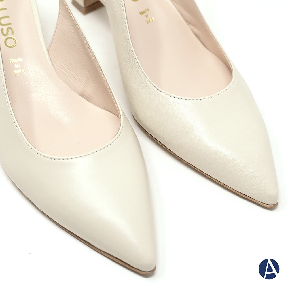 Décolleté donna slingback Melluso in pelle nude e bianco, con doppia fibbia a contrasto sulla punta, cinturino laterale con fibbia dorata che consente una regolazione della calzata. Tacco a rocchetto 5 cm, fondo cuoio. Elegante calzatura per le tue occasioni speciali. Plantare: il sottopiede interno è realizzato in memory foam per offrire una comoda calzata. MADE IN ITALY