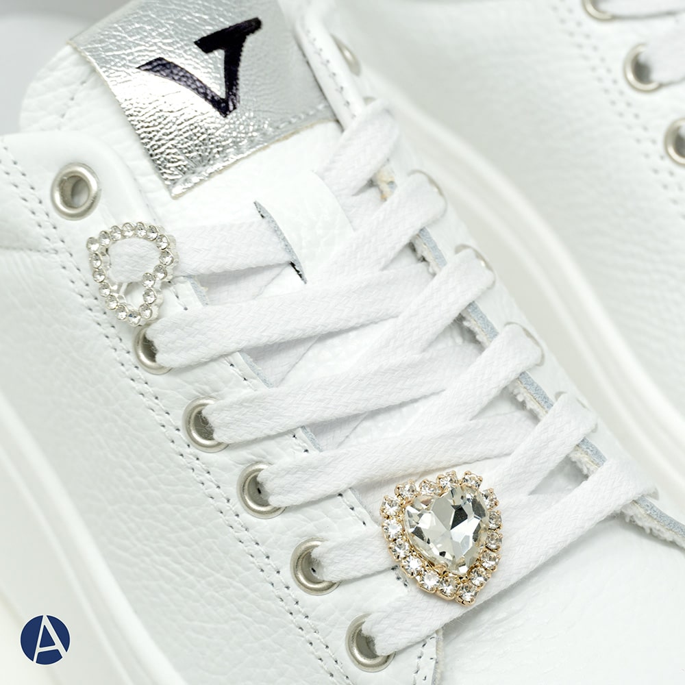 Sneakers donna VITAMINA TU in pelle di colore bianca con inserti in pelle scamosciata beige e platino. Riporti glitter dorato sul tallone. Calzatura perfetta con i jeans ed outfit informali.