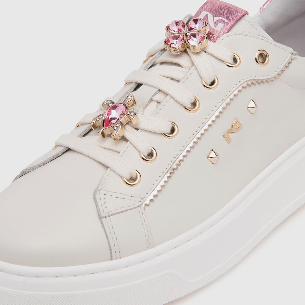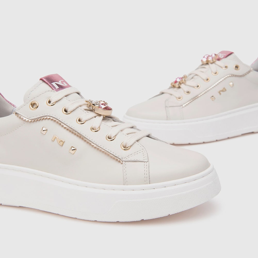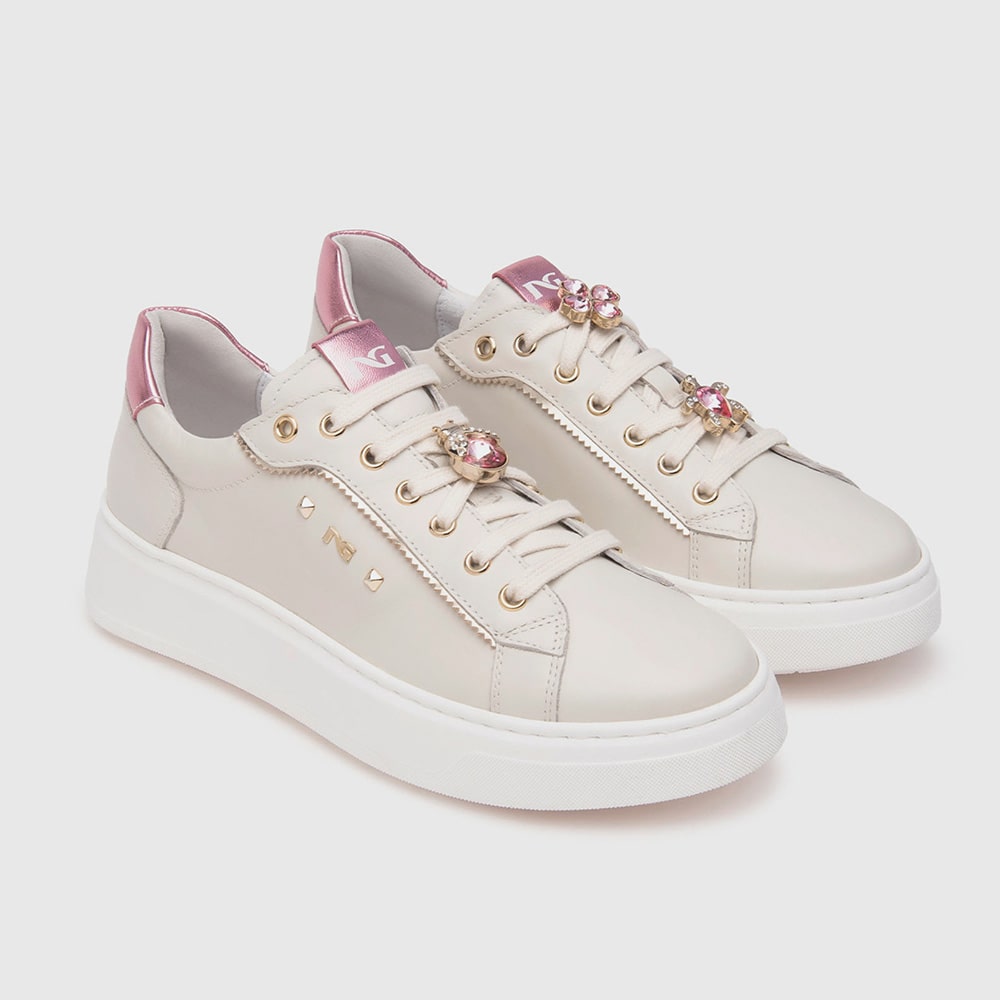 Sneakers donna NeroGiardini realizzate in pelle avorio e materiale tecnico con riporti platino e accessorio dorato con strass rosa sui lacci e riporti metallizati rosa sul tallone. Sneakers estremamente comode da indossare tutto il giorno, realizzate con materiali di alta qualità. MADE IN ITALY