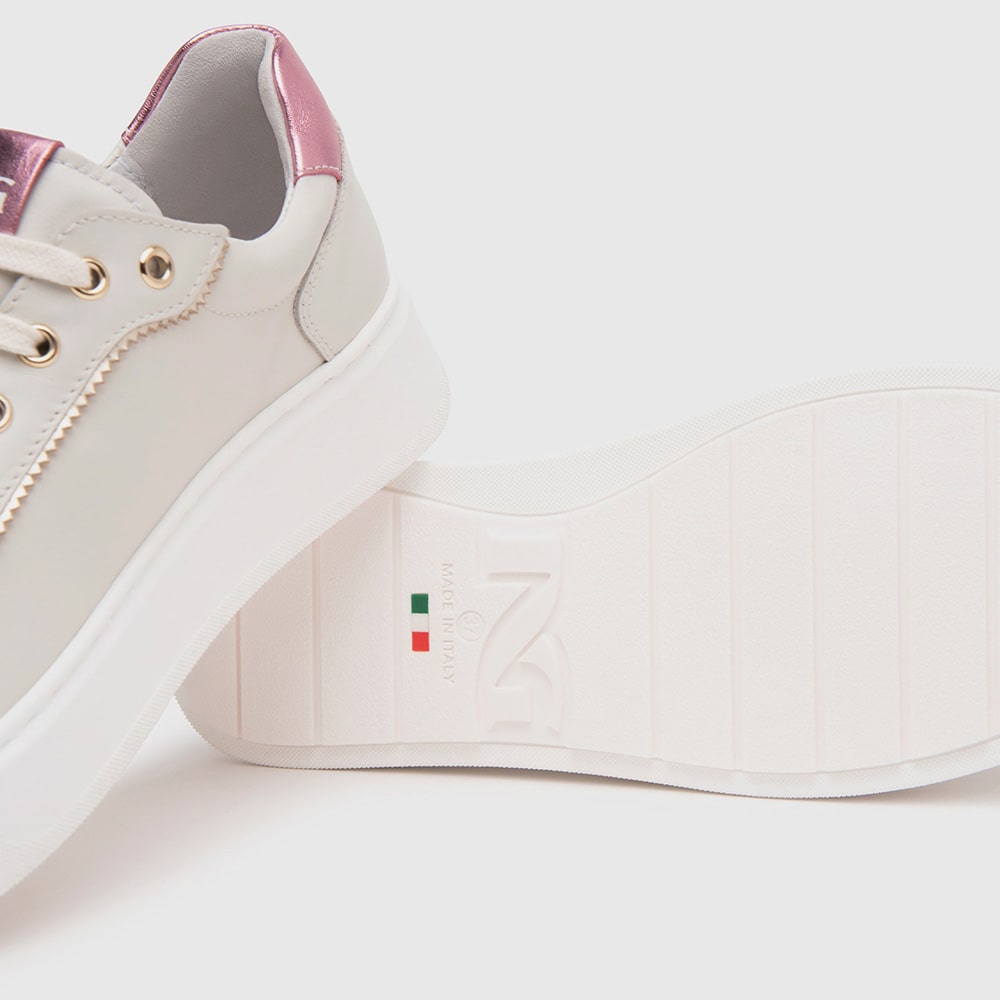 Sneakers donna NeroGiardini in pelle bianca con lacci, riporti laminato platino sul tallone e pelle scamosciata sui toni del rosa. Fondo platform e tacco 4 cm. Sneakers estremamente comode da indossare. MADE IN ITALY realizzate con materiali di alta qualità.