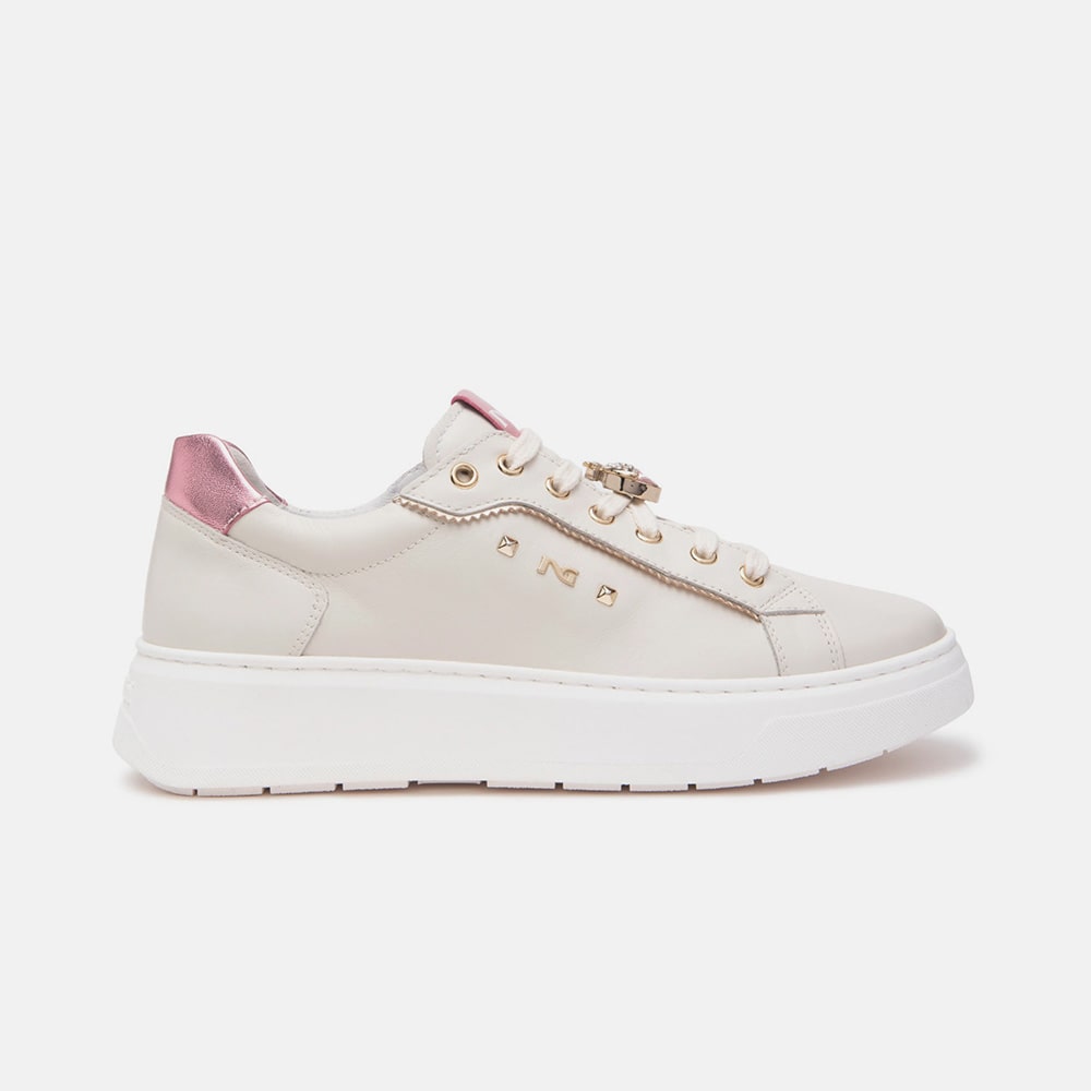 Sneakers donna NeroGiardini in pelle bianca, lacci, fondo platform, riporti colore rosa sul tallone e accessorio con logo laterale gold e trass di pietre colorate. Sneakers MADE IN ITALY realizzate con materiali di alta qualità.