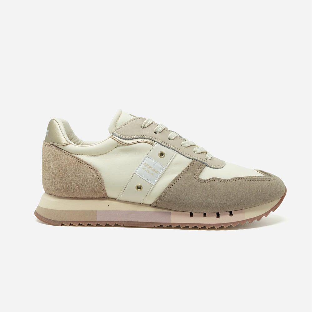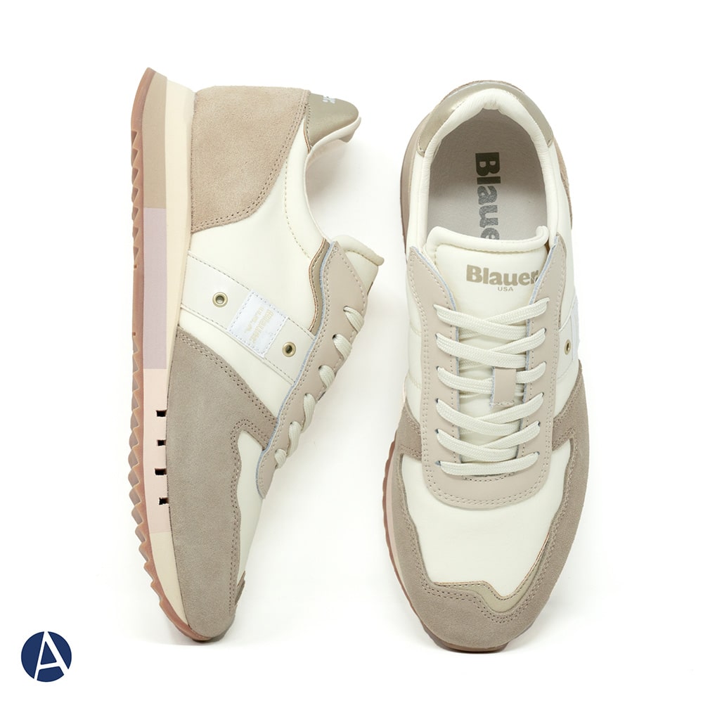 Sneakers Blauer donna in tessuto tecnico di colore beige con logo laterale, riporti di colore platino e avorio, fondo running colorato. Sneakers dal design innovativo, struttura leggera e traspirabile, comodissima da indossare tutto il giorno oppure perfetta per il tuo outfit sportivo.