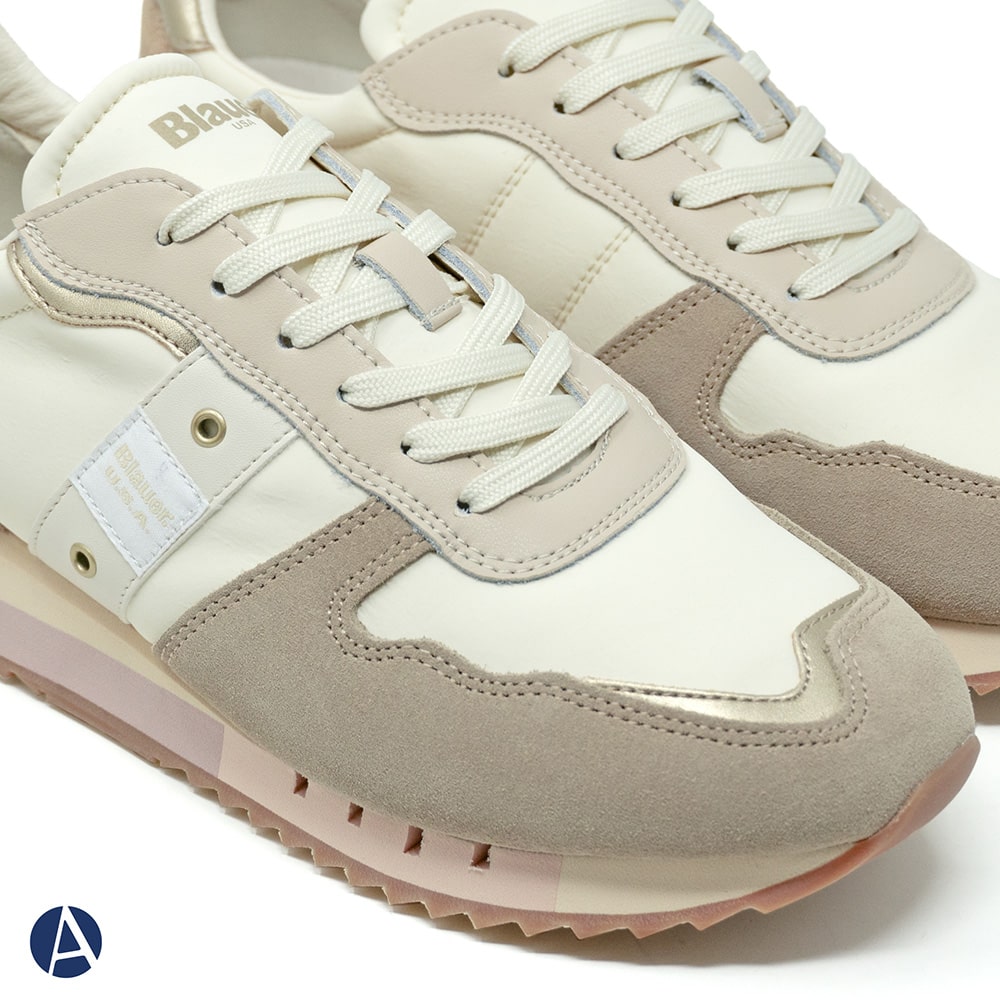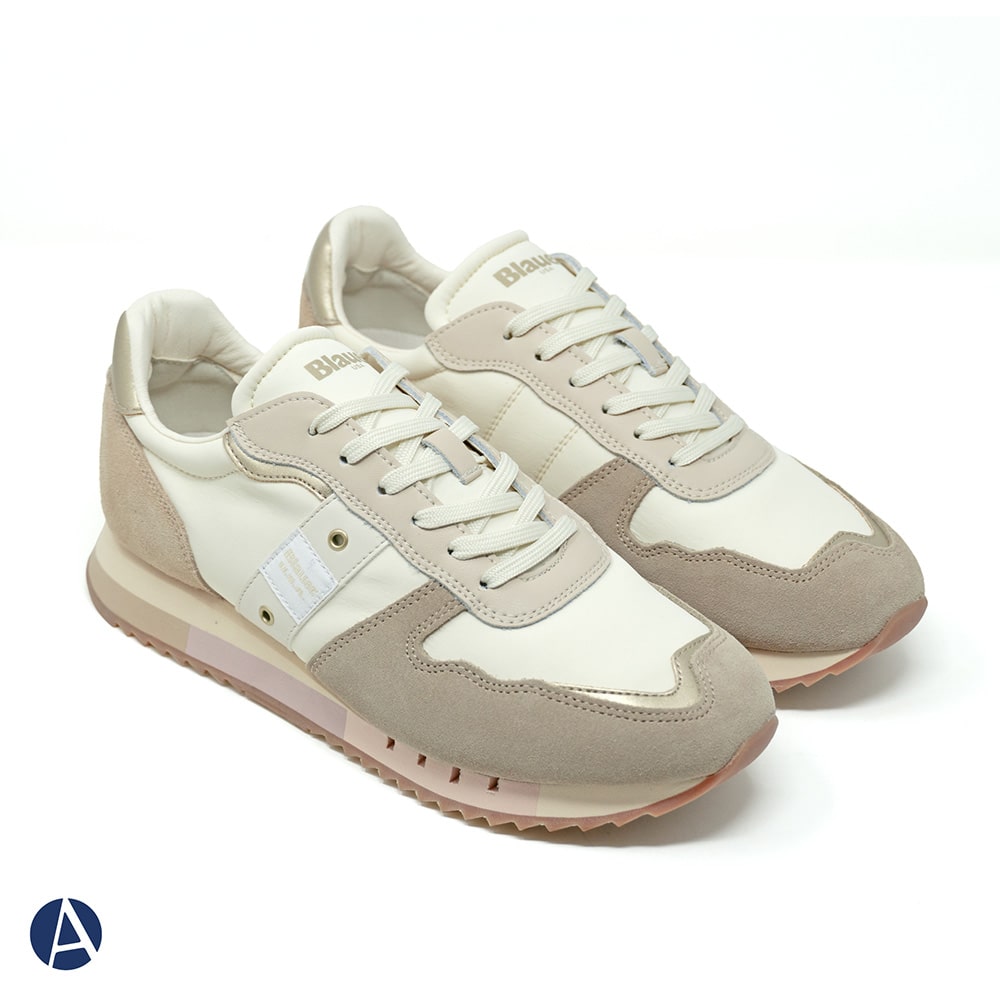 Sneakers Blauer donna con riporti in pelle e tessuto tecnico di colore avorio, fascia laterale in pelle scamosciata di colore grigio con logo e riporti in pelle di colore rosa e oro sul tallone. Fondo running. Comodissima e leggera da indossare tutto il giorno oppure perfetta per il tuo outfit sportivo.