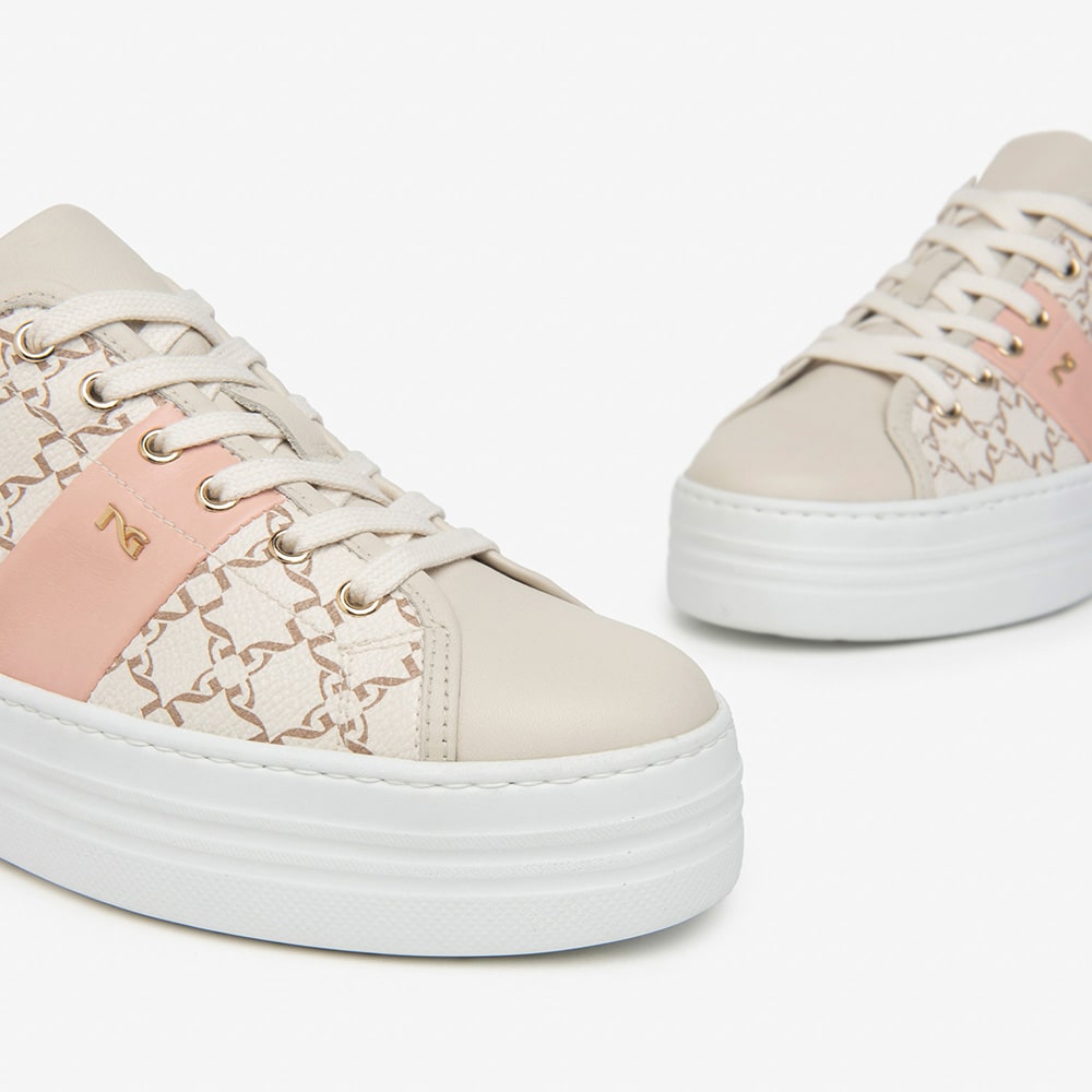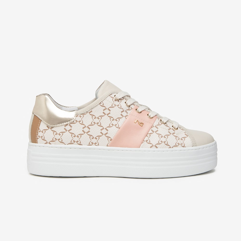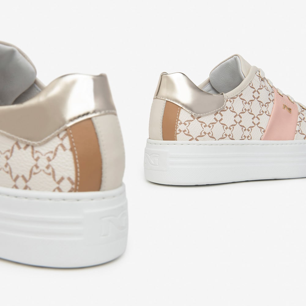 Sneakers donna NeroGiardini in pelle avorio, materiale tecnico, stampa logata, logo metallico e riporti in pelle sul tallone beige e platino. Sneakers alla moda estremamente comode da indossare realizzate con materiali di alta qualità. MADE IN ITALY