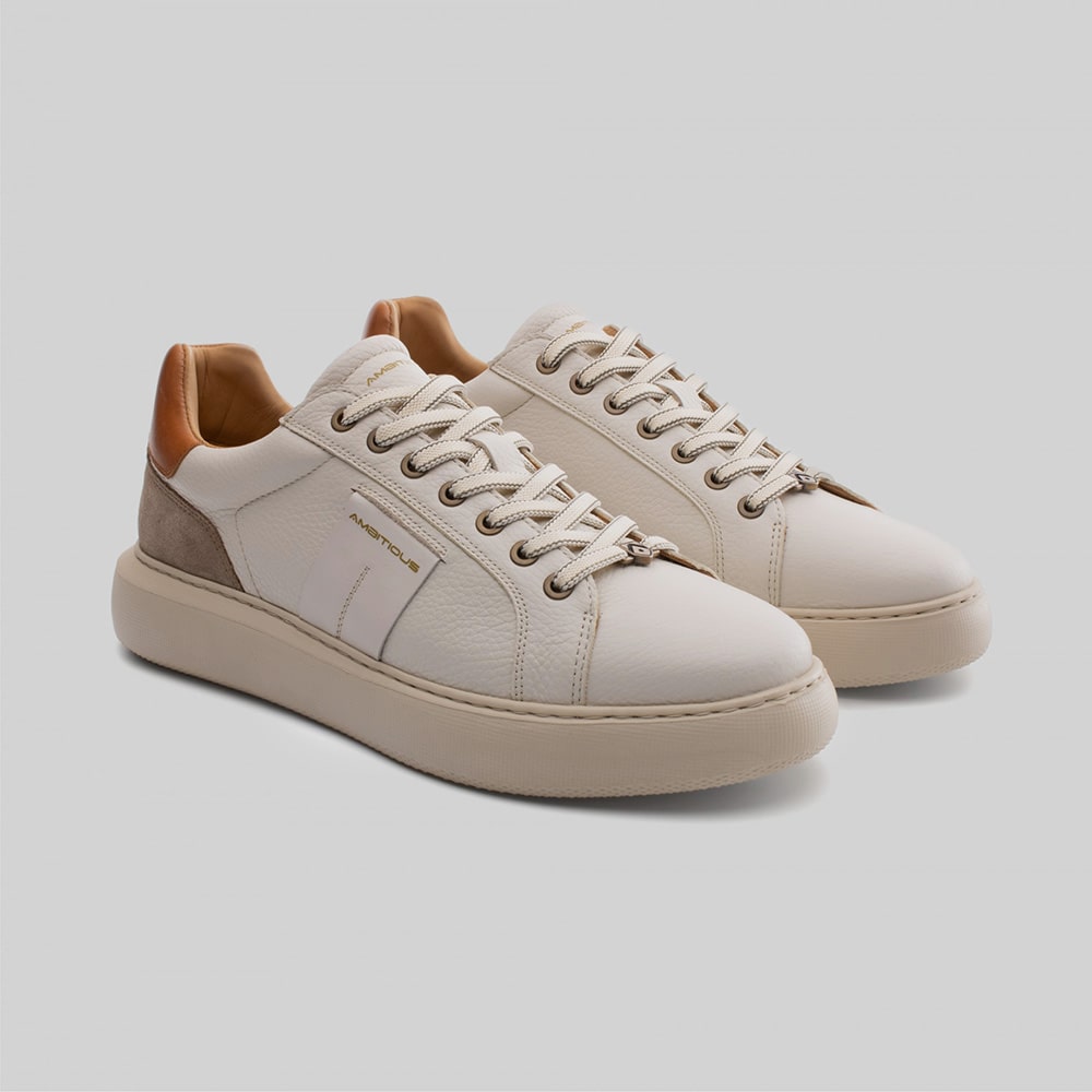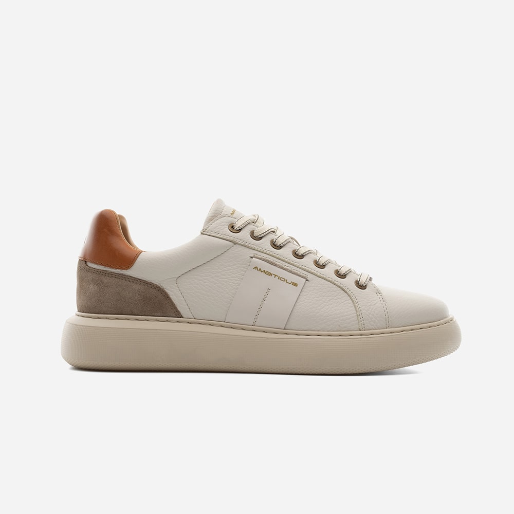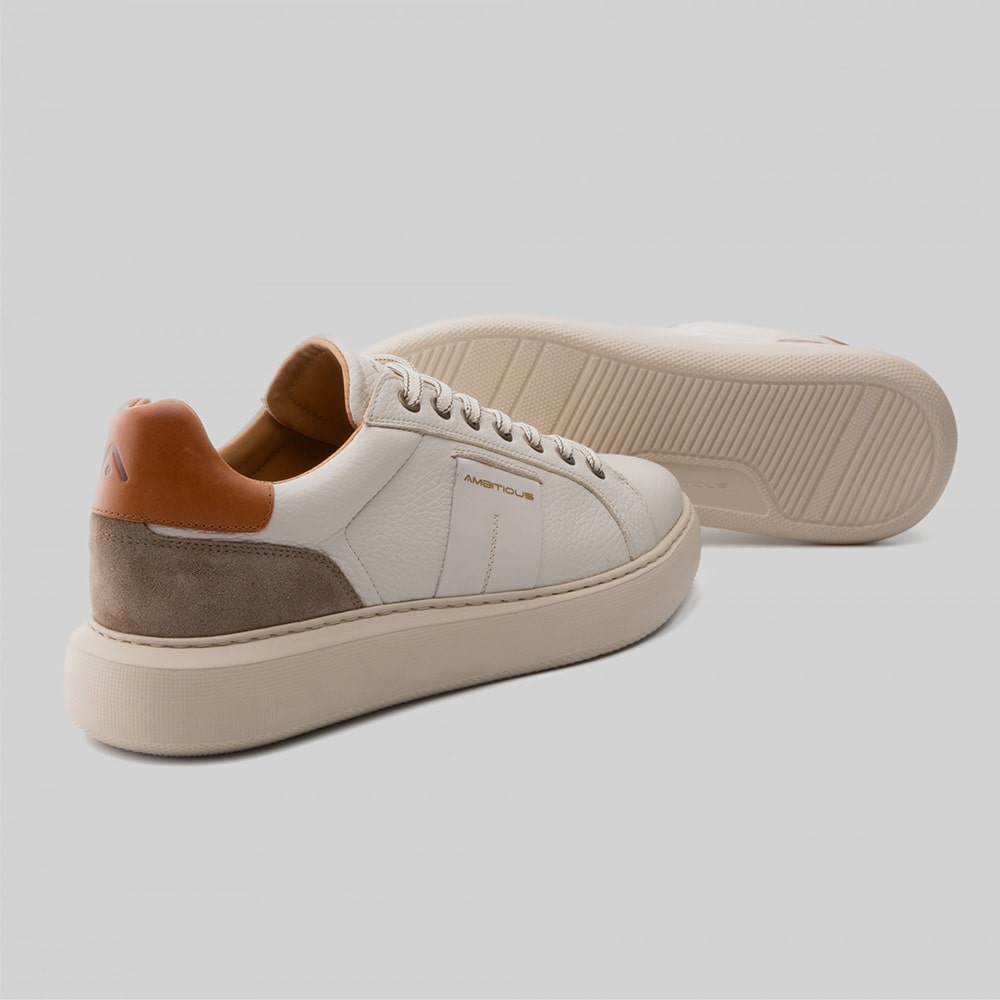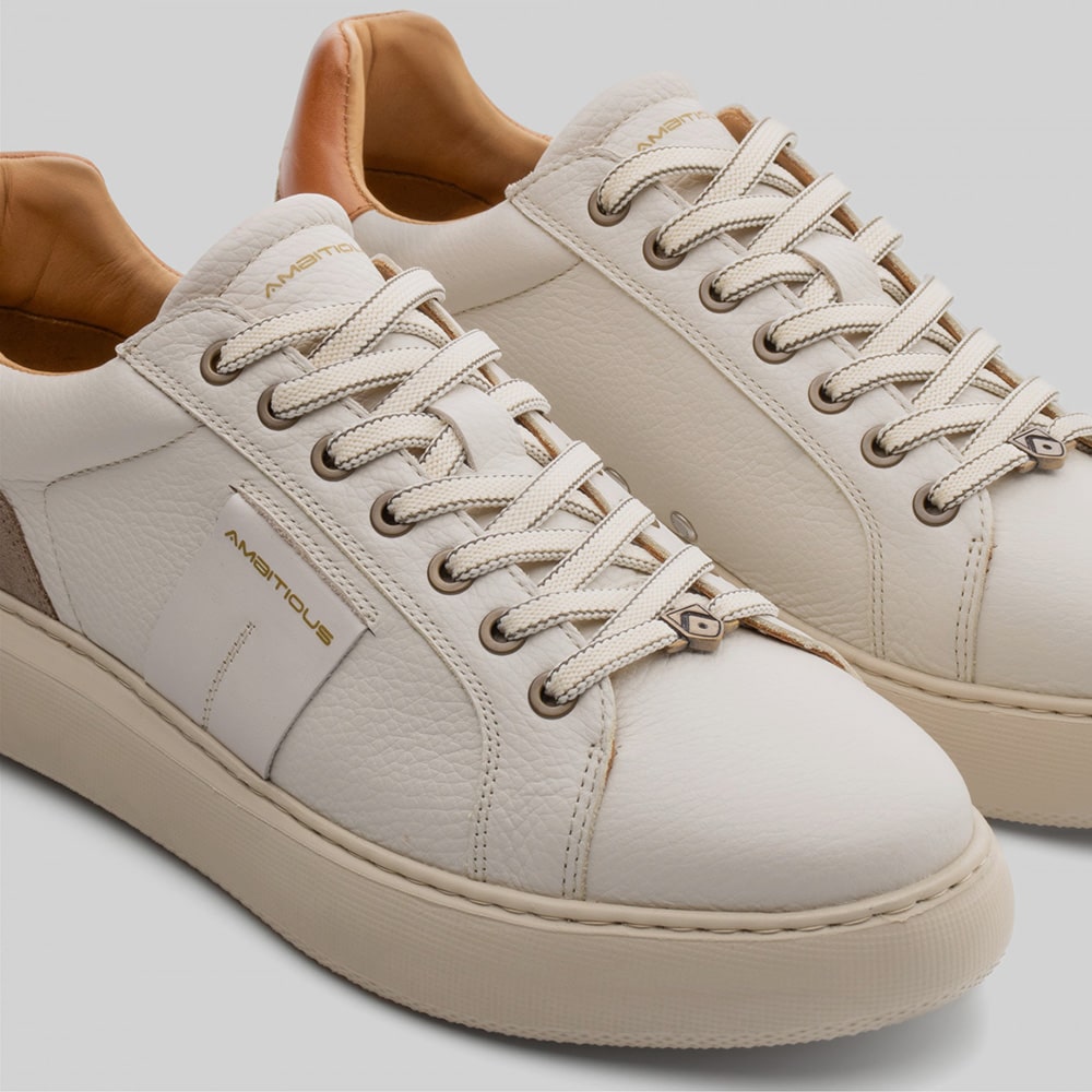 Sneakers uomo Ambitious Kit Low-Top in pelle colore bianca con lacci, tomaia laterale microforata e fodera all'interno (doppi lacci in dotazione), riporti sul tallone di colore cuoio. Calzatura leggerissima e minimale con profili eleganti e cura dei dettagli.