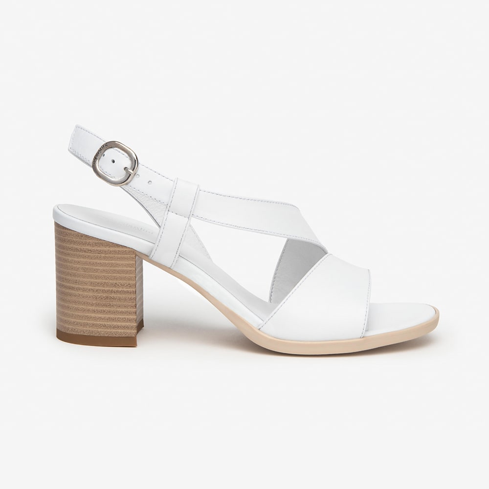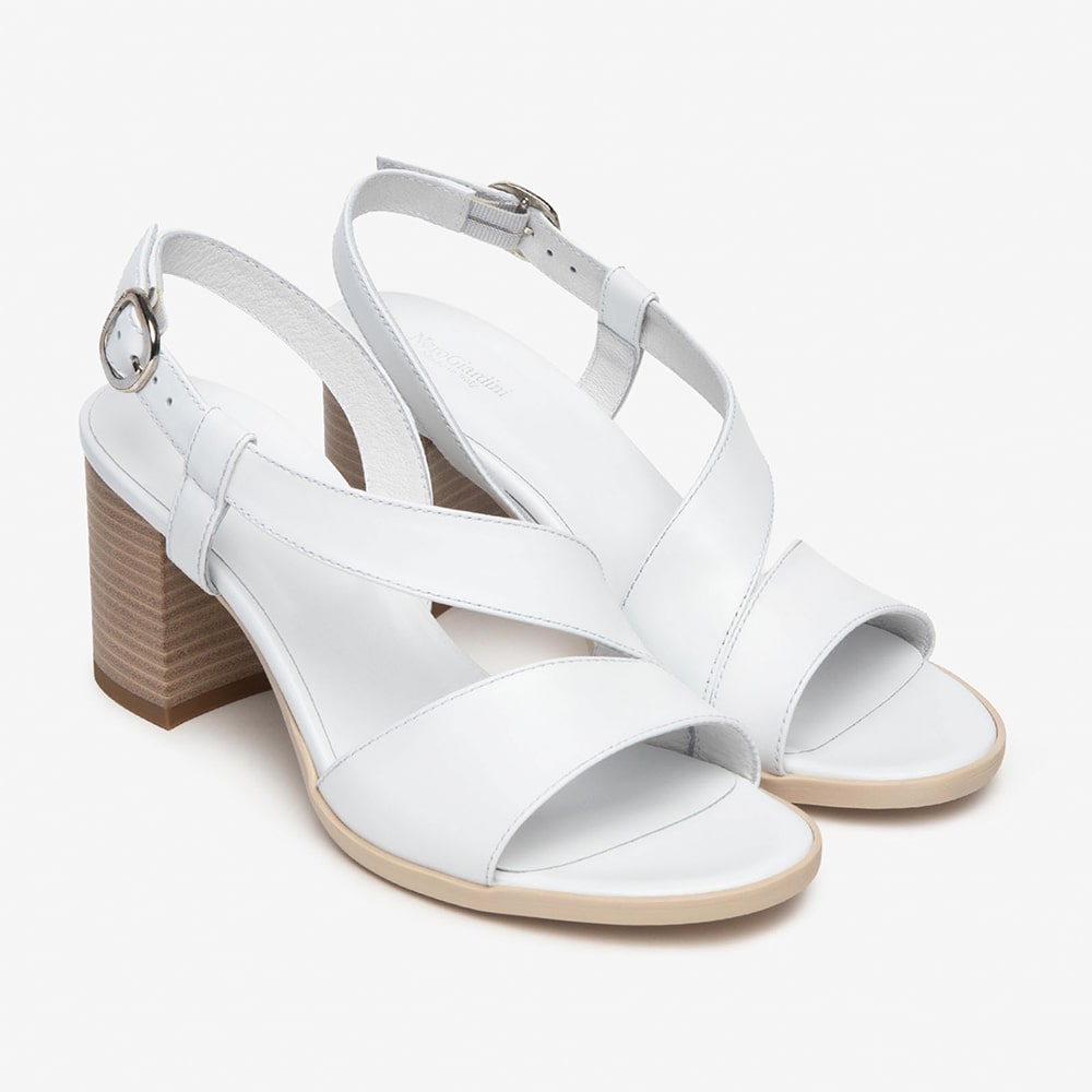 Sandalo donna NeroGiardini in pelle di colore bianco, cinturino alla caviglia con fibbia in tinta. Design raffinato per un look sofisticato e moderno, tacco a blocco 5 cm e fondo in gomma. Calzatura MADE IN ITALY.