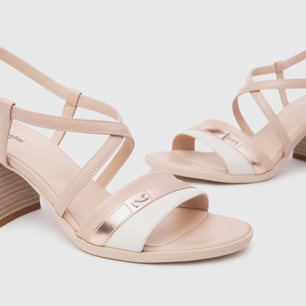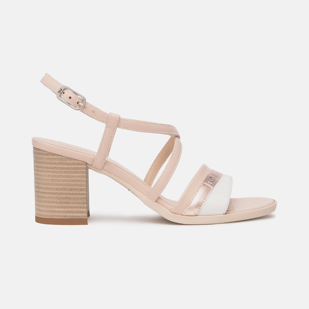 Sandalo donna NeroGiardini in pelle e materiale tecnico di colore beige e bianco, riporti in laminato nude, cinturino trasversare alla caviglia e sottopiede imbottito. Tacco basso a blocco 2,5 cm, fondo in gomma. Design essenziale e raffinato per sandali comodissimi da indossare tutto il giorno. MADE IN ITALY