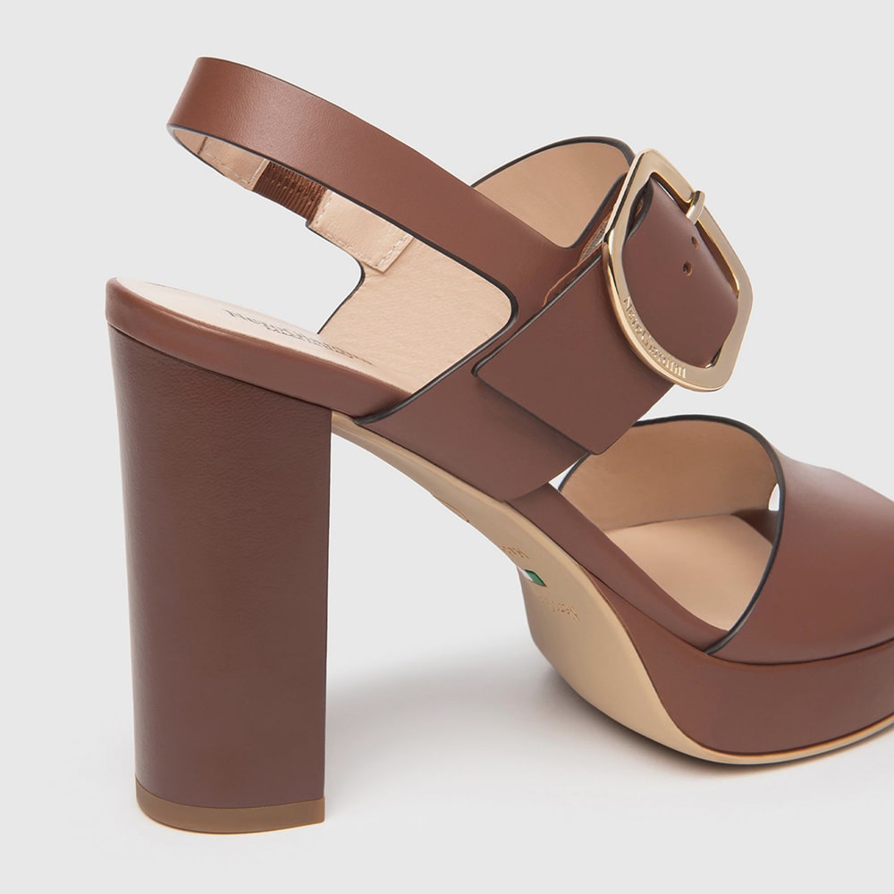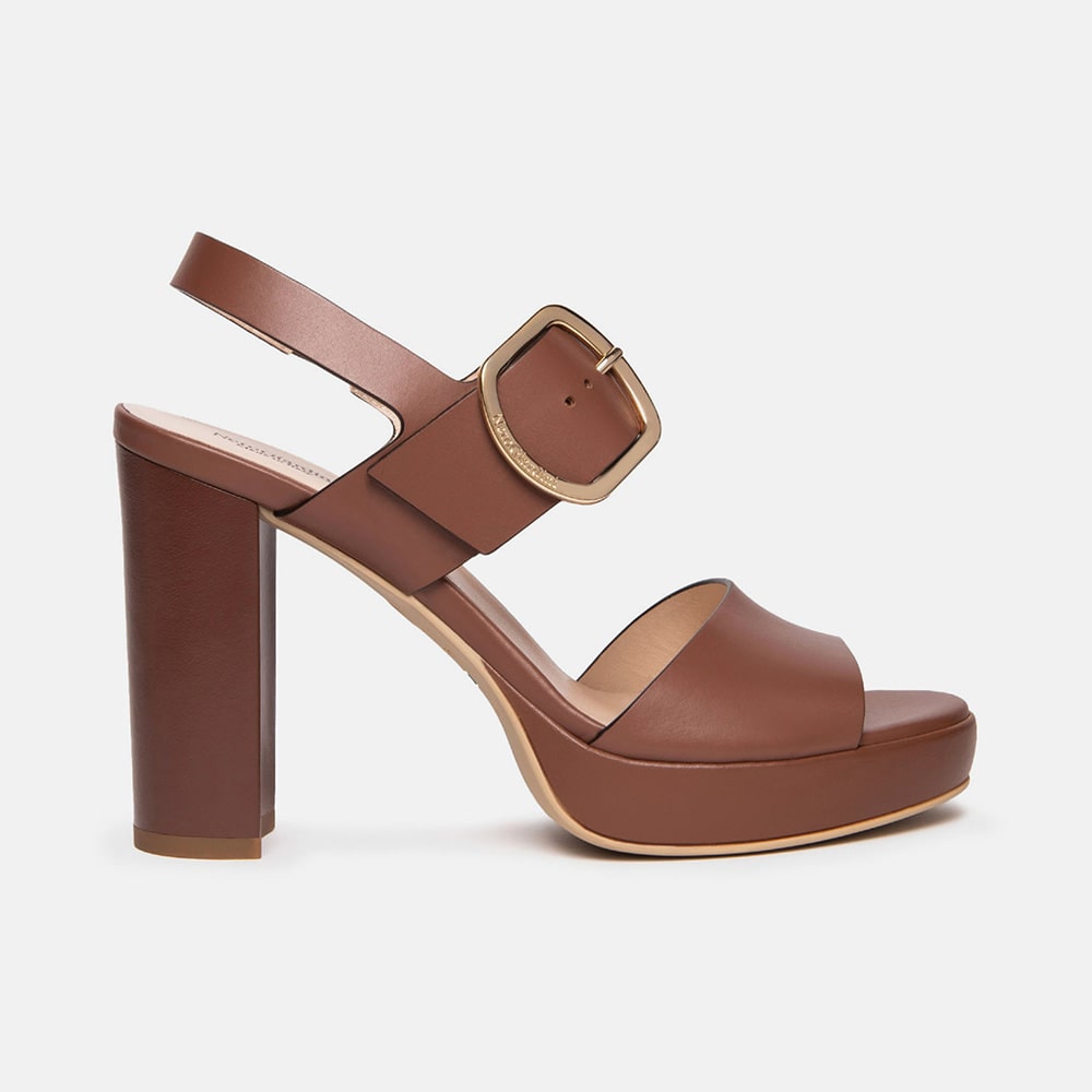 Sandalo donna NeroGiardini in pelle con fasce interecciate di colore cuoio e cinturino platino che avvolge la caviglia. Tacco con zeppa alta 7,5 cm, fondo in gomma. Calzatura comodissima dal design moderno e ricercato. MADE IN ITALY