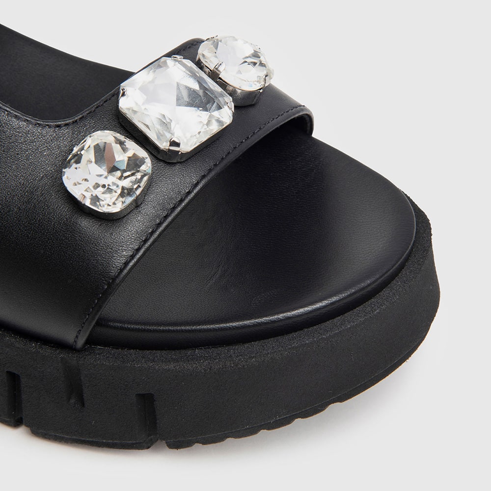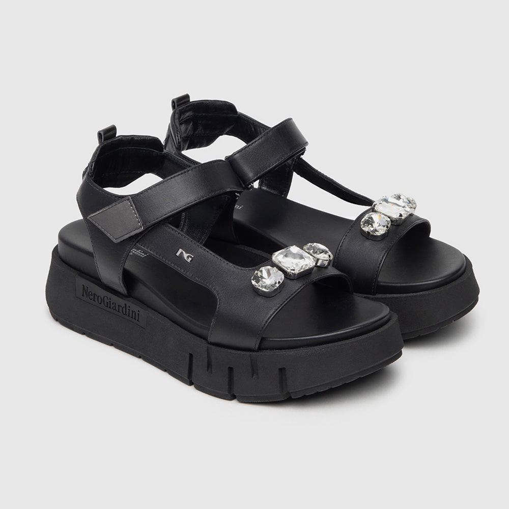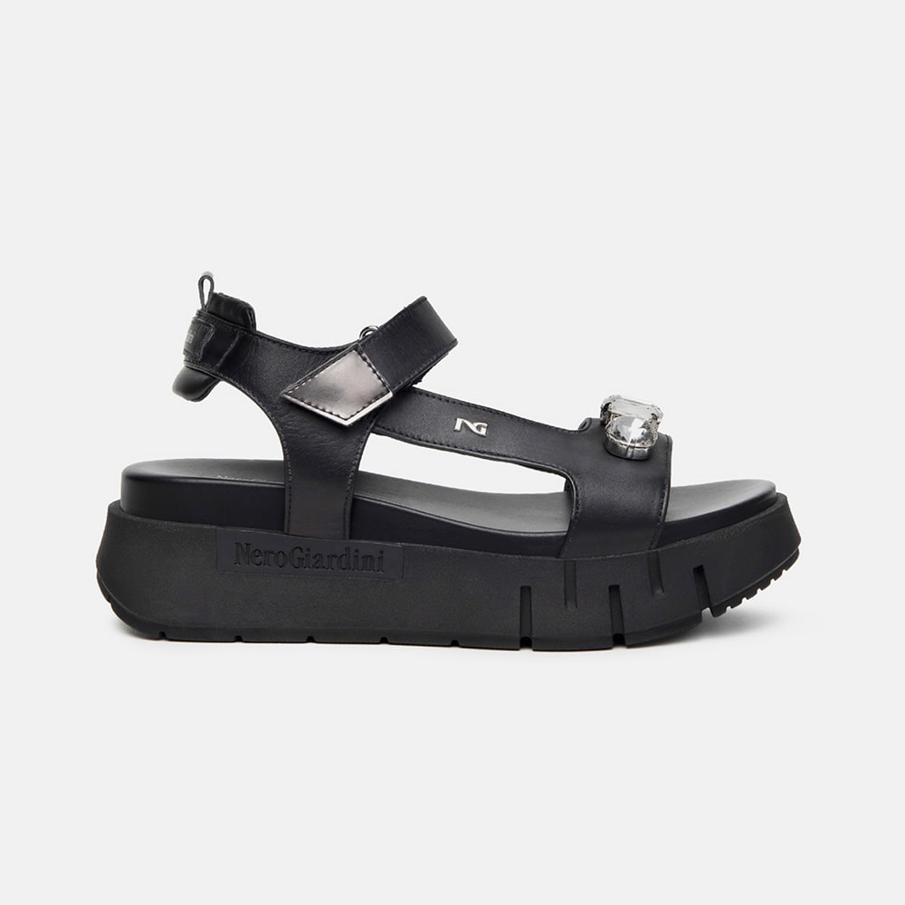 Sandalo donna NeroGiardini in pelle di colore nero con cinturino alla caviglia e sottopiede imbottito. Sulla fascia elementi decorativi di strass, fondo platform in gomma, tacco 3,5 cm. Sandalo dal design essenziale da indossare tutto il giorno. MADE IN ITALY
