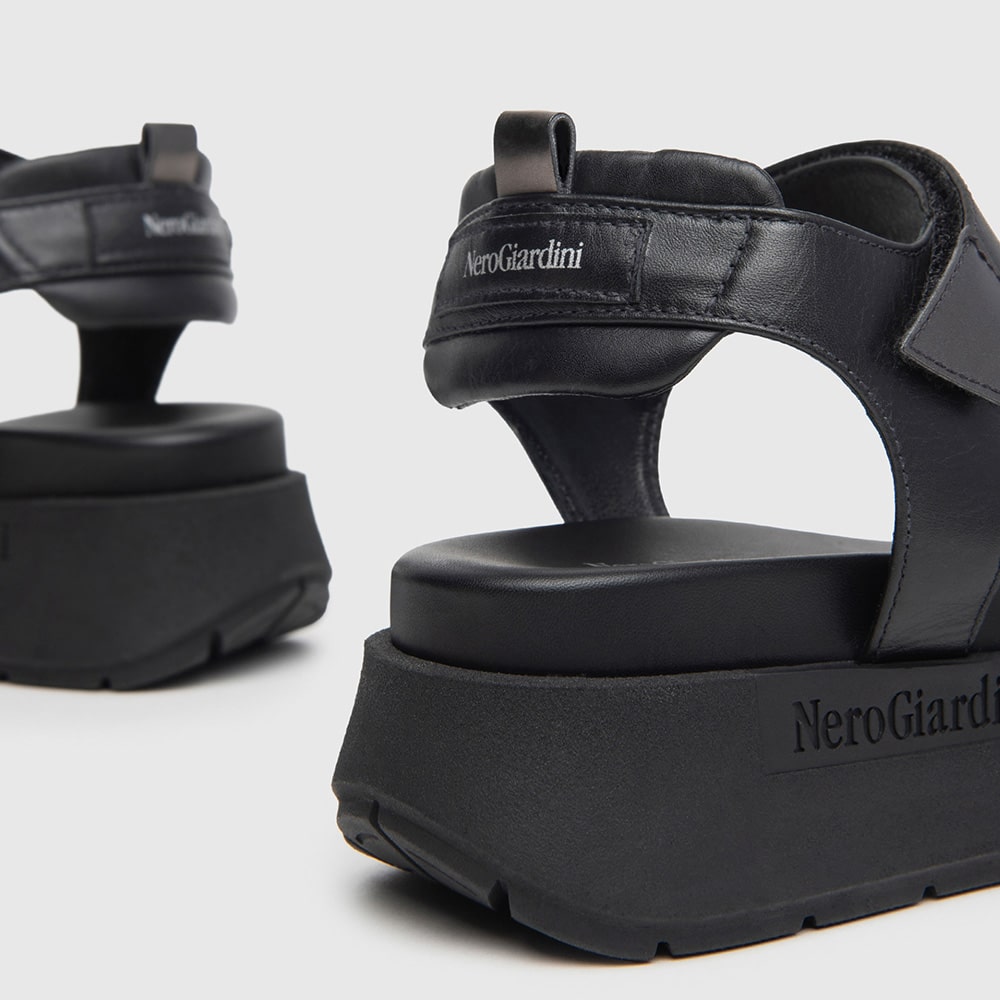 Sandalo donna NeroGiardini in pelle di colore nero con plateau e doppio cinturino che avvolge il collo del piede. Design raffinato per un look sofisticato e moderno. Fondo in gomma. Calzatura MADE IN ITALY