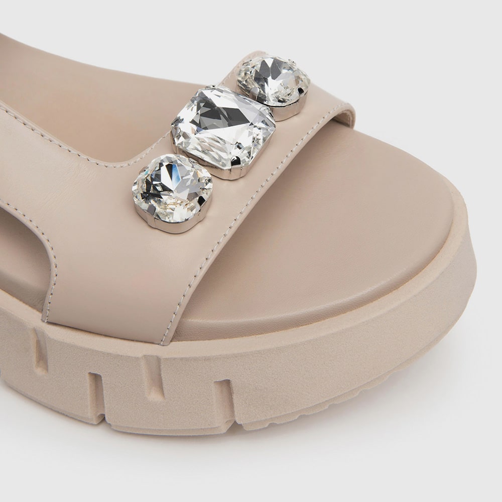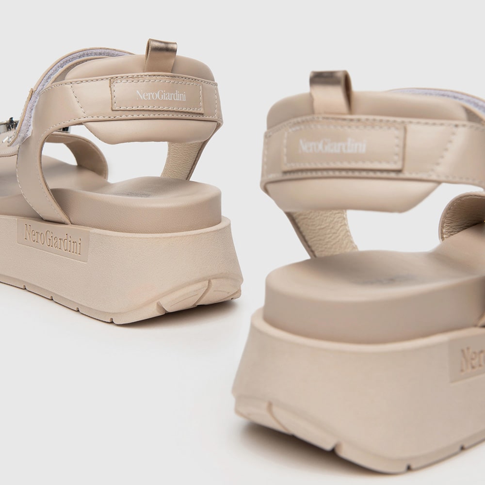 Sandali donna NeroGiardini in pelle scamosciata di colore beige con cinturino alla caviglia e sottopiede imbottito. Sulla fascia elementi decorativi di strass, fondo platform in gomma, tacco 3,5 cm. Sandalo dal design essenziale comodo da indossare tutto il giorno. MADE IN ITALY