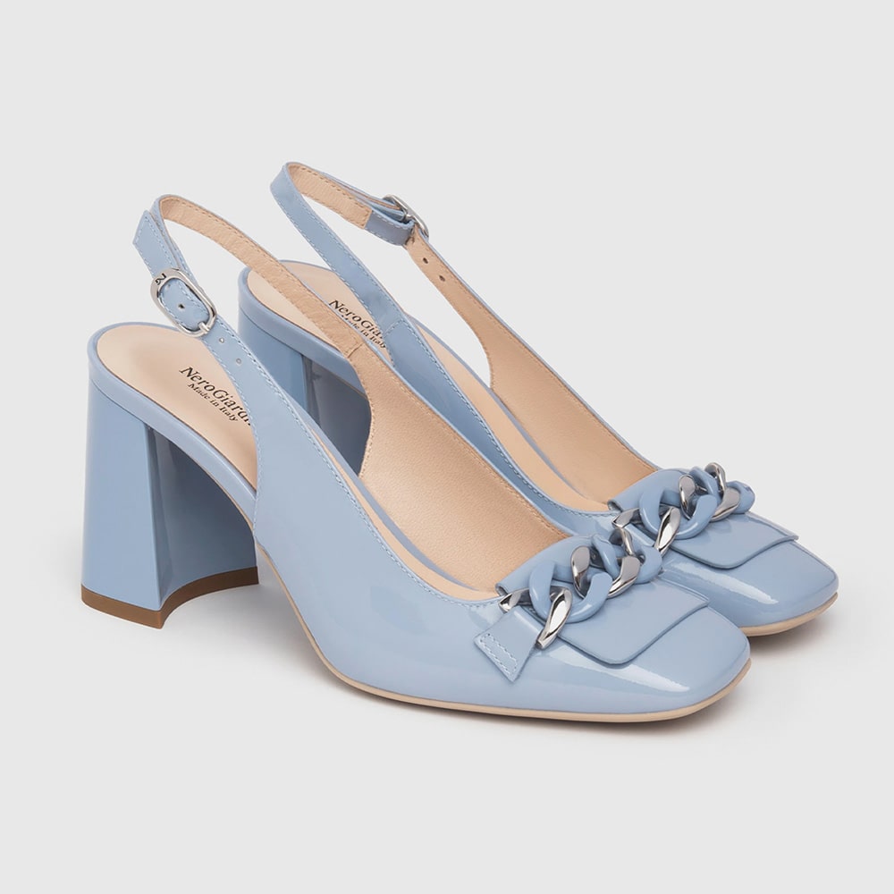 Décolleté slingback donna NeroGiardini in vernice colore avorio con cinturino alla caviglia, accessorio bicolore, tacco basso a blocco 3 cm e fondo in gomma. Calzatura raffinata e comoda da indossare, perfetta per le tue occasioni speciali. MADE IN ITALY