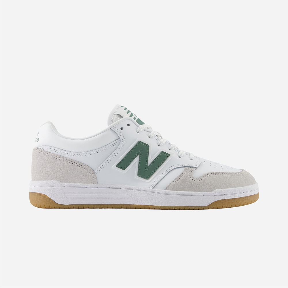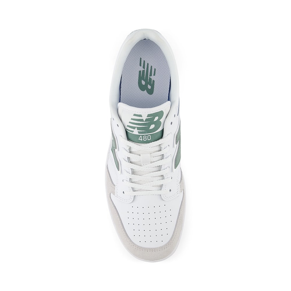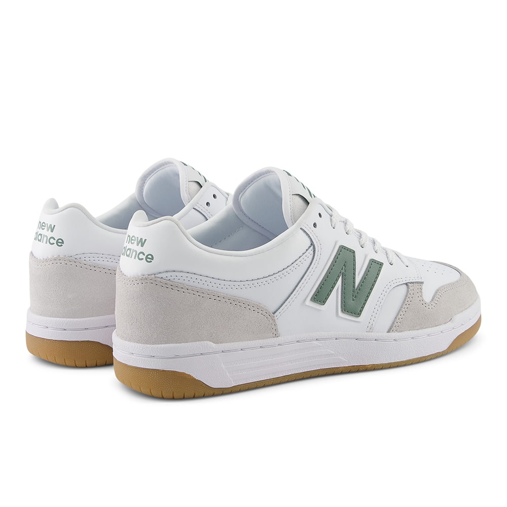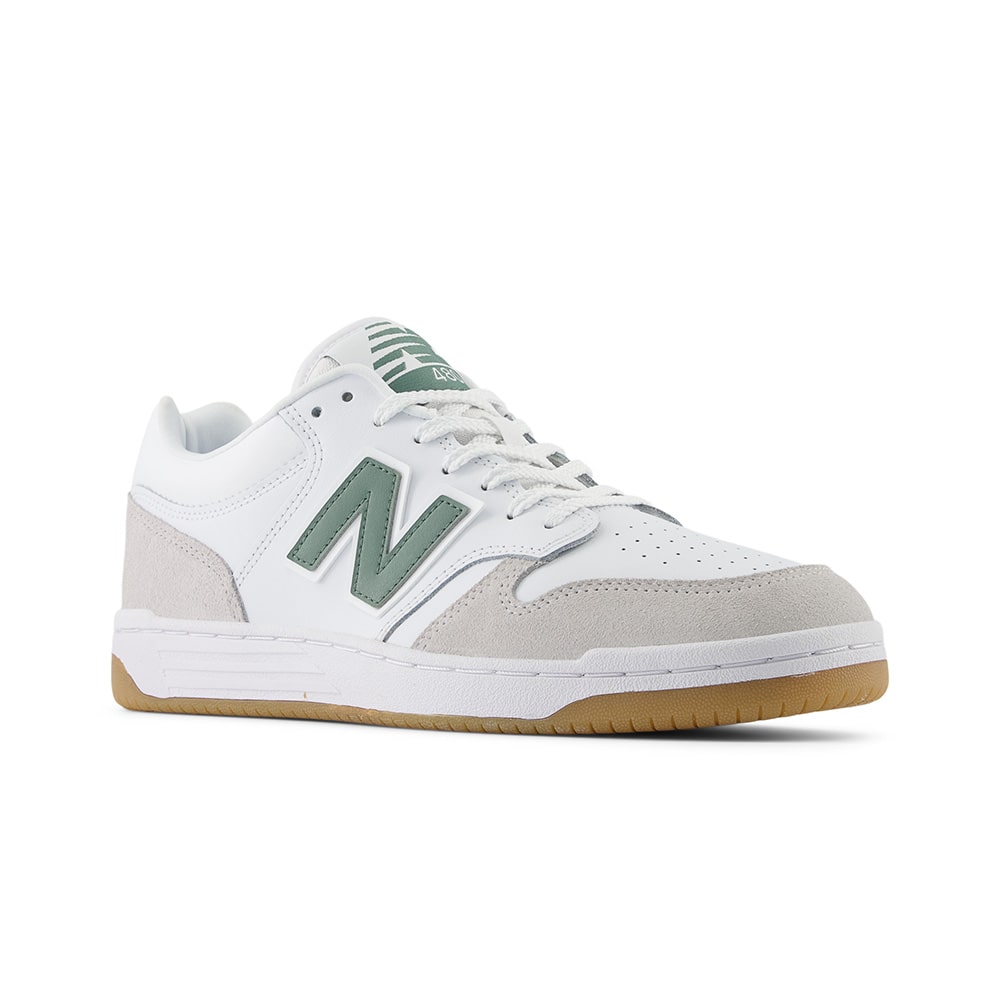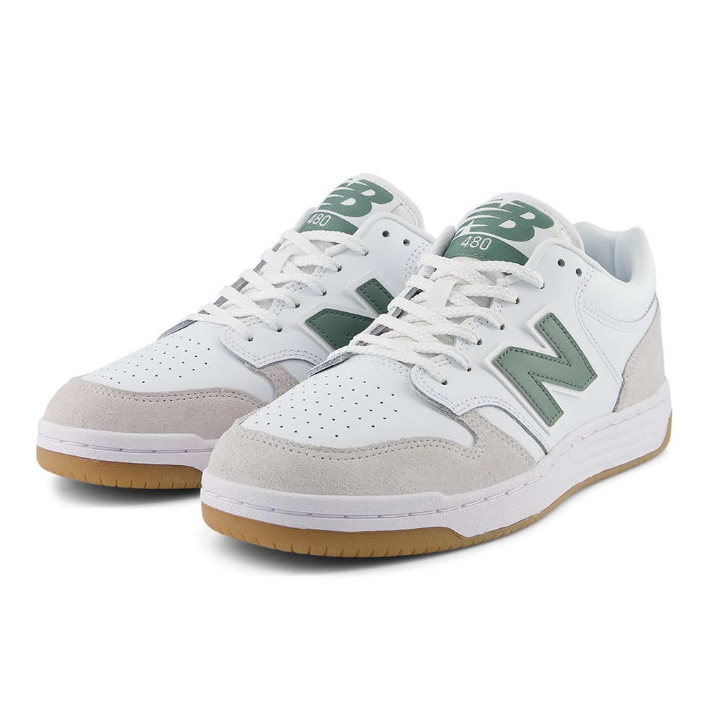 Sneakers uomo New Balance BB480LNG in pelle di colore bianco e riporti verdi, punta traforata, fondo gomma. Design classico dalle linee semplici e pulite, comodissime e leggere da indossare tutto il giorno.