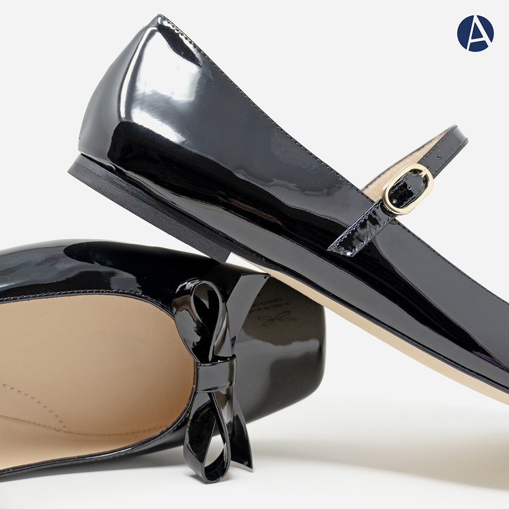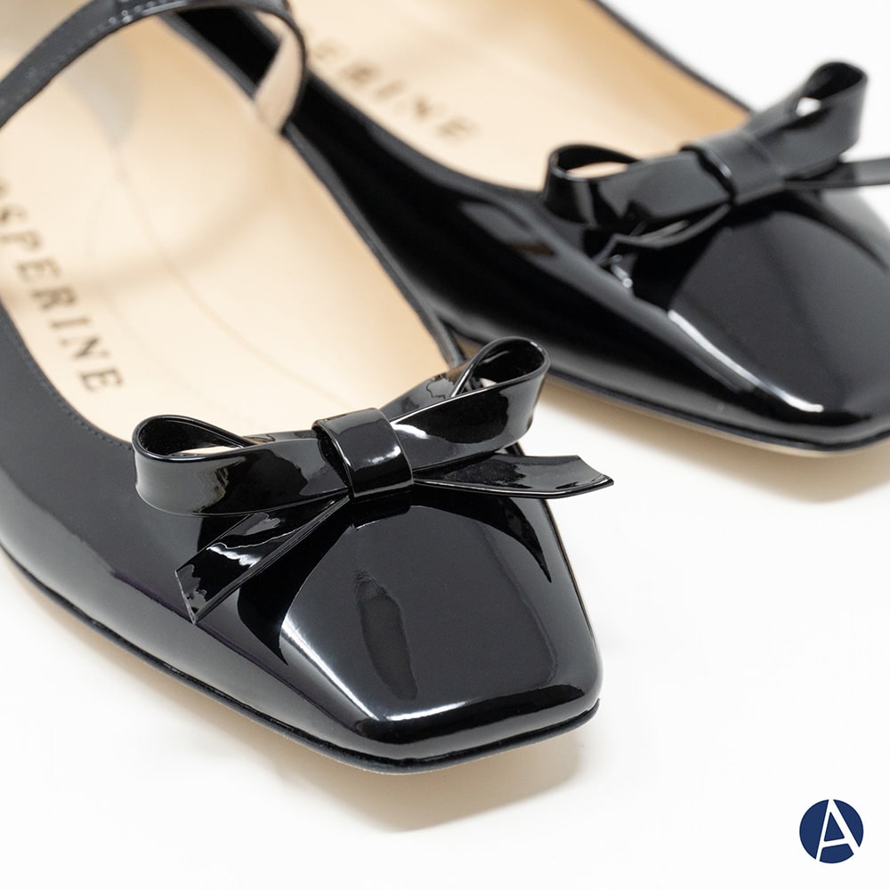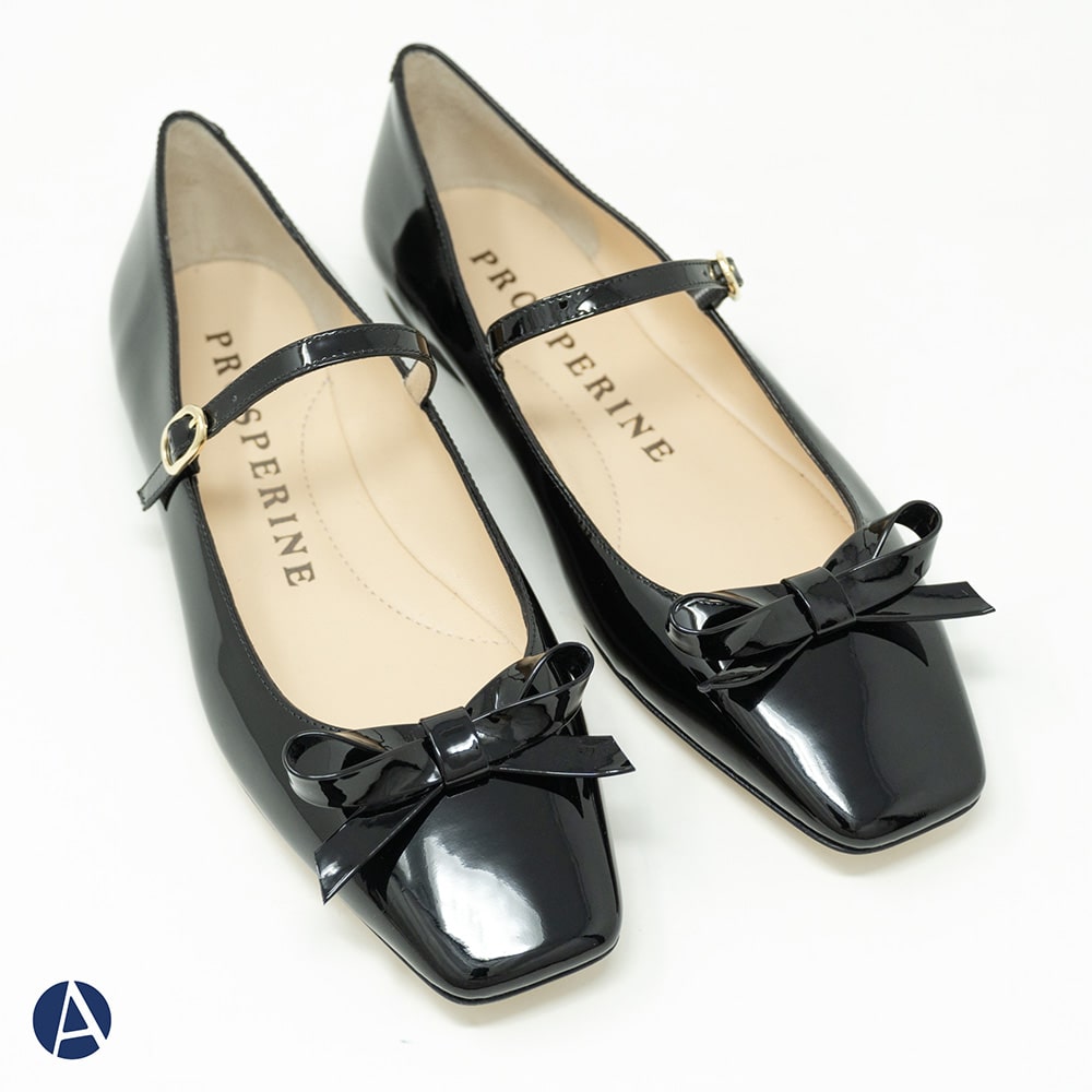 Ballerina donna Prosperine in vernice nera, punta stondata con fiocco, cinturino con fibbia oro, tacco basso da 1,5 cm. Calzature artigianali donna di alta qualità interamente MADE IN ITALY. Perfette per rendere i tuoi outfit unici e sofisticati!