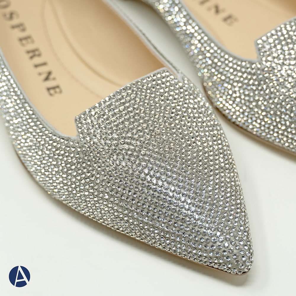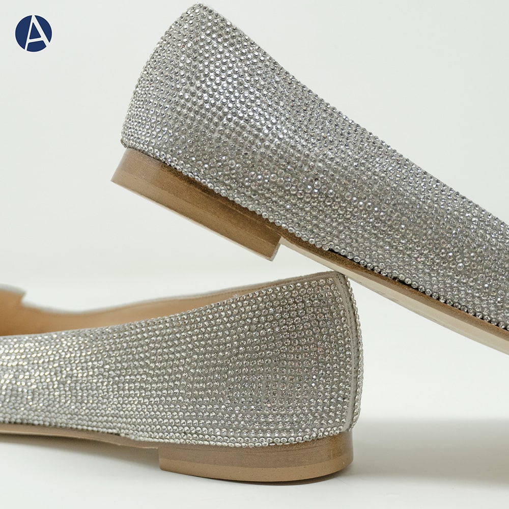 Prosperine ballerina crystal donna rivestita con micro cristalli argento, a punta, tacco basso 1,5 cm, fondo cuoio. Calzature artigianali donna di alta qualità interamente MADE IN ITALY. Perfette per rendere i tuoi outfit unici e sofisticati!