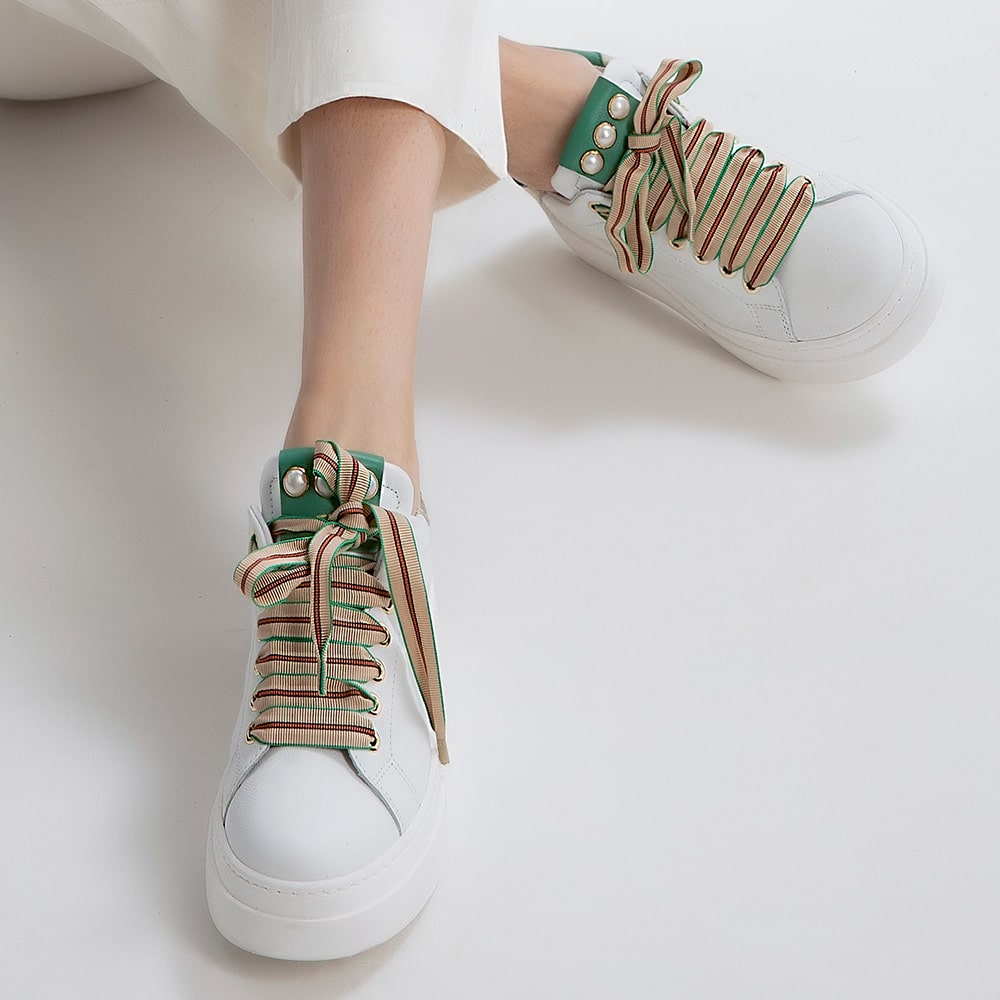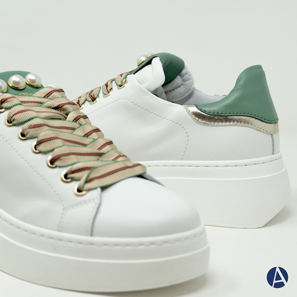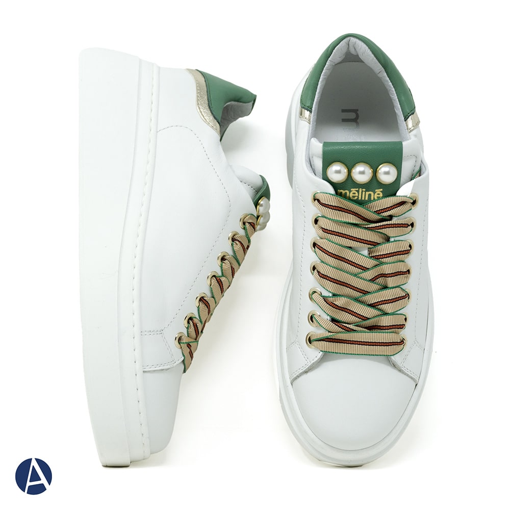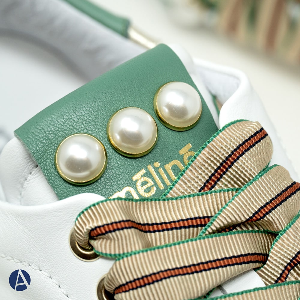 Sneakers donna MÉLINÉ in pelle di colore bianco con decorazioni di perle sulla linguetta, riporti sul tallone verdi e platino. Laccio particolare a contrasto. Calzatura perfetta per i tuoi outfit originali.