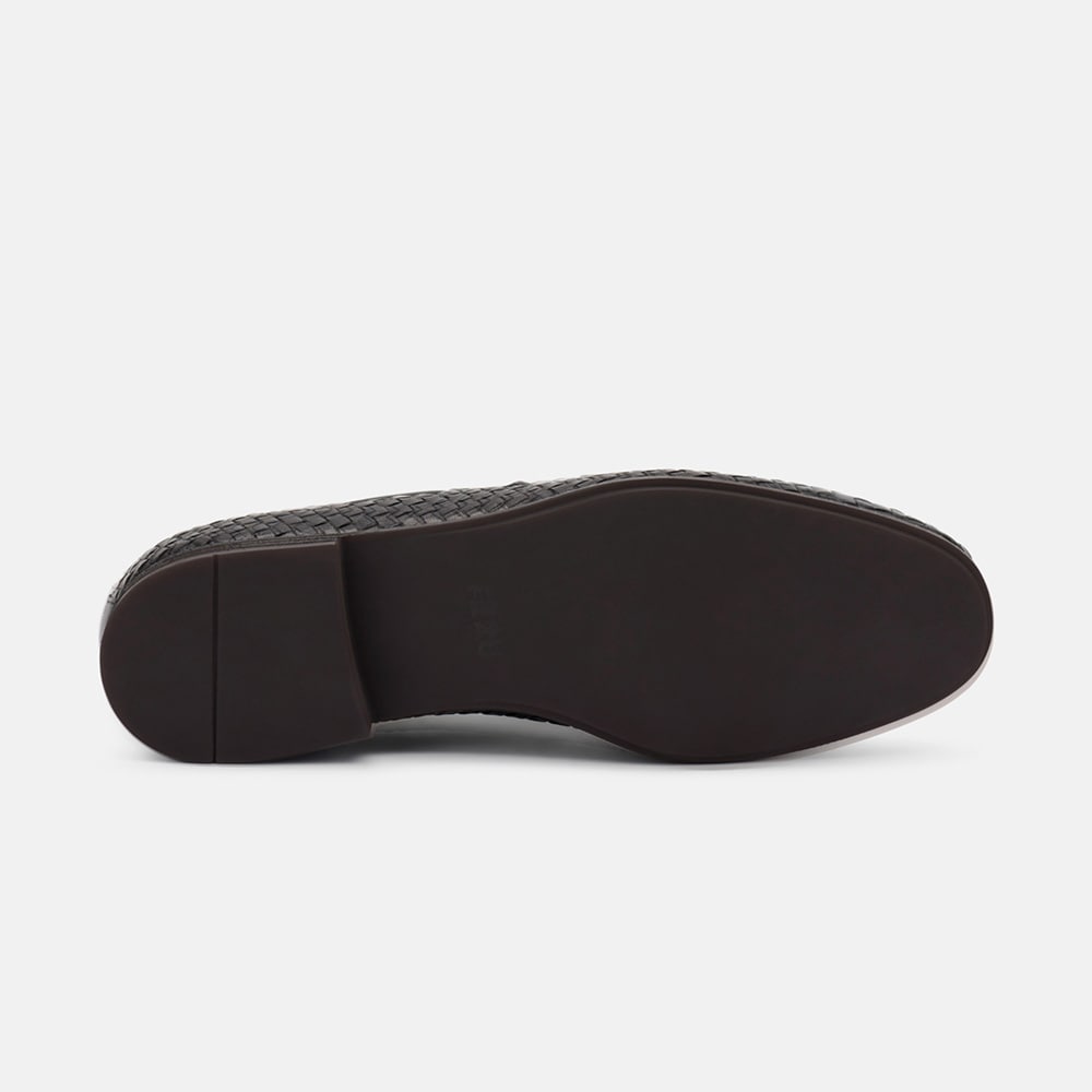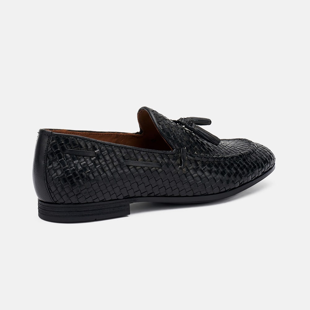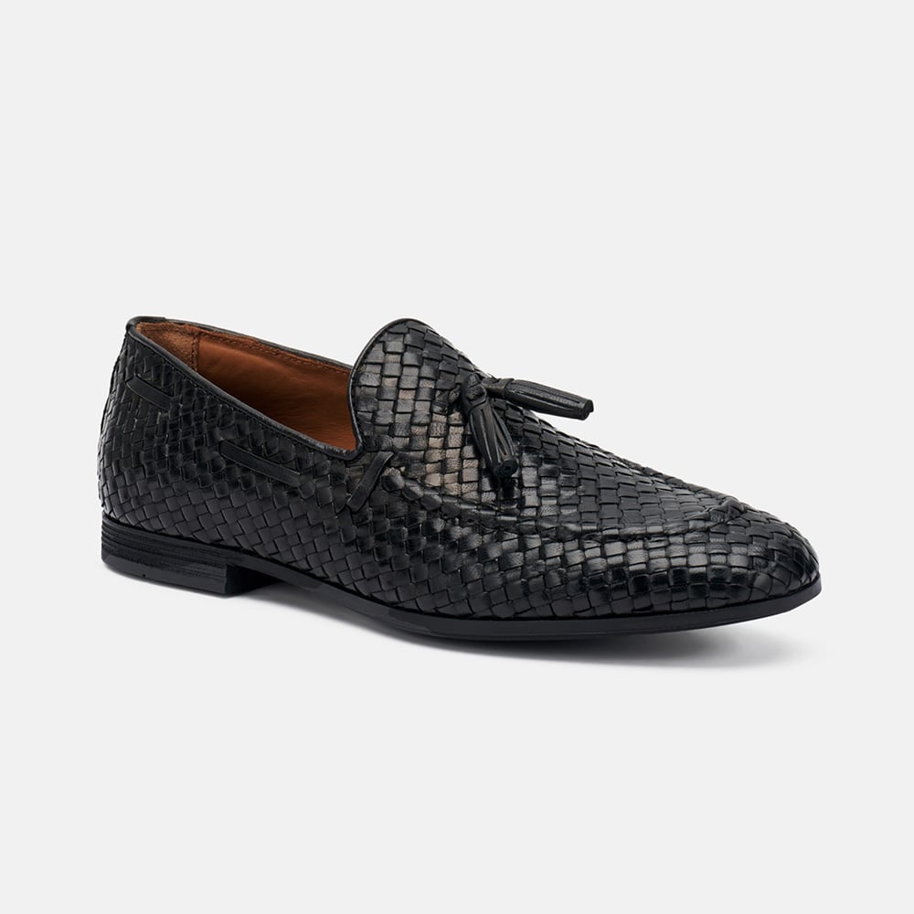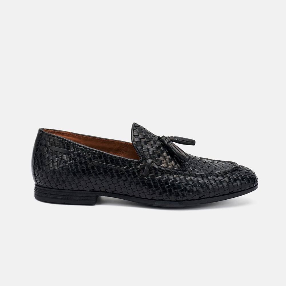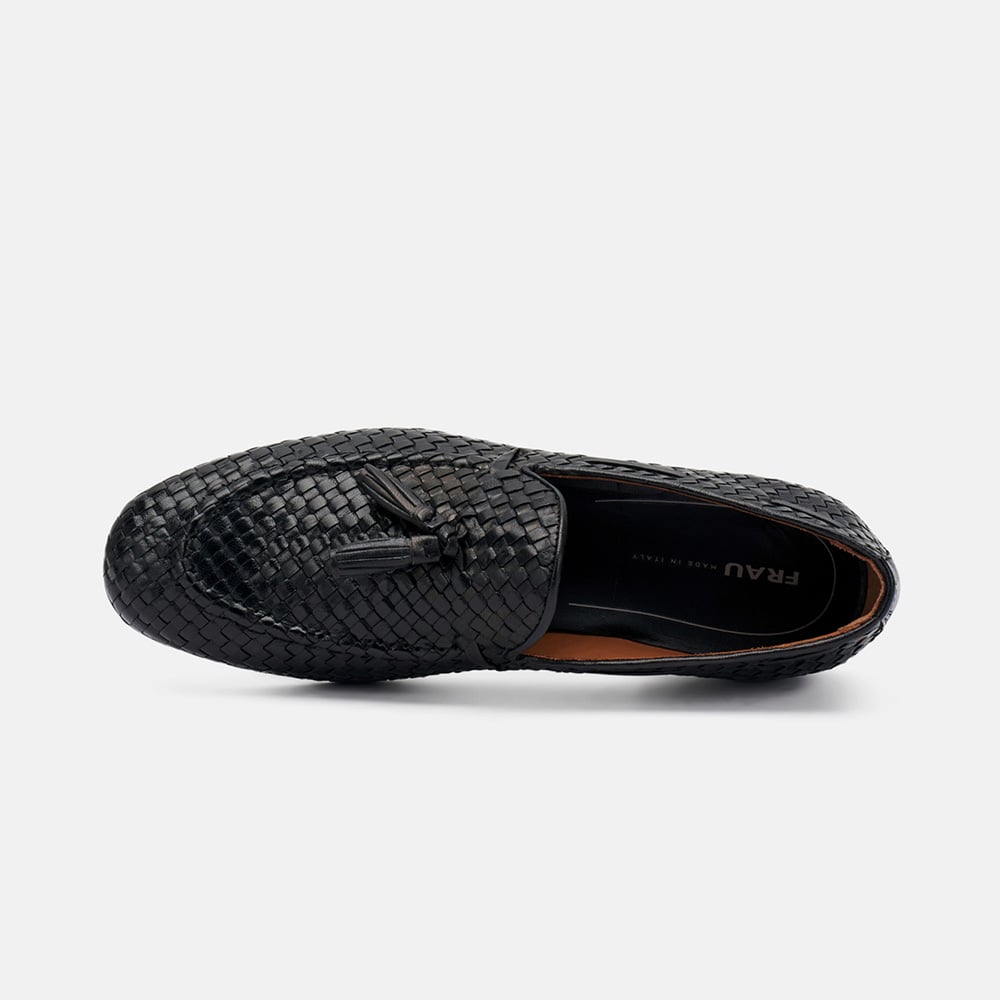 Mocassino uomo Frau in pelle intrecciata di colore nero con nappine e fondo cuoio. Perfetti per look formale o per i tuoi week end estivi. Eccellente qualità artigianale MADE IN ITALY.
